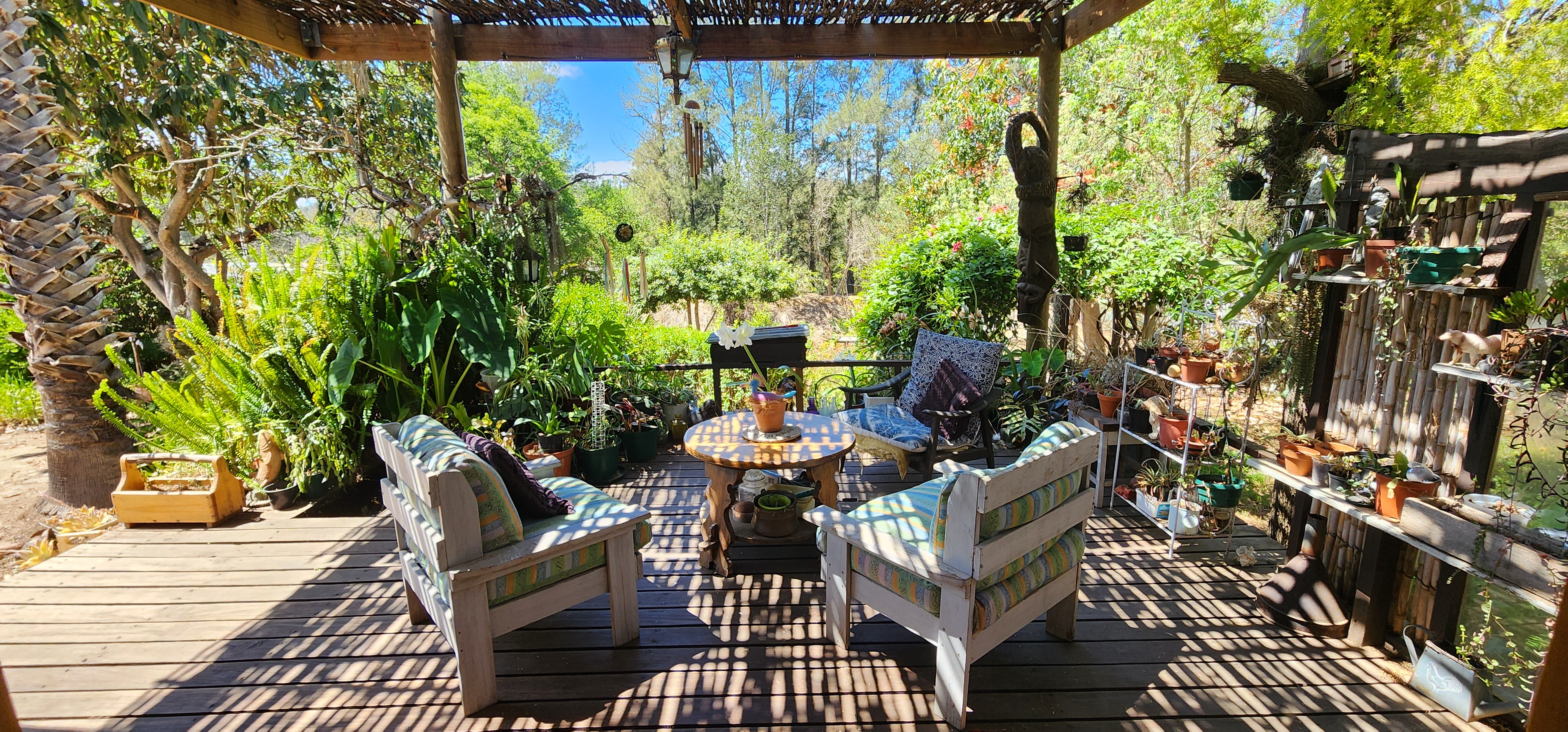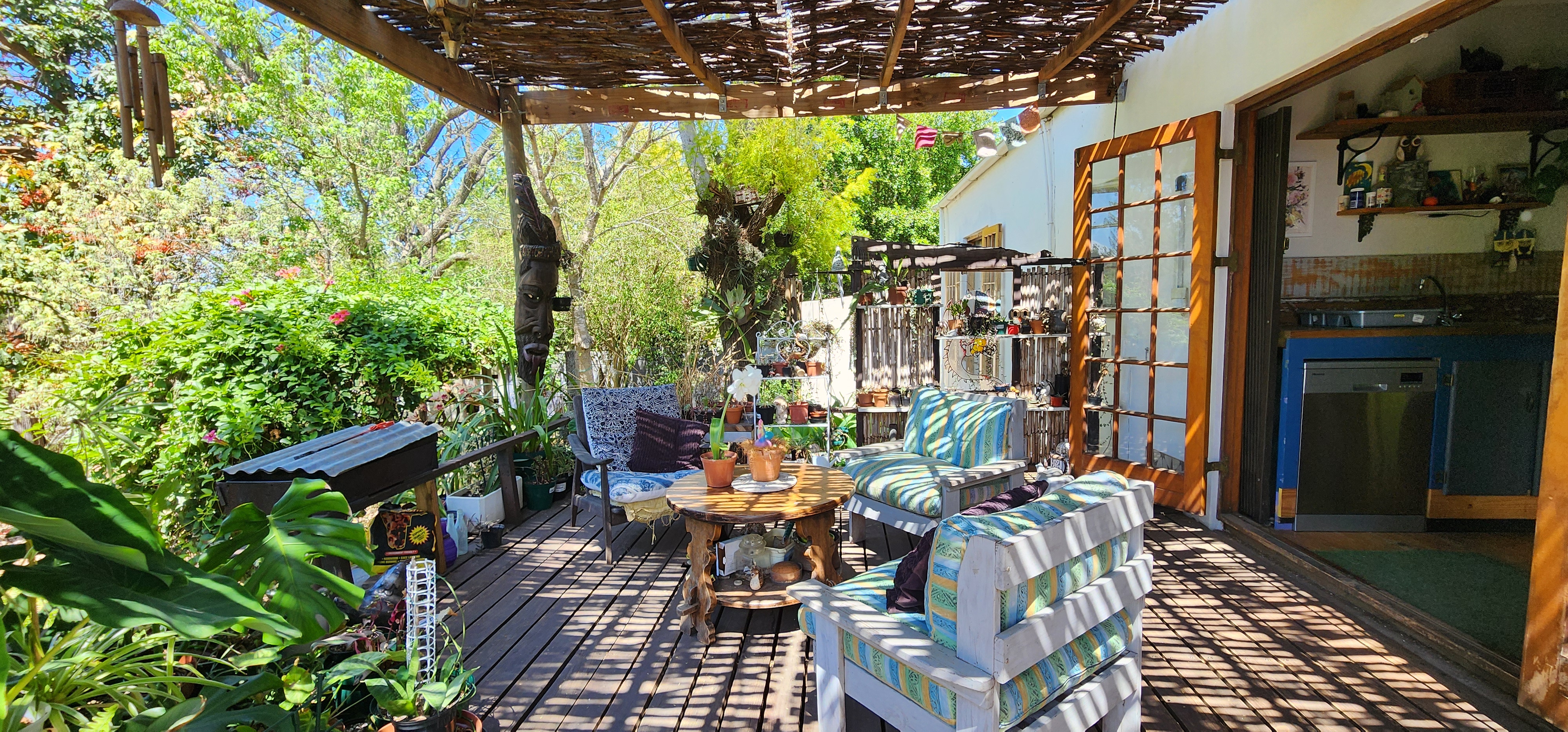 Outdoor living is a highlight, with a private deck overlooking the tranquil garden — an inviting space to unwind, entertain, or enjoy quiet mornings surrounded by mature trees and greenery.
