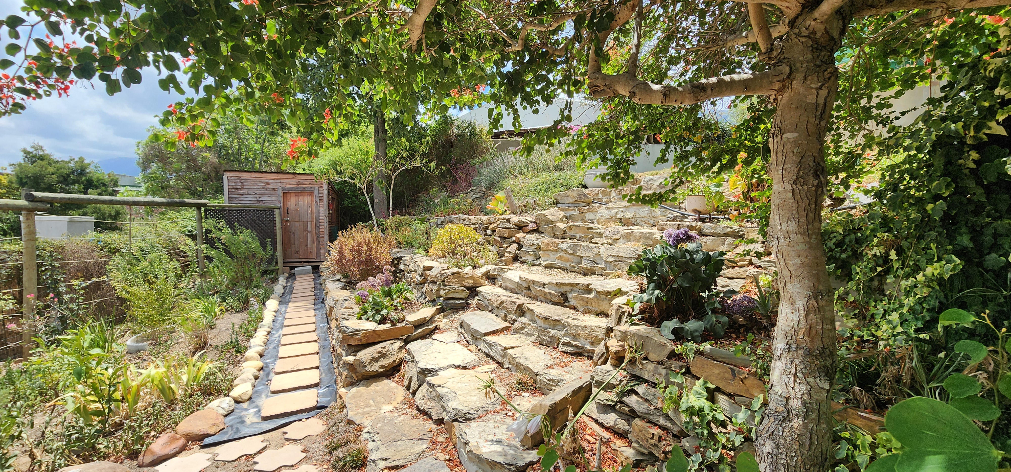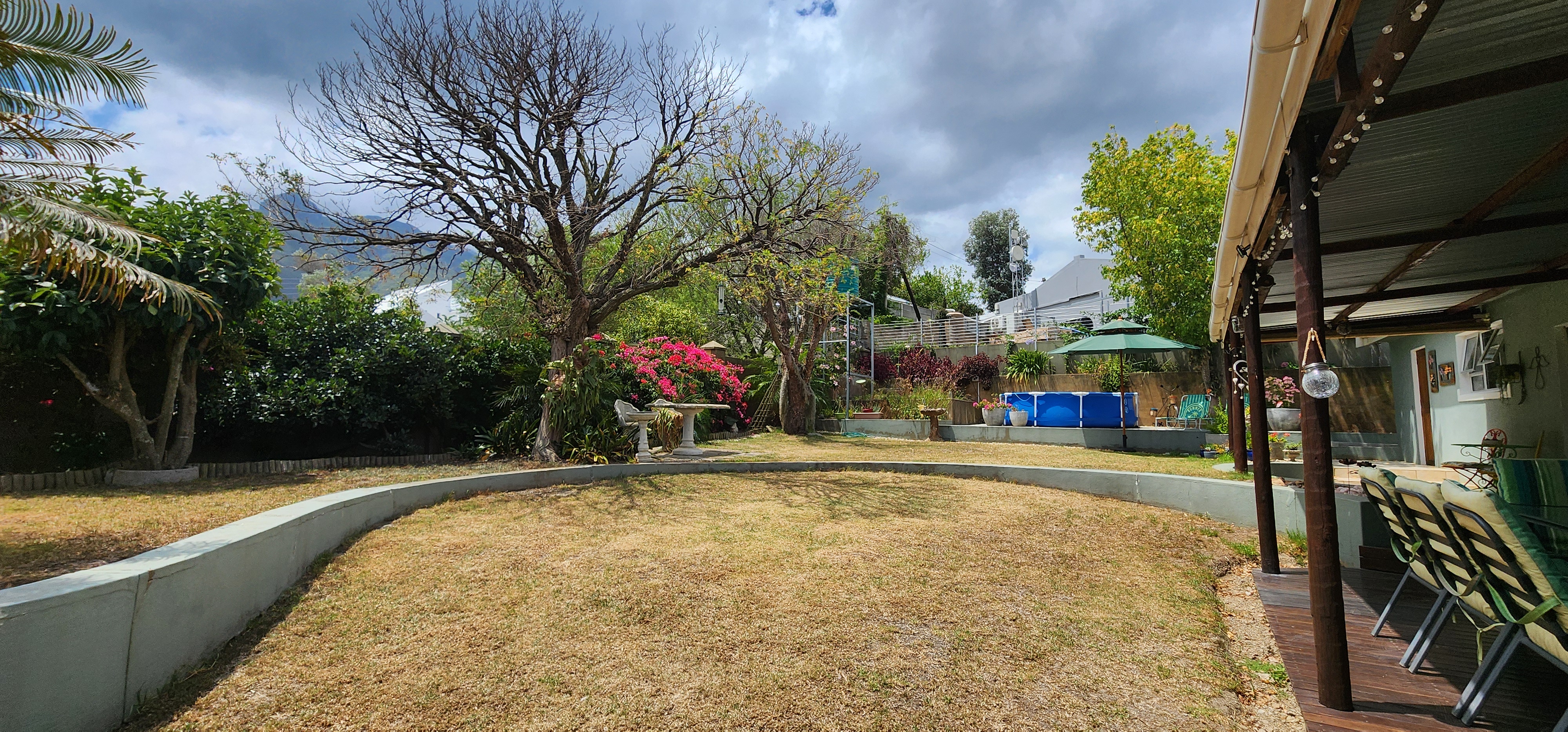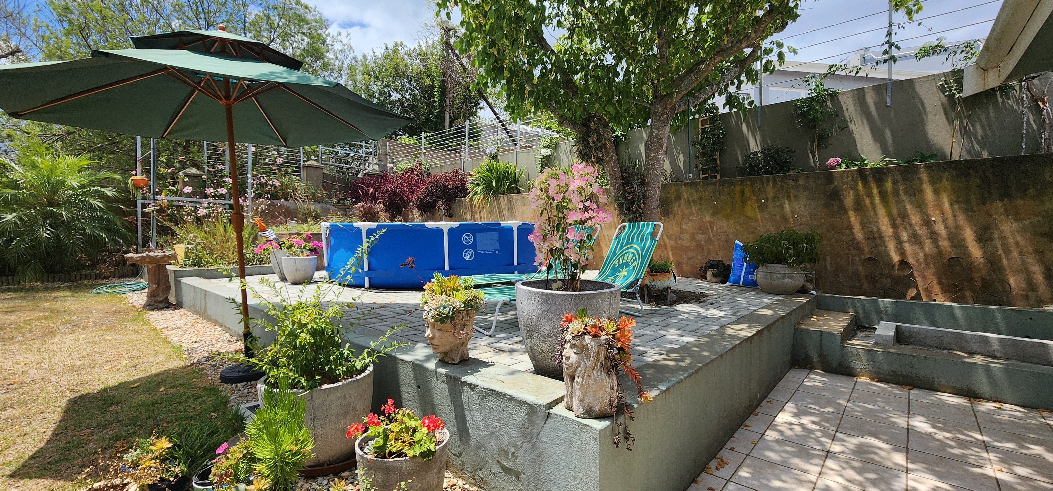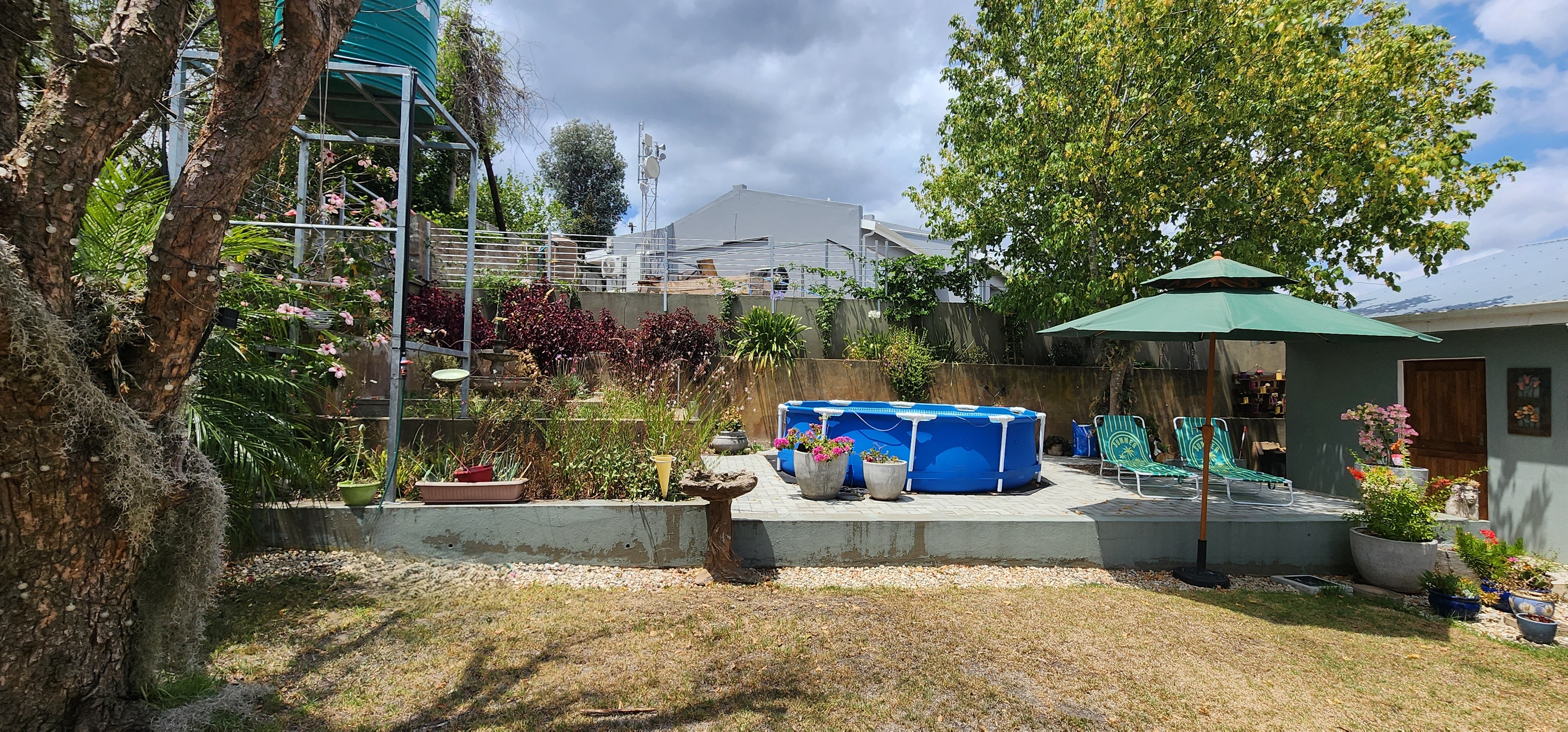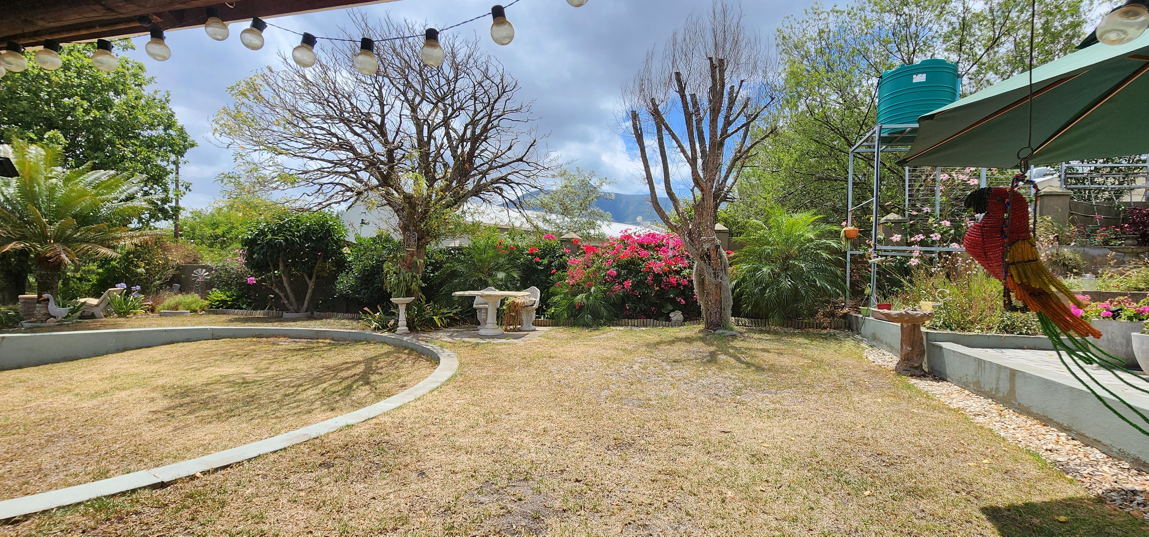 The garden is well established and terraced, offering wonderful outdoor living potential. Due to recent Western Cape drought conditions and water restrictions, the garden is not currently showing its full potential — however, Swellendam benefits from strong water security, allowing future owners to fully restore and enhance the garden to its former beauty.