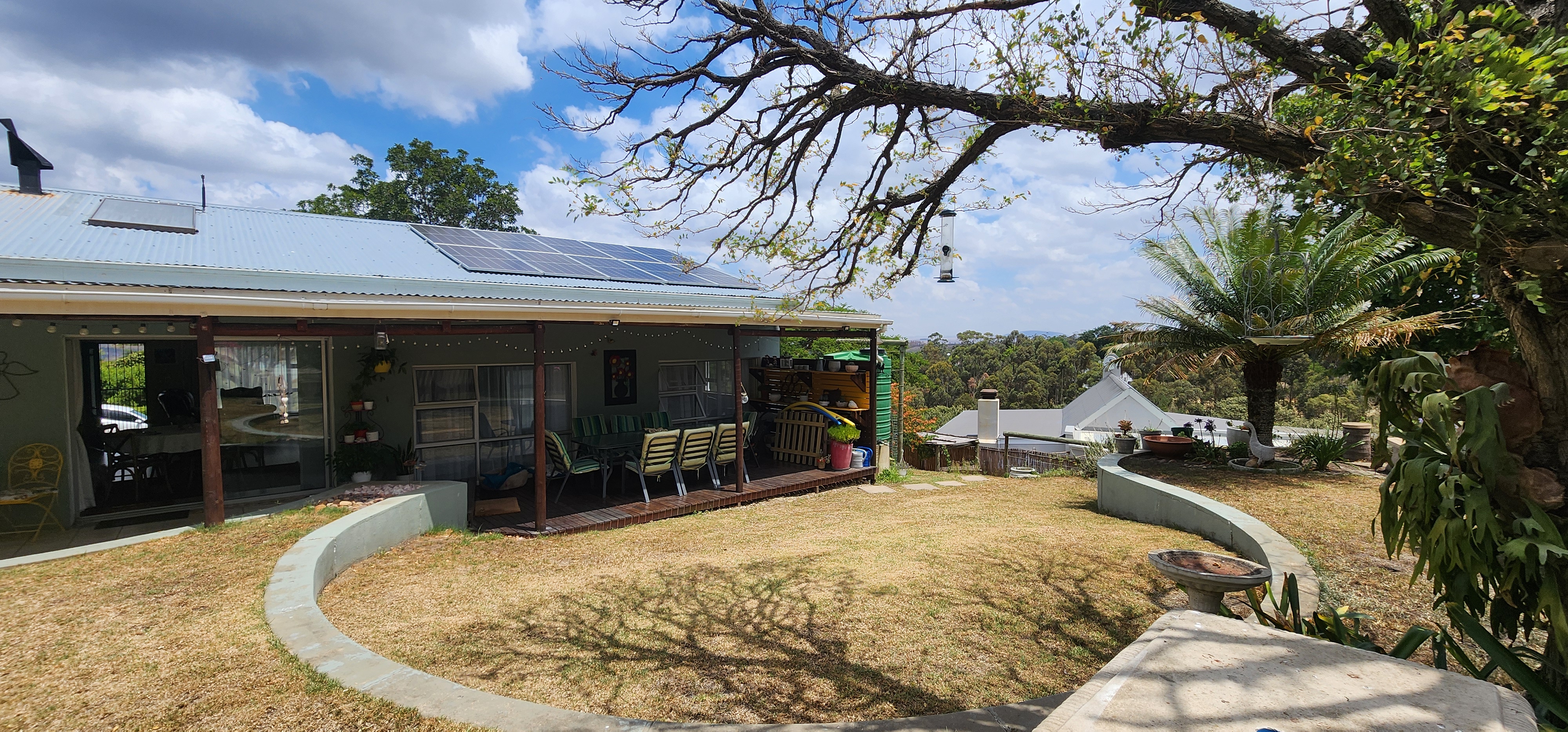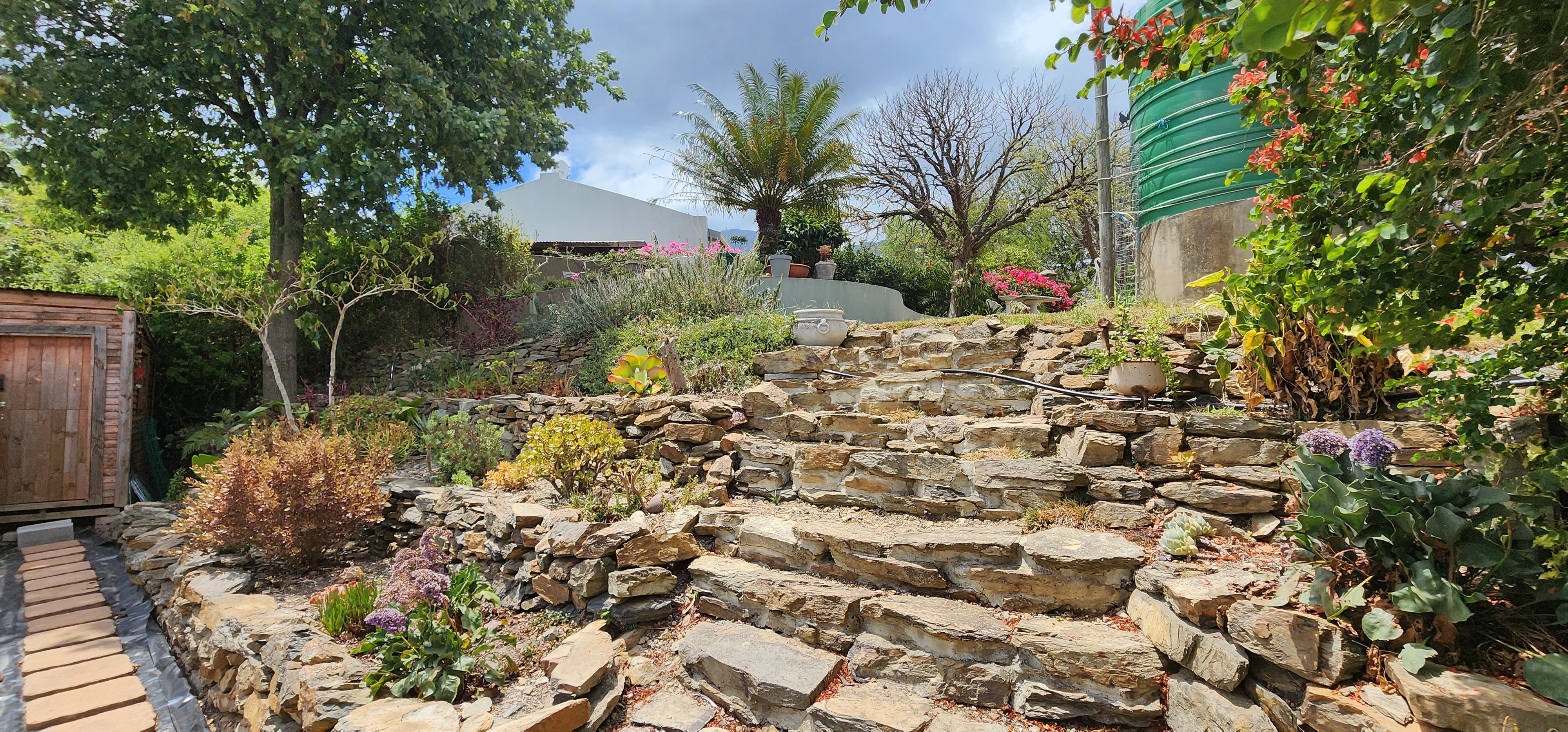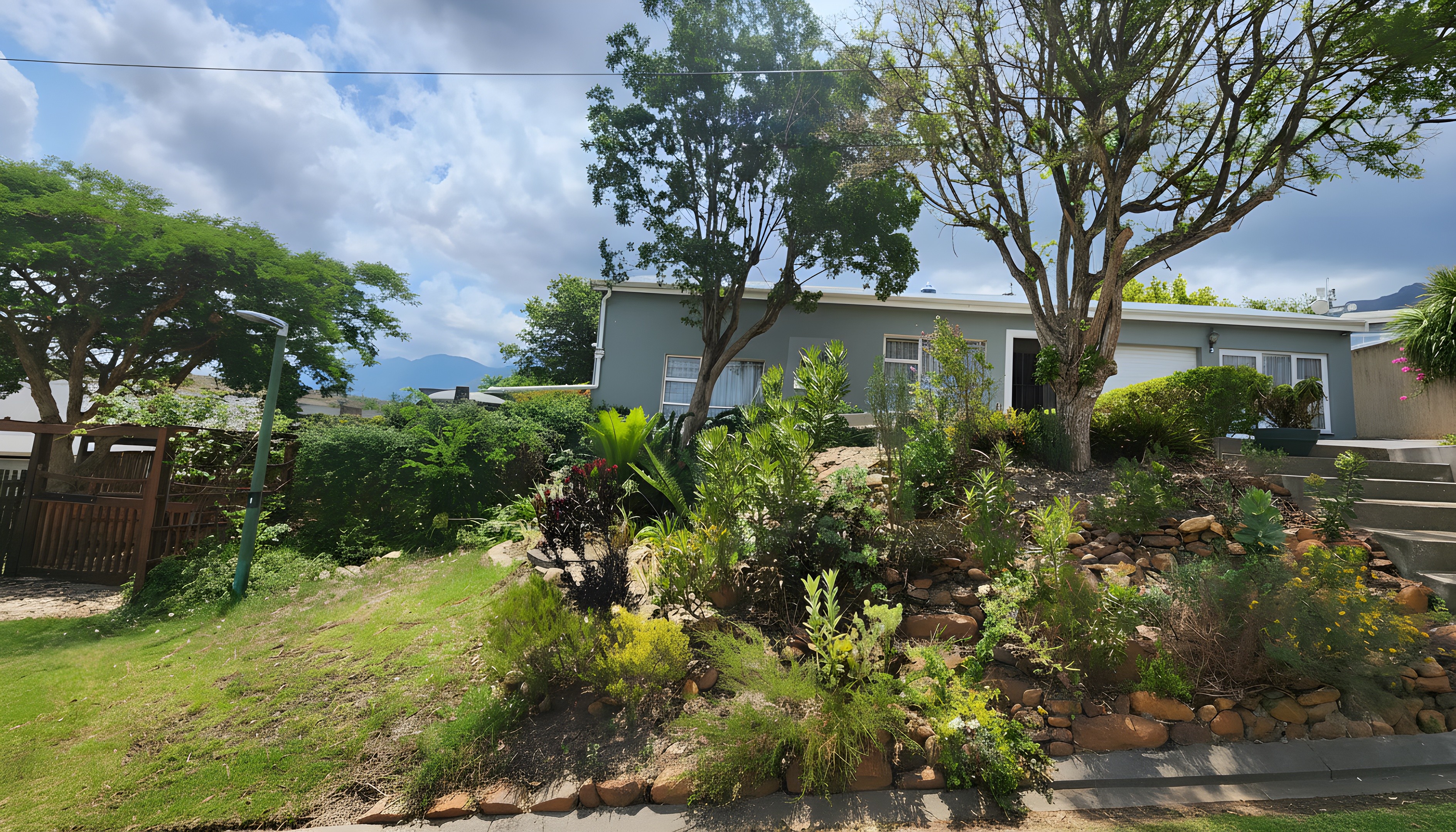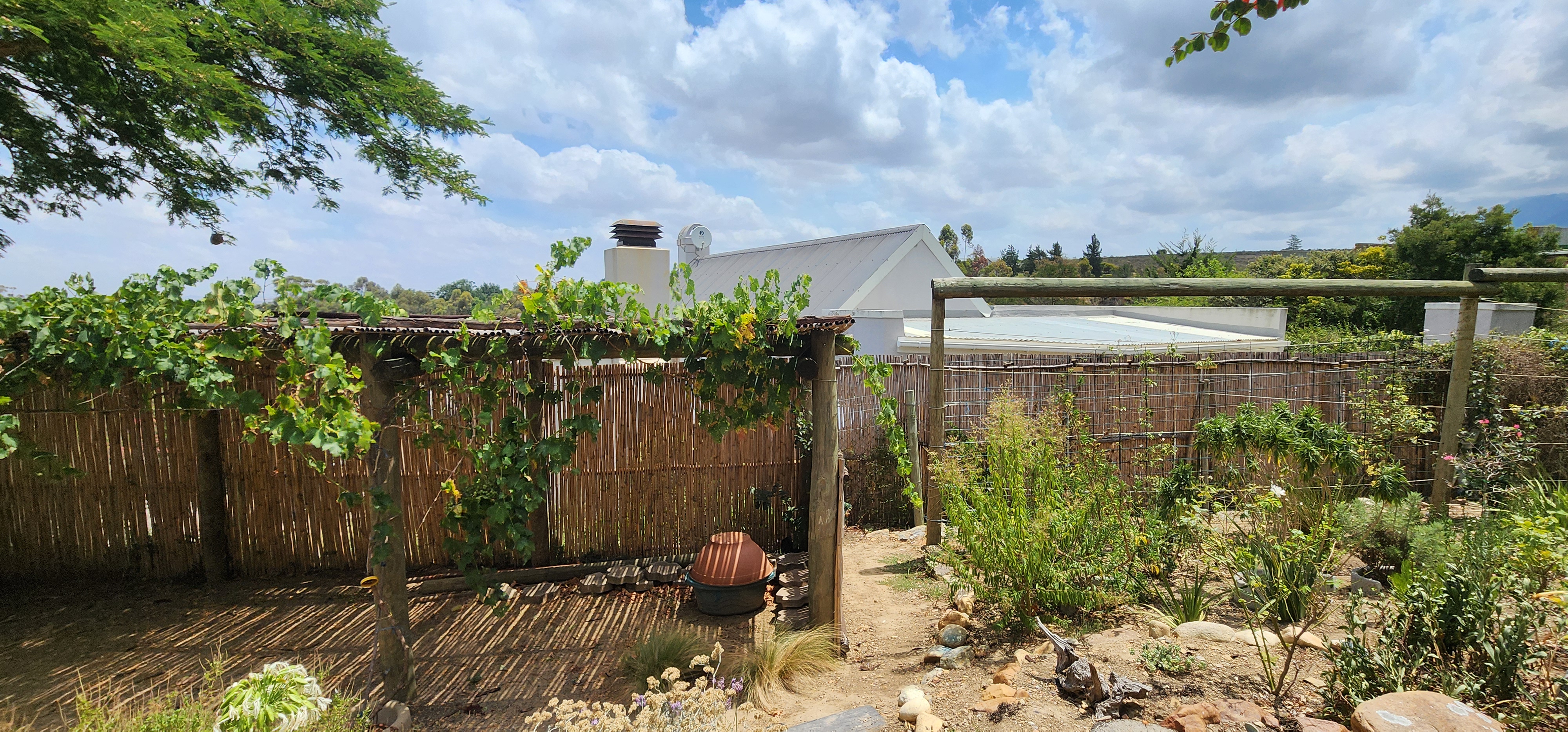 The garden is well established and terraced, offering wonderful outdoor living potential. Due to recent Western Cape drought conditions and water restrictions, the garden is not currently showing its full potential — however, Swellendam benefits from strong water security, allowing future owners to fully restore and enhance the garden to its former beauty.
