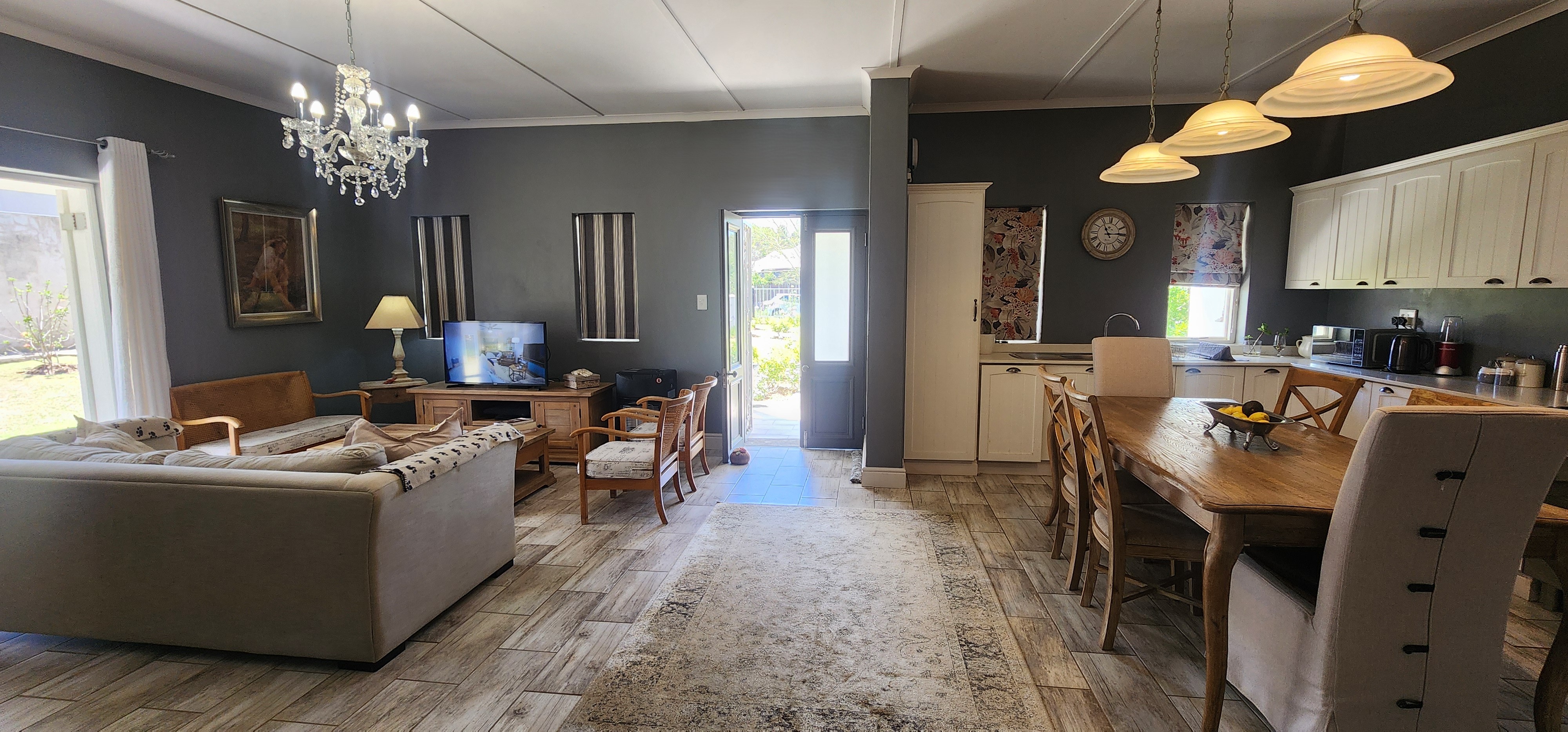 The home features one spacious, light-filled bedroom, two bathrooms, and an open-plan kitchen, dining area, and lounge that flow effortlessly together. Sliding doors lead from the lounge onto a covered patio, an ideal space for relaxed meals, sundowners, or entertaining family and friends while enjoying the surrounding views.