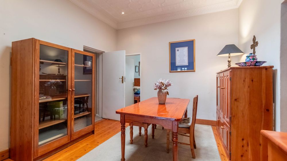 Beautiful pressed ceilings and original wooden floorboards add warmth and elegance, while the well-kept garden creates a peaceful outdoor retreat. The property also includes a swimming pool, staff accommodation, a single garage, and additional parking space. Security is excellent with an alarm system, electric fencing, and outdoor beams. This home is full of charm and offers generous space in a secure, family-friendly setting.