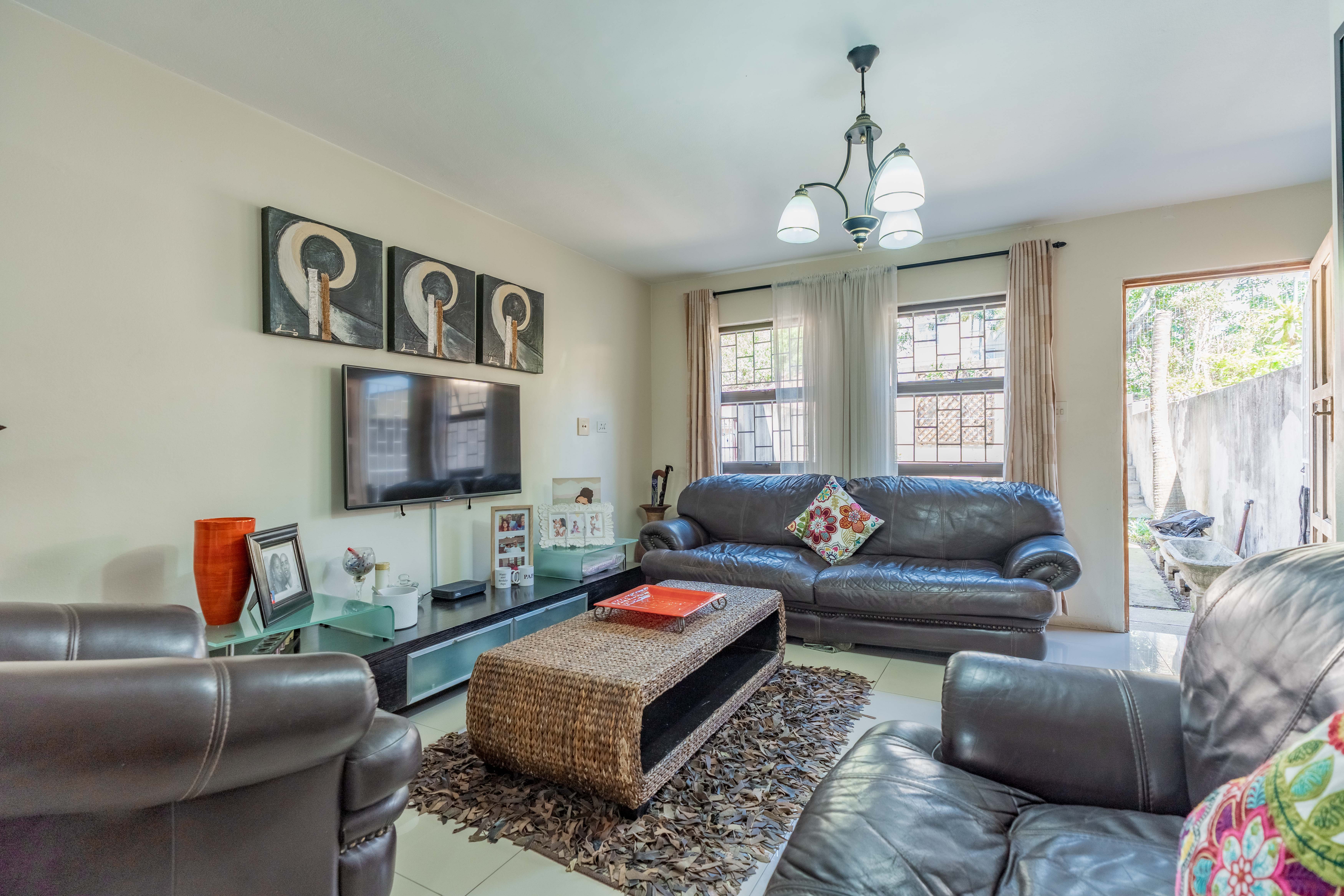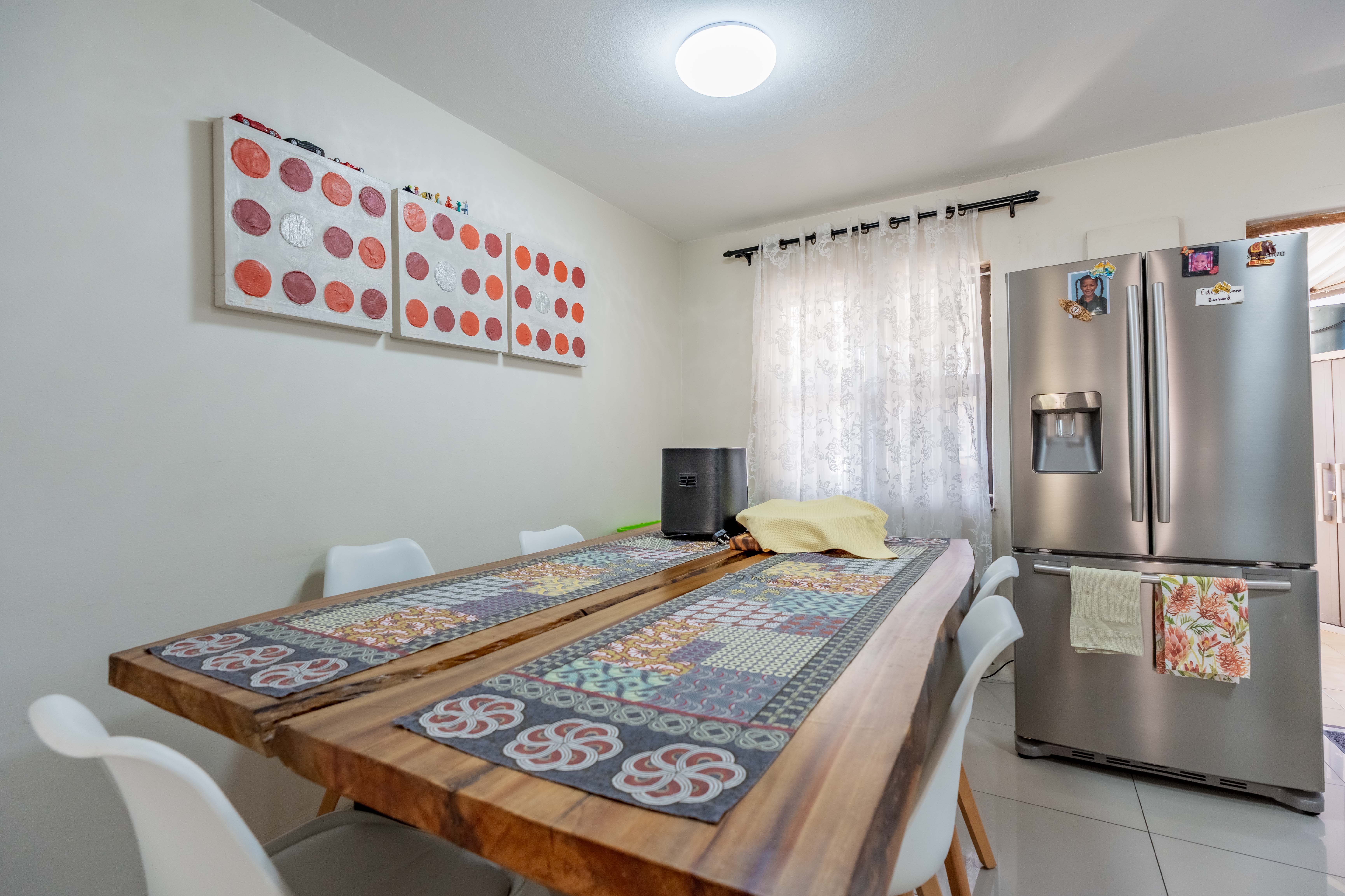 Enter through an electric gate into a neatly covered, spacious courtyard that doubles as a laundry room with ample storage, leading to an open-plan interior layout. The modern kitchen boasts quartz countertops, a touch-control hob, oven, and extractor fan, flowing into a spacious dining area perfect for family gatherings. The light, bright lounge opens onto a back patio, offering a versatile space for braais, sundowners, family game nights, or a child-friendly play area where you can watch the kids from the comfort of your home.