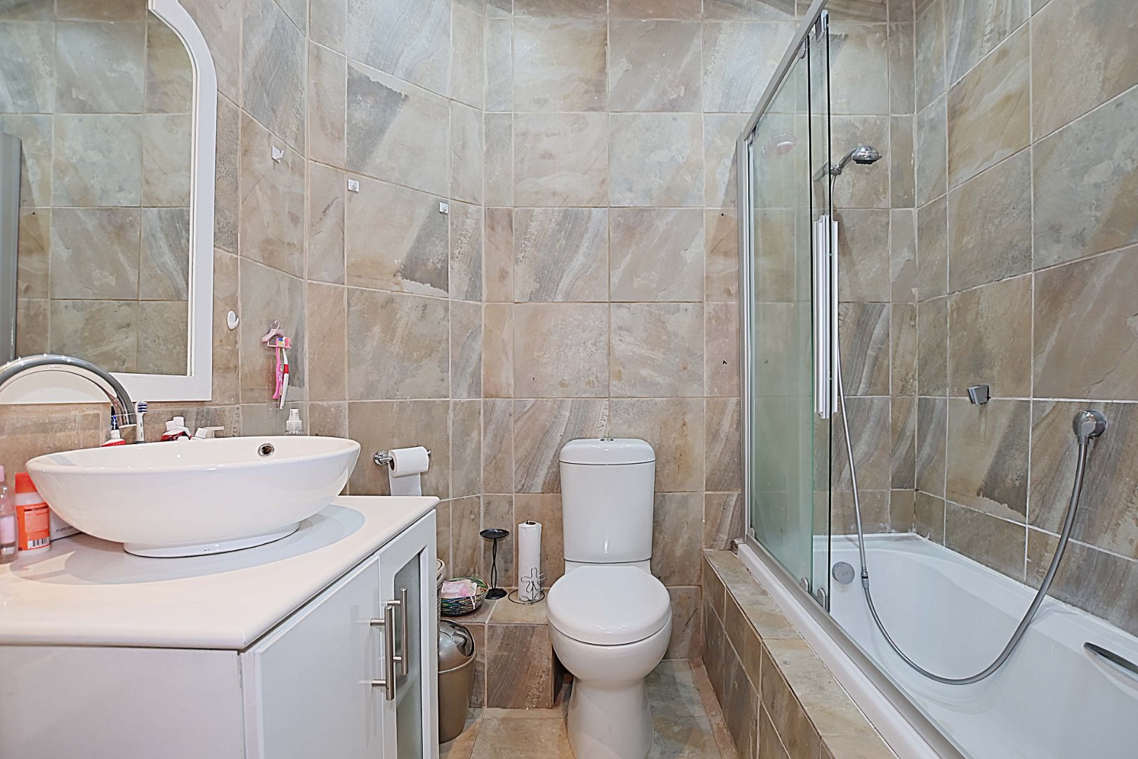 The family bathroom has a shower with sliding doors over the bath.