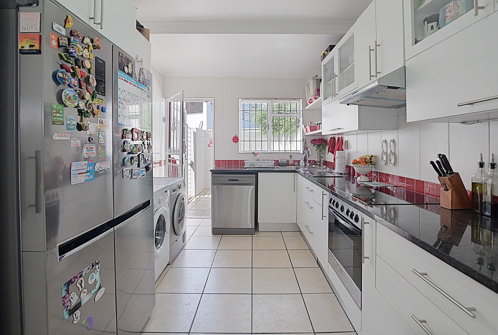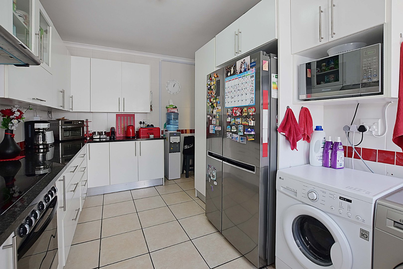 The large, well-designed kitchen has ample cupboards, a built-in hob and oven, as well as space for the double-door fridge.