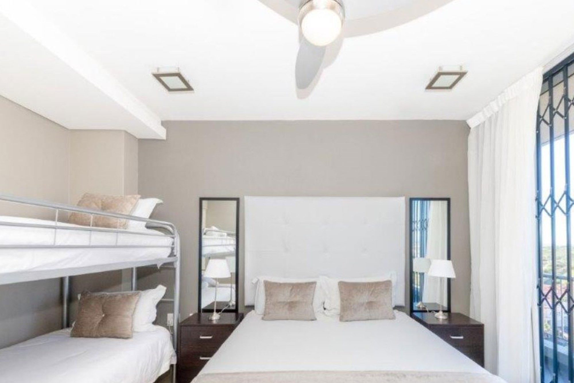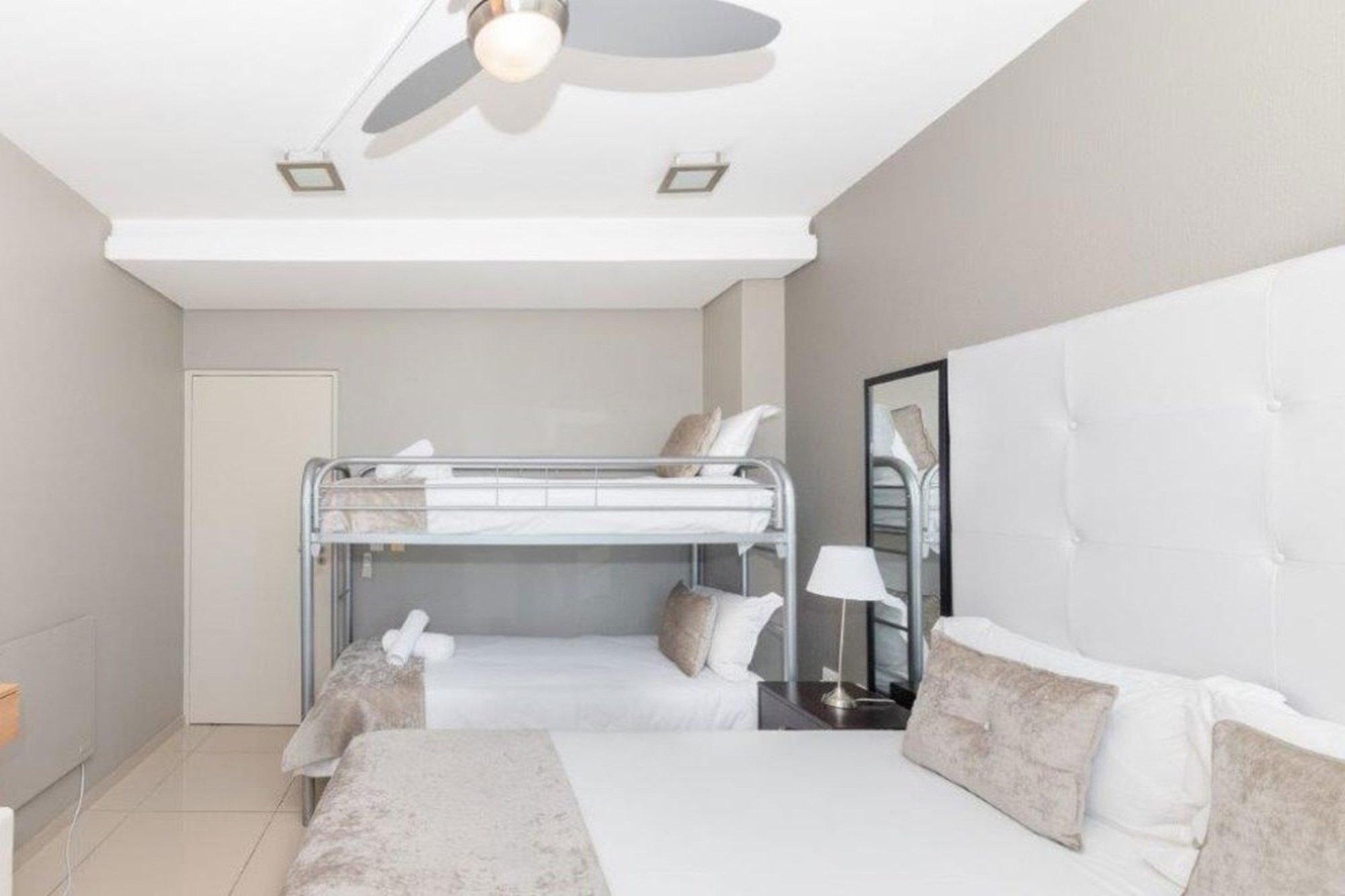 Perched on the 10th floor, this stunning 110m2 apartment offers breathtaking views of Table Mountain and the ocean. Featuring two spacious bedrooms, each fitted with a queen-size bed, a bunk bed (accommodating four people per room), ceiling fans, built-in cupboards, and a dressing table with a mirror, this apartment is perfect for comfort and style.