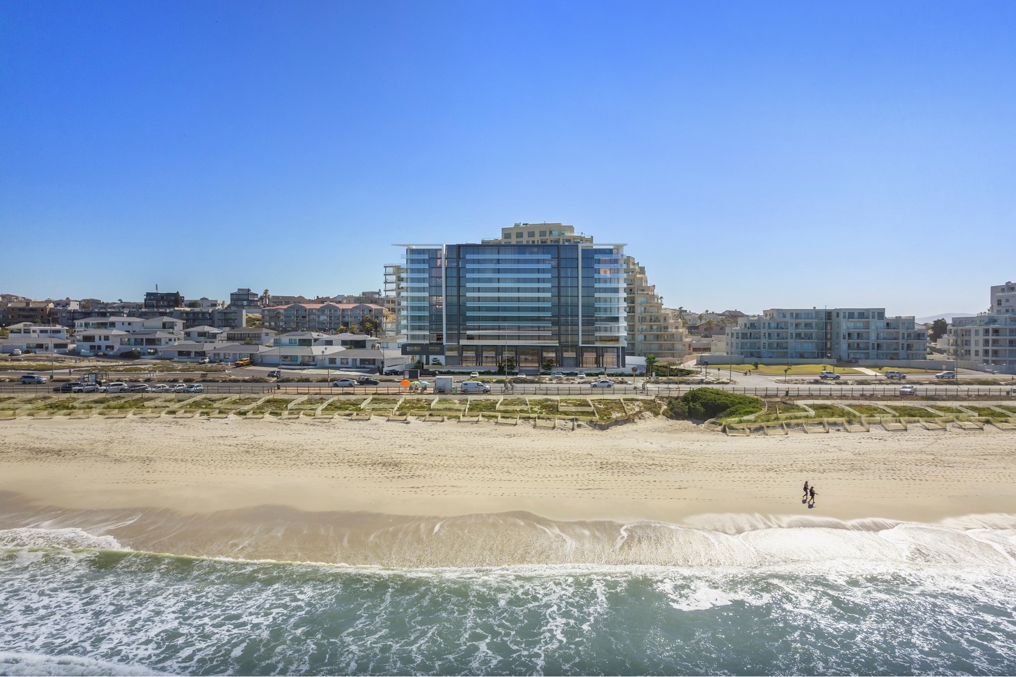 A private balcony extends the living space, offering breathtaking views of Robben Island, Table Mountain, Bloubergstrand Beach, and direct views down to Sunset Beach, making this a truly captivating coastal retreat.