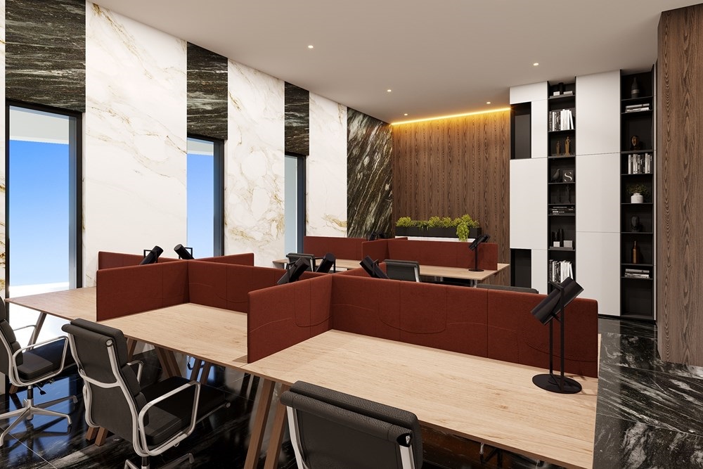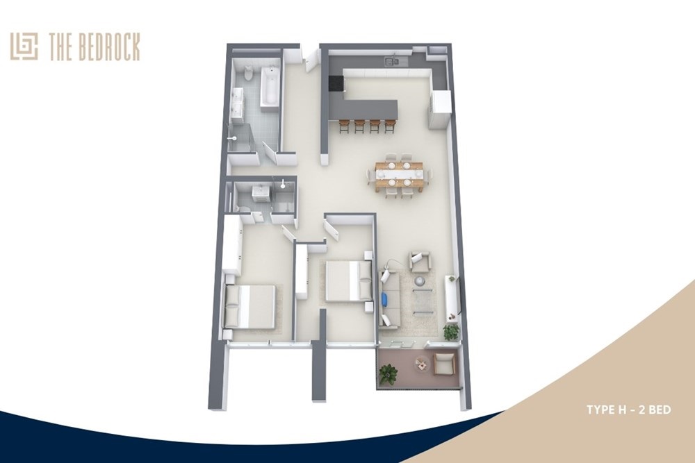 Designed for modern living with a luxurious touch, the Type H apartment offers a spacious open-plan layout that seamlessly integrates the living, dining, and kitchen areas. The kitchen features an elegant L-shaped design with a breakfast bar, making it both stylish and functional for entertaining or casual dining.
