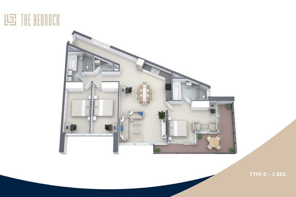 The Type D 3-bedroom apartment offers a spacious and thoughtfully designed layout for modern living. The open-plan living and dining area flows seamlessly into a sleek, contemporary kitchen, making it perfect for entertaining. Three generously sized bedrooms include a master suite with an en-suite bathroom, while an additional bathroom ensures convenience for family or guests.