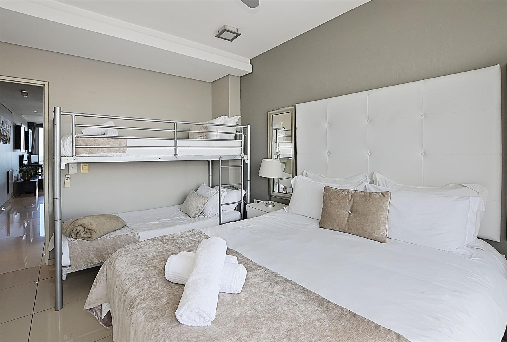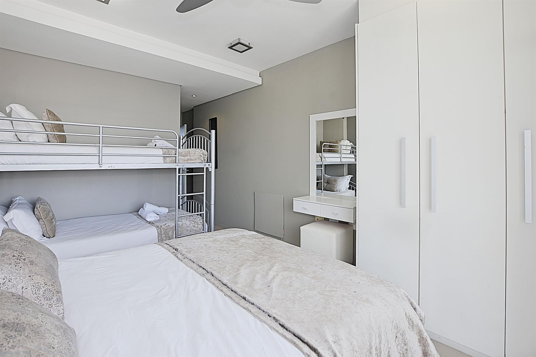 Both bedrooms are thoughtfully designed to ensure a restful night`s sleep. The master suite features a plush queen-sized bed and an ensuite bathroom, while the second bedroom offers a comfortable double bed along with twin bunk beds, ideal for children or additional guests. Each bathroom is fitted with modern amenities, ensuring convenience and privacy for all.