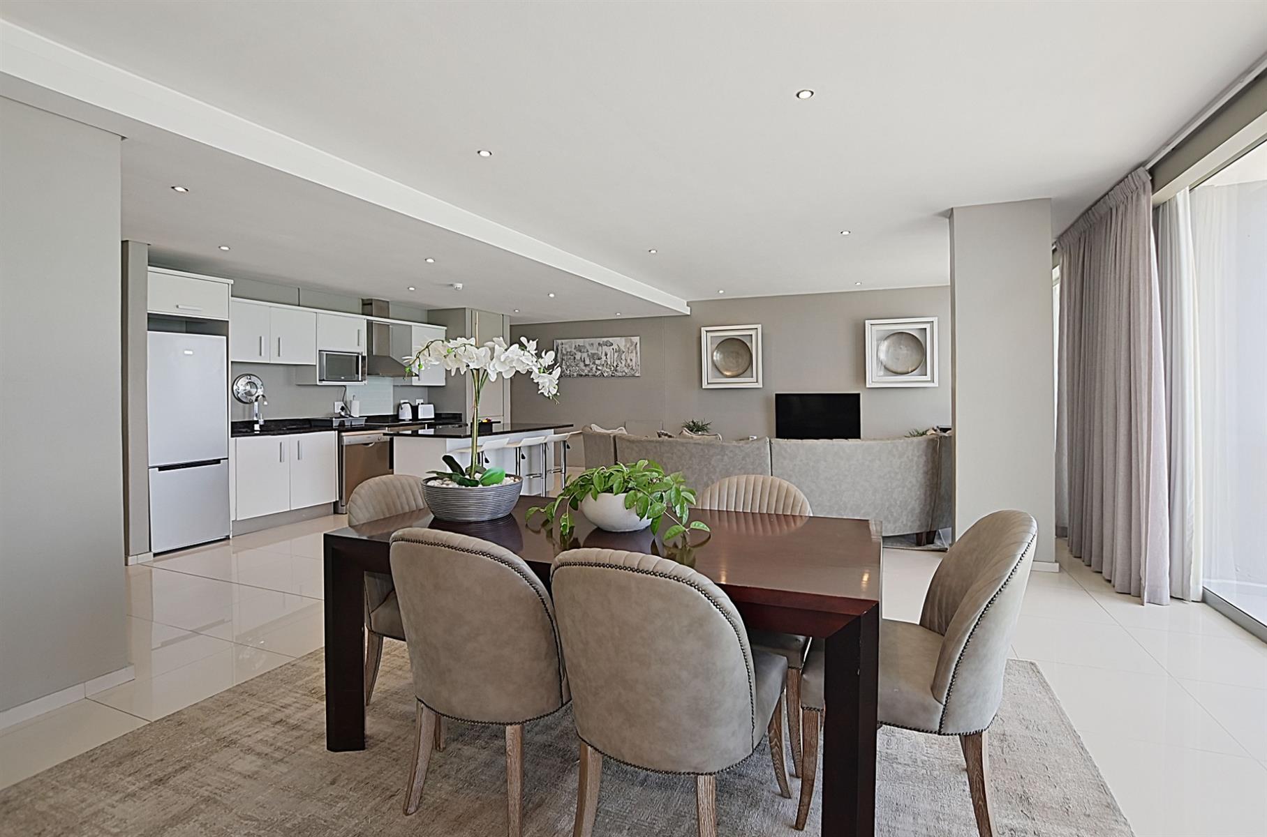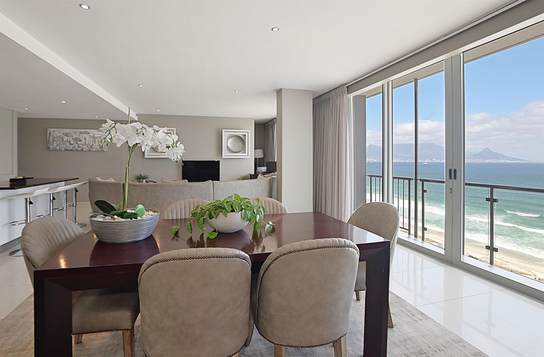 Step inside and be greeted by a bright and airy open-plan living area, complete with floor-to-ceiling windows that showcase breathtaking views of Table Mountain, Robin Island and the sparkling Atlantic Ocean. The contemporary décor and stylish furnishings create a warm and inviting atmosphere, perfect for relaxing after a day of exploring. Enjoy cozy evenings in the spacious lounge, or gather around the dining table for a delicious meal prepared in the fully equipped kitchen.