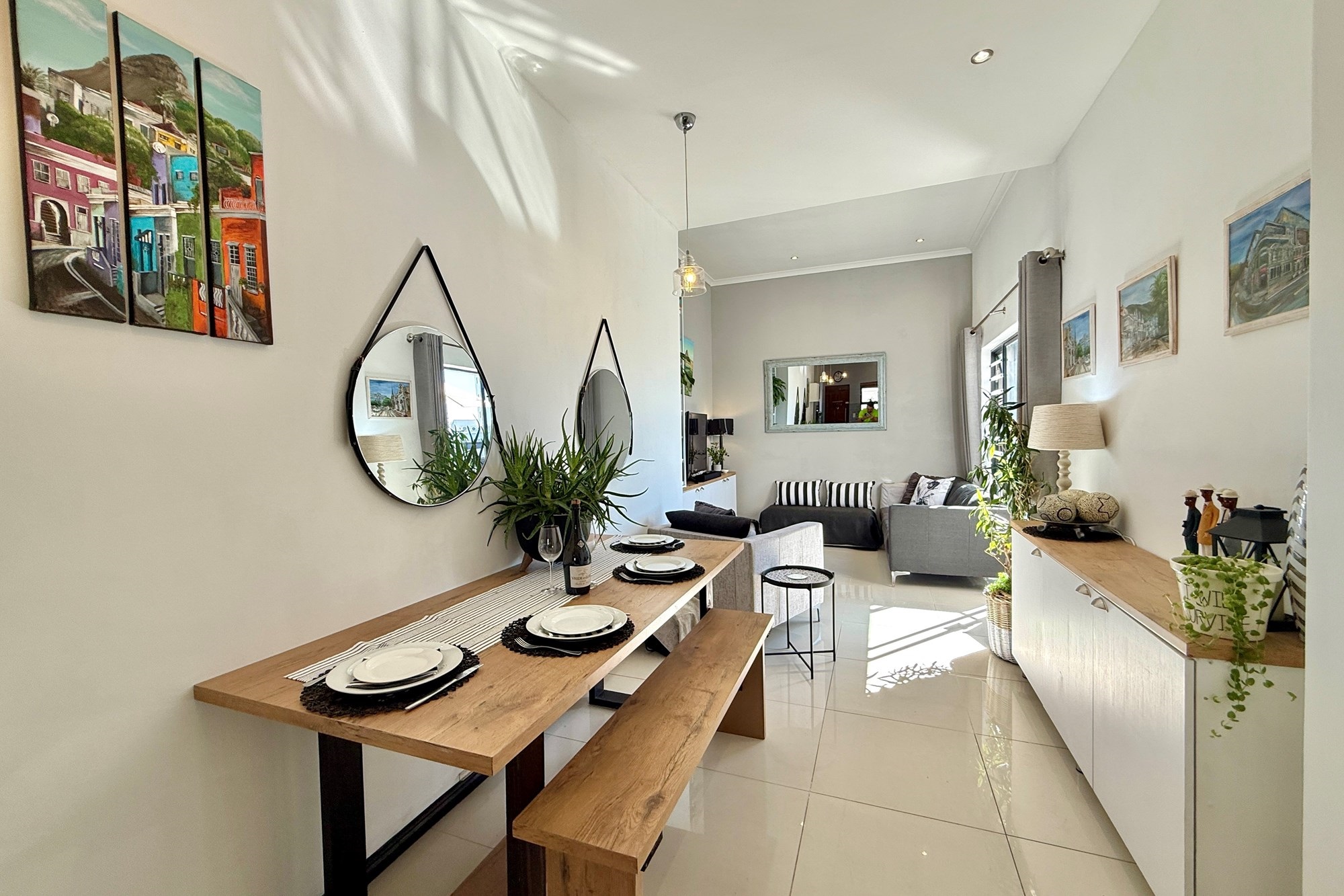 Comfortable open-plan dining and living area leading onto a cosy balcony with sea views.