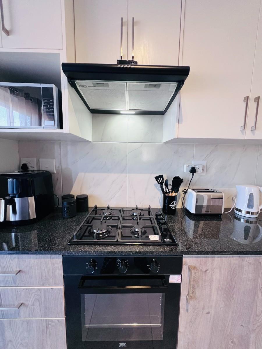 Modern kitchen with Gas stove, oven, extractor fan, ample cupboard space and 1 plumbing point.