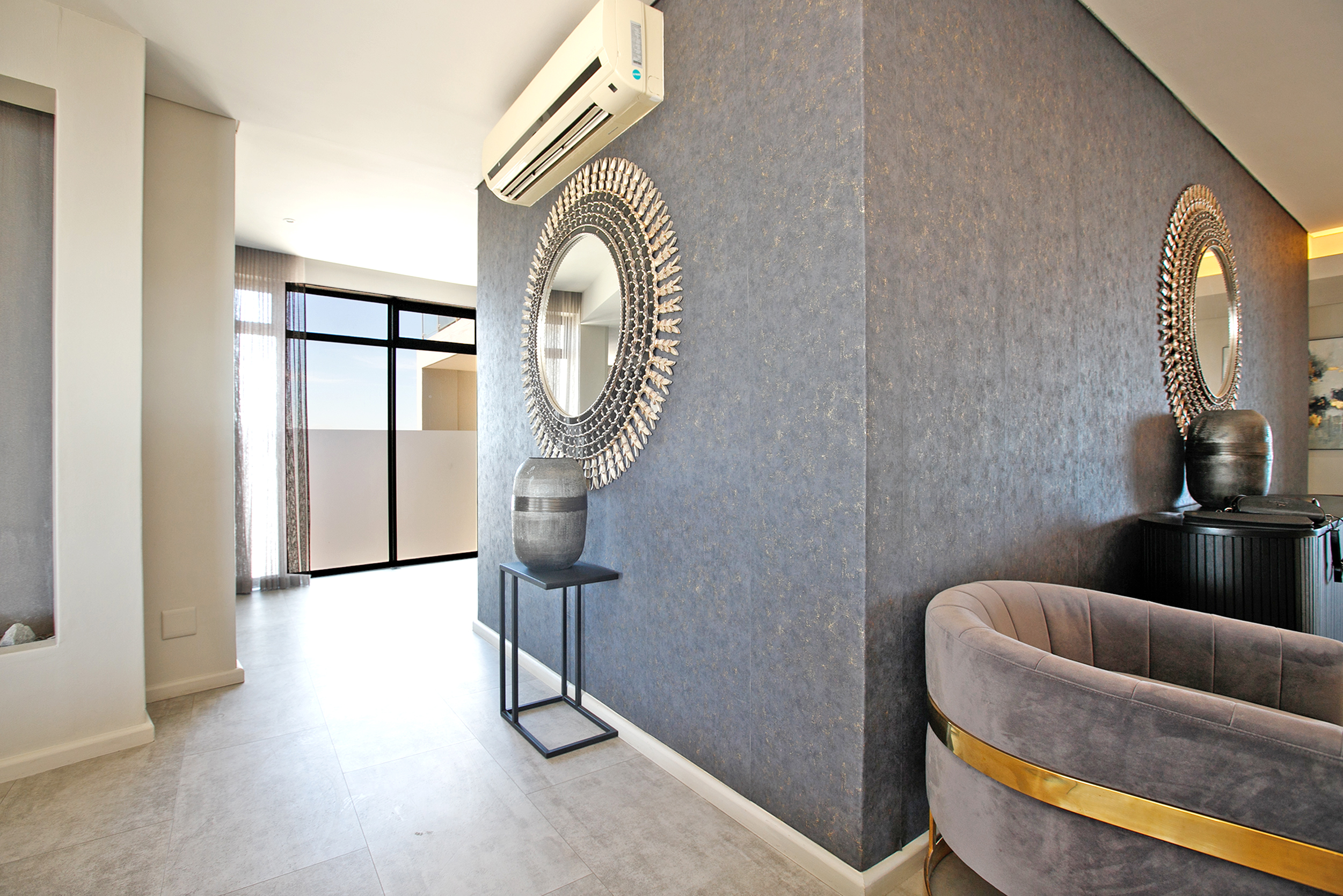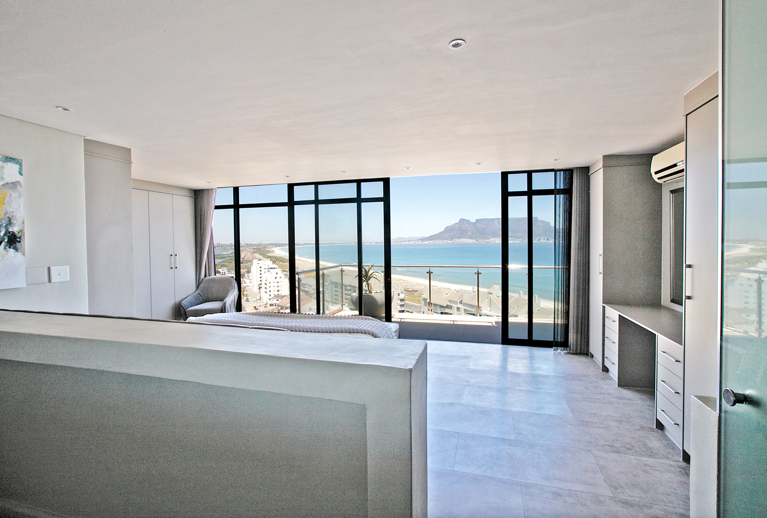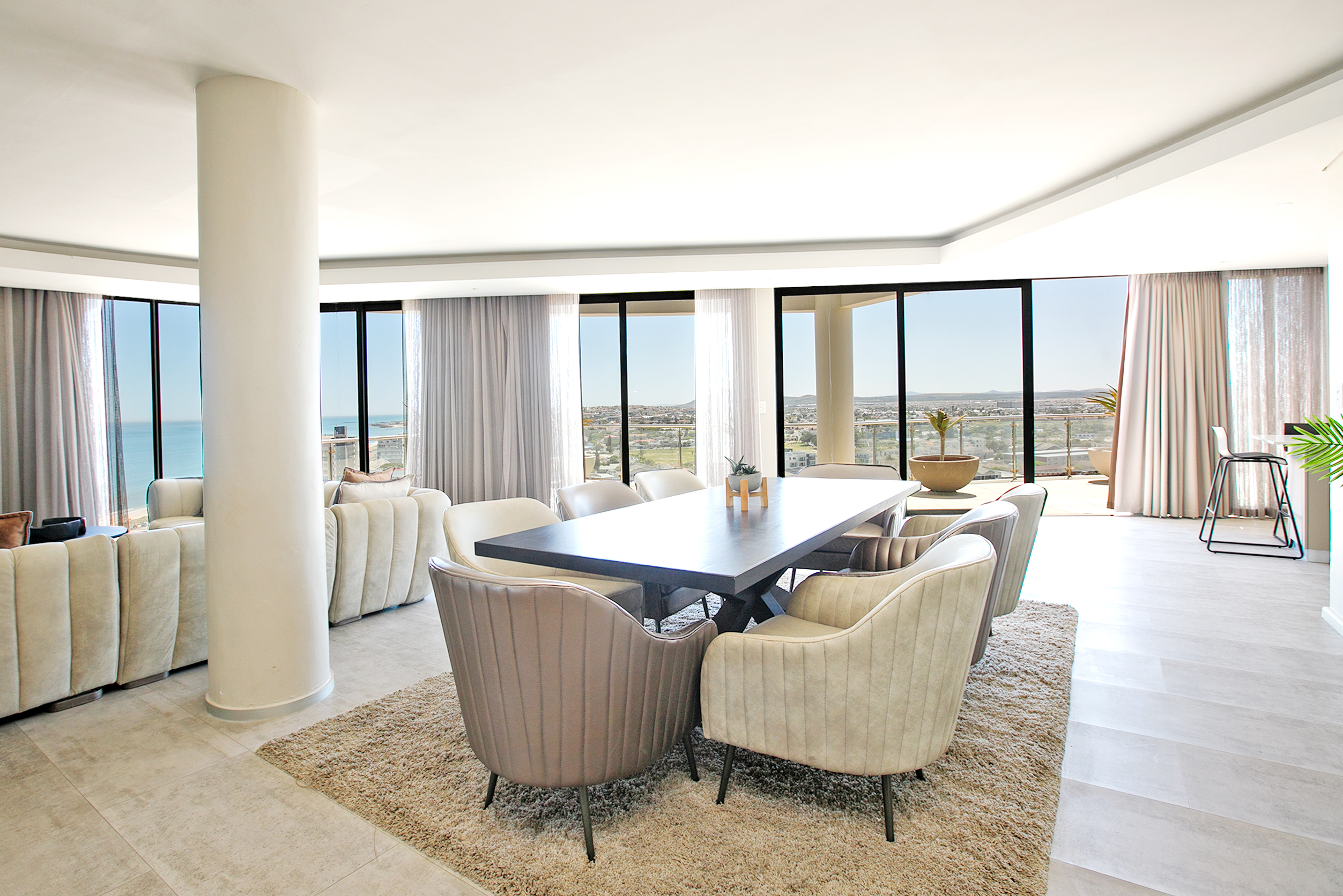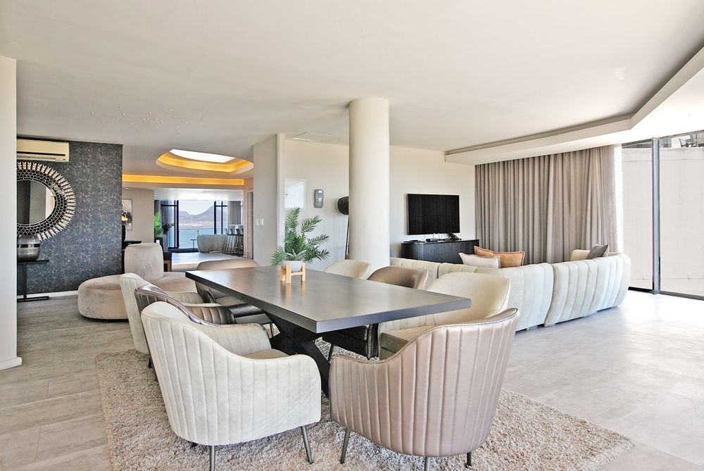 This exquisite penthouse offers a unique atmosphere, featuring stunning 360-degree views of Table View Mountain, the ocean, and Durbanville Hills, all accessible from the generous wrap-around balconies. The open-plan living areas are bathed in natural light, creating an expansive sense of space and freedom.