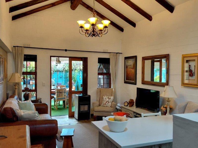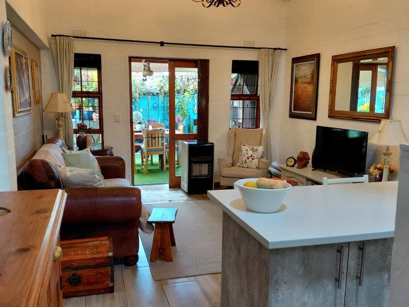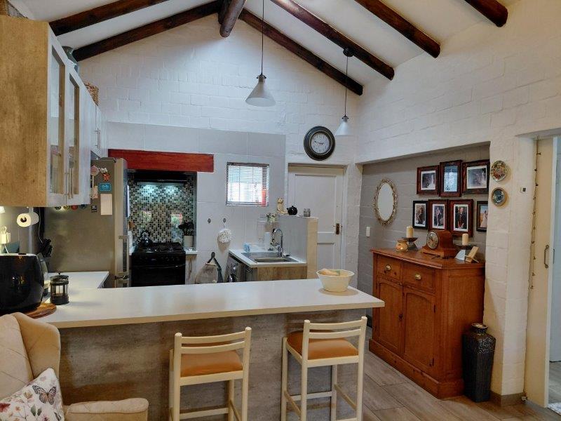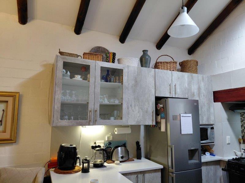 Stunning 2-bedroom home in pristine condition, boasting a generous open-plan living area with soaring double-volume ceilings. The contemporary kitchen is equipped with both gas and electric stoves. The inviting living room opens onto a partially enclosed covered patio, perfect for relaxation.