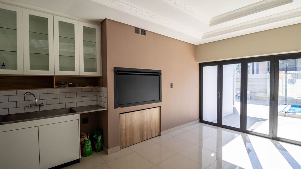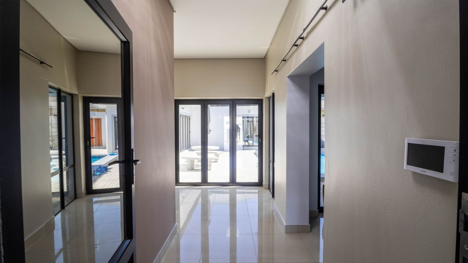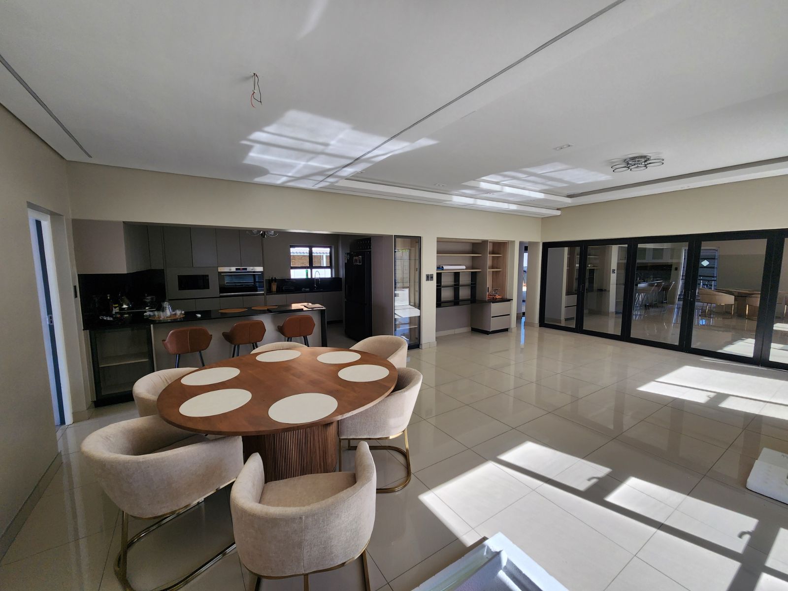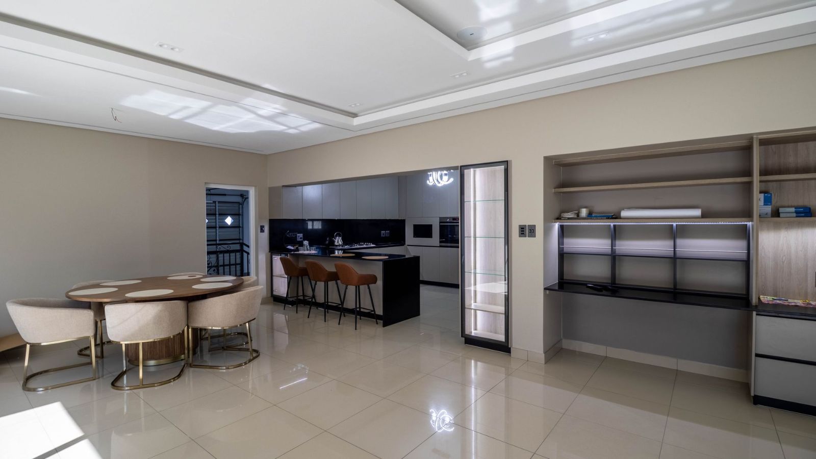 The entrance invites you into this 410 sqm under roof house, it is designed to accommodate modern family living with ease. A triple garage with a paved driveway set the tone for the residence. Inside, a seamless open-plan layout connects two lounges and two dining areas, providing ample space for both relaxed family living and formal entertainment.