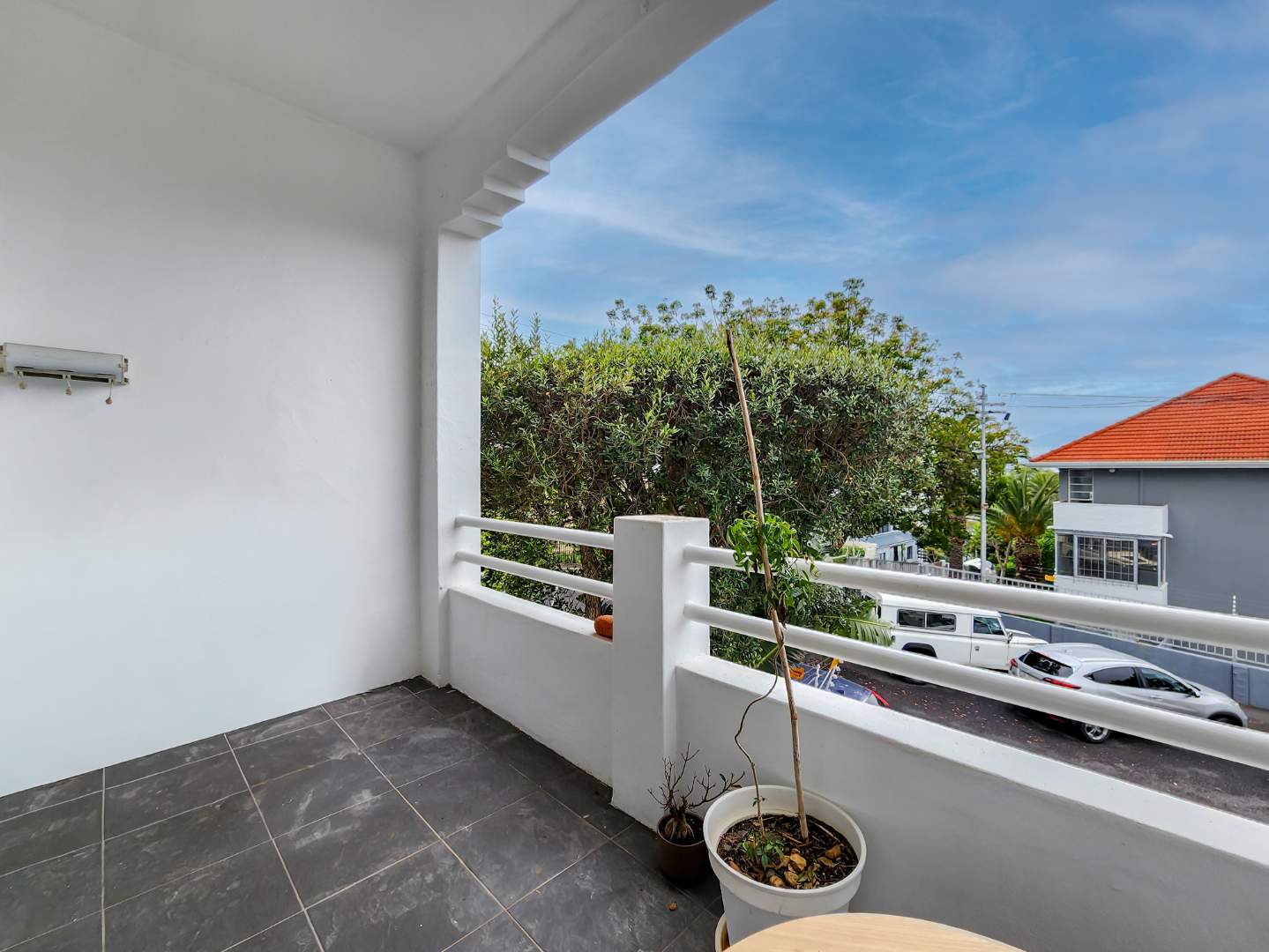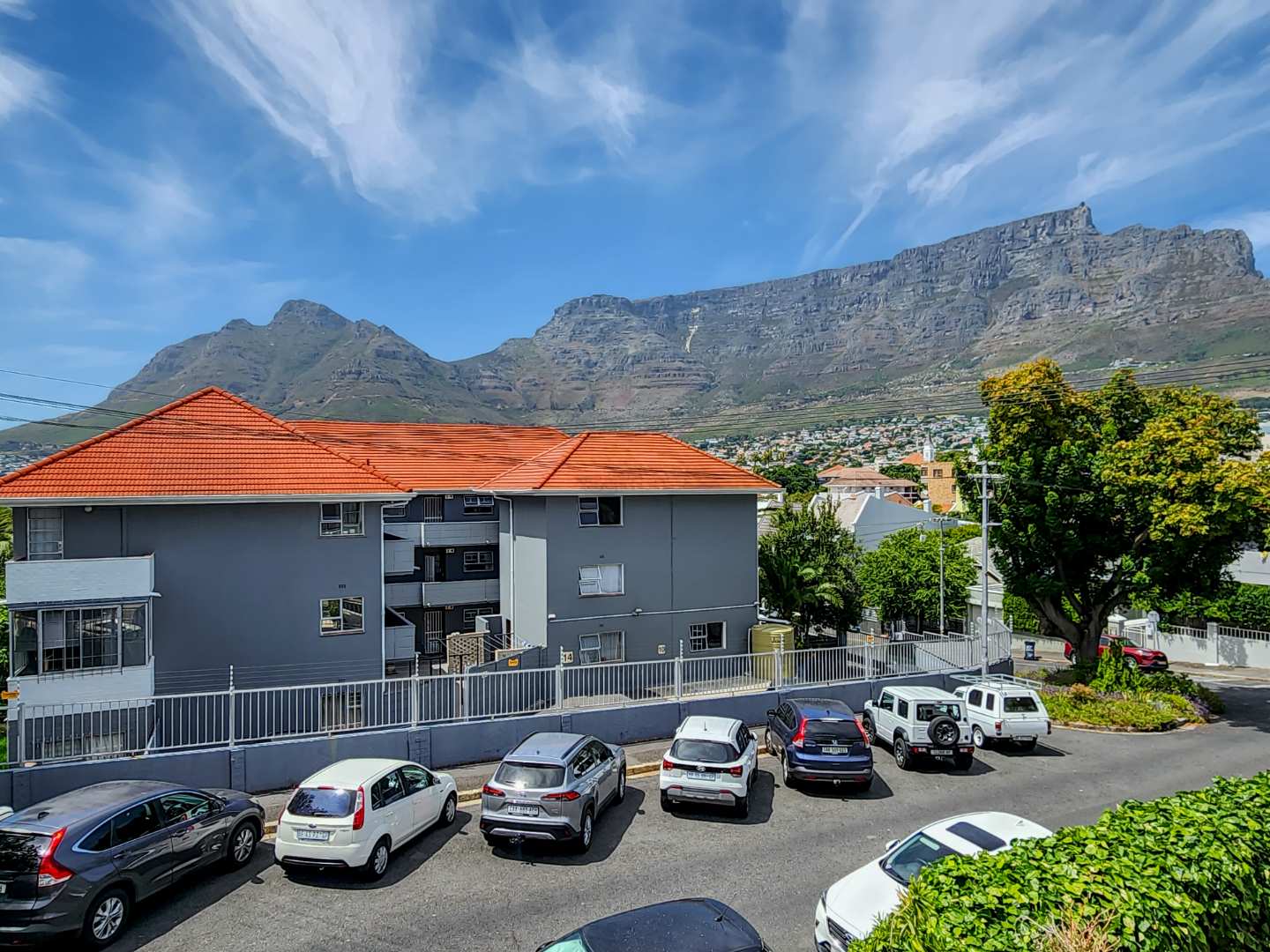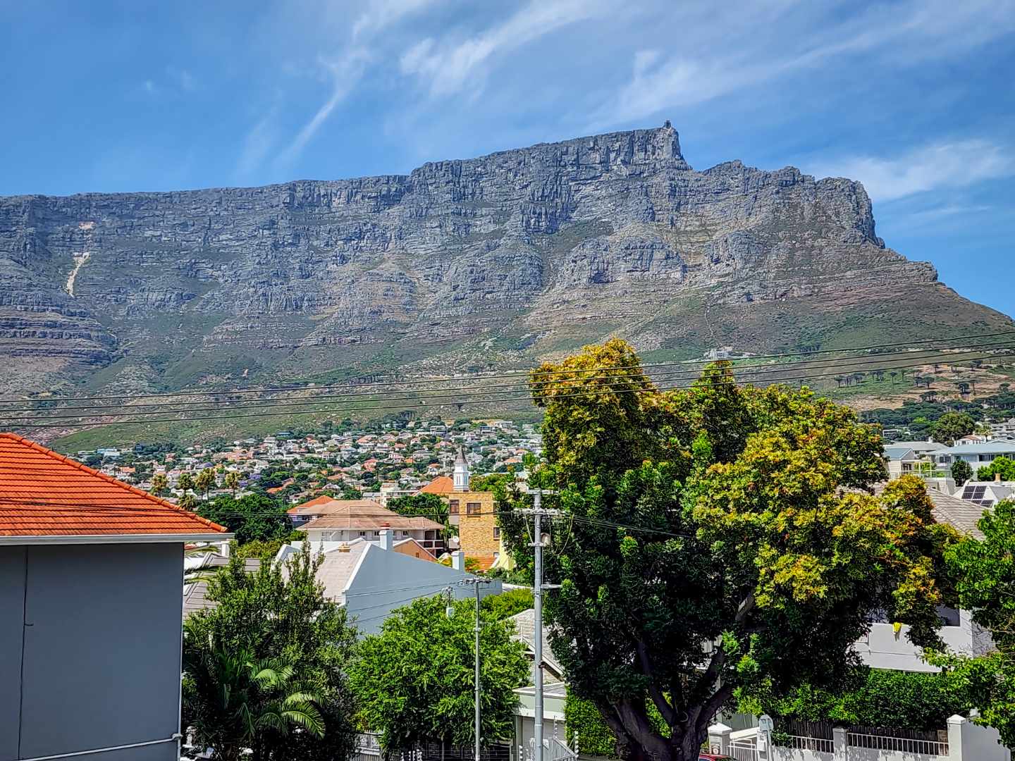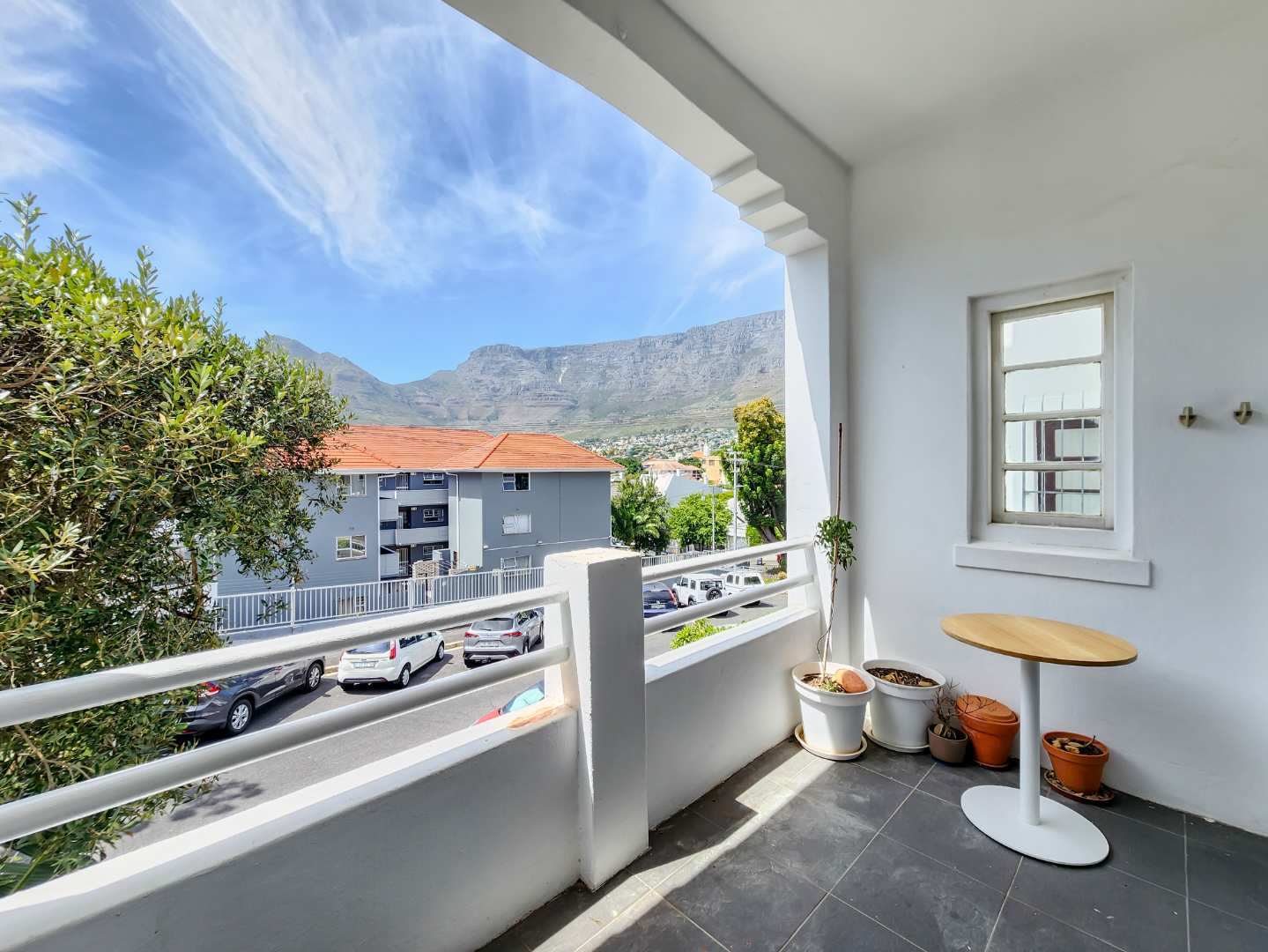 The open-plan kitchen seamlessly flows into the living area, featuring double doors that open onto a balcony with views of Table Mountain.