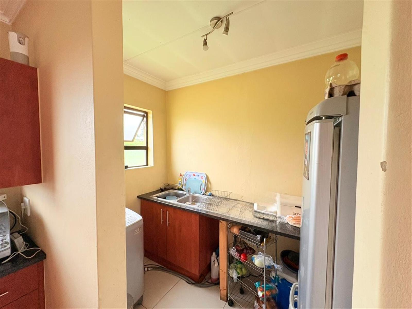 Open-plan kitchen with ample cupboard space and a dedicated wash-up/laundry area