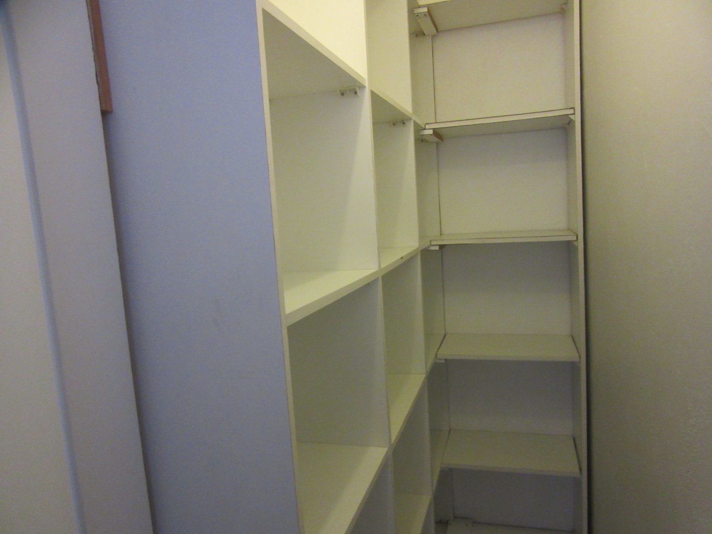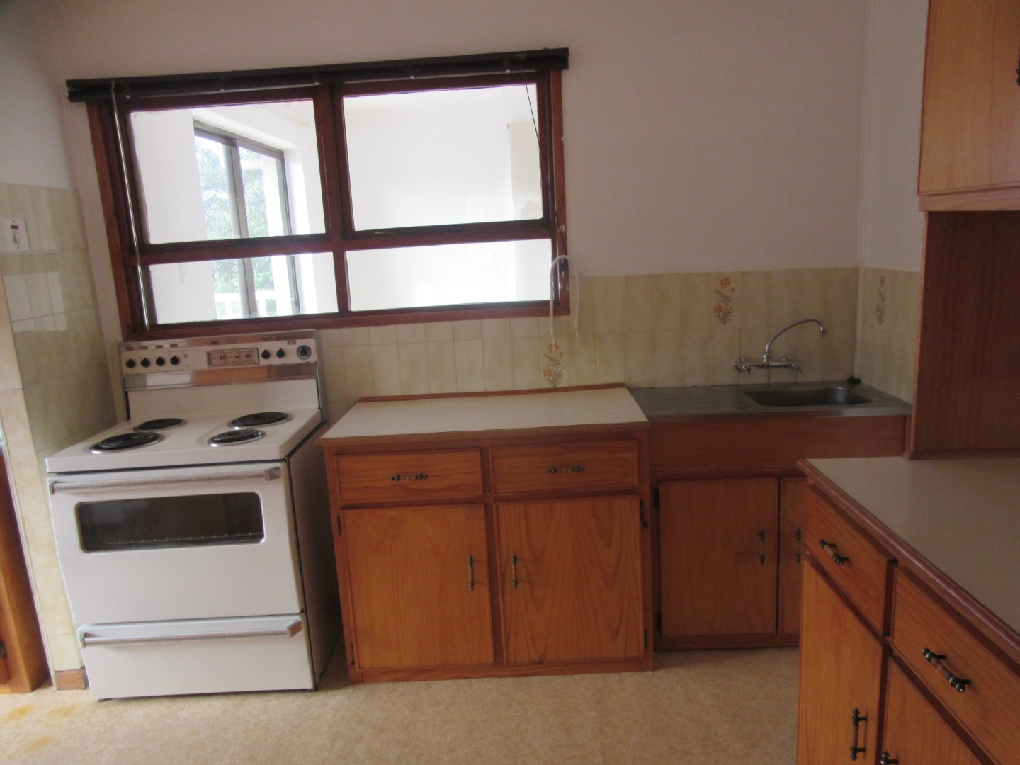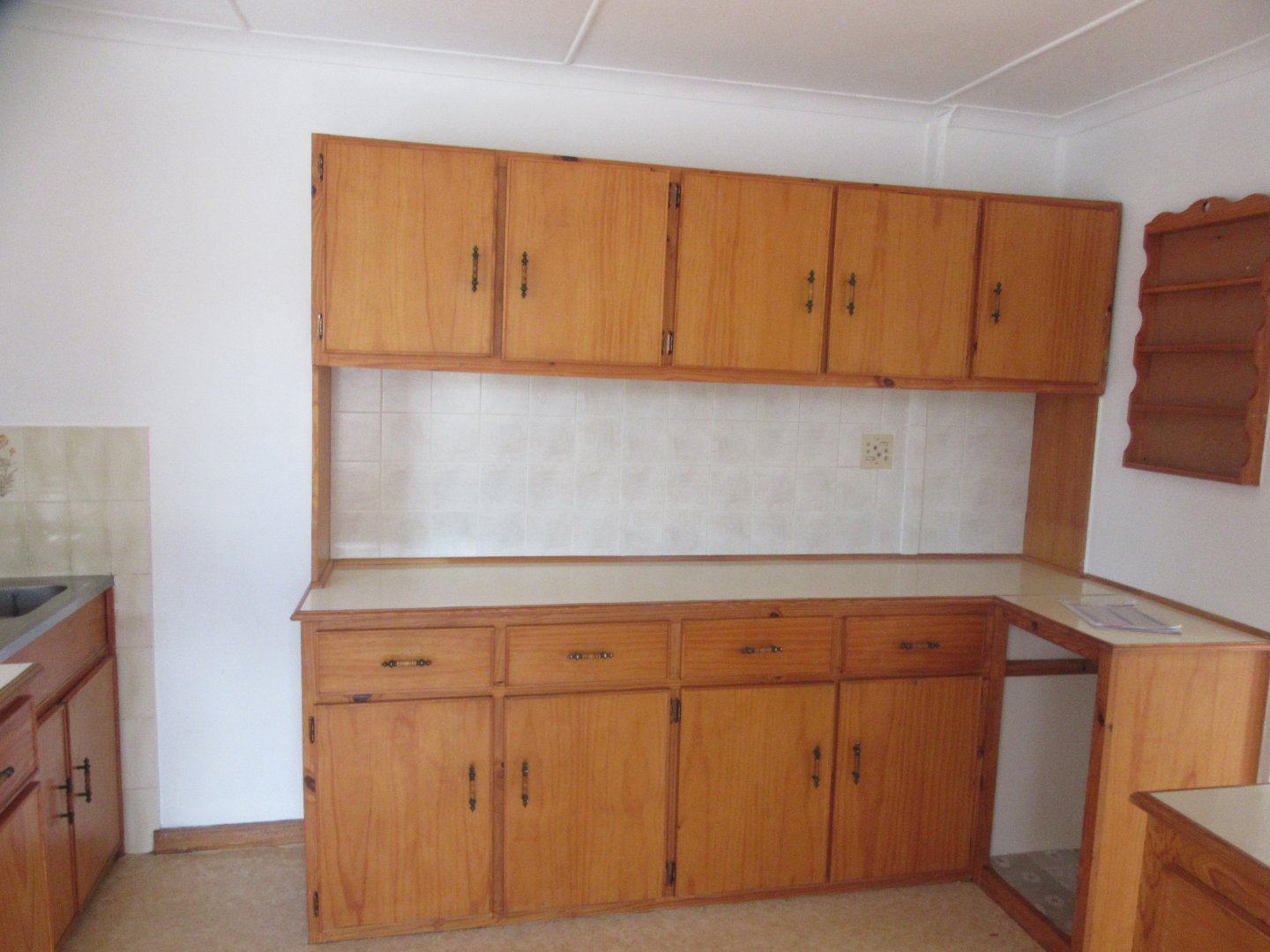 Kitchen has melamine tops and enough cupboards with linoleum floors.