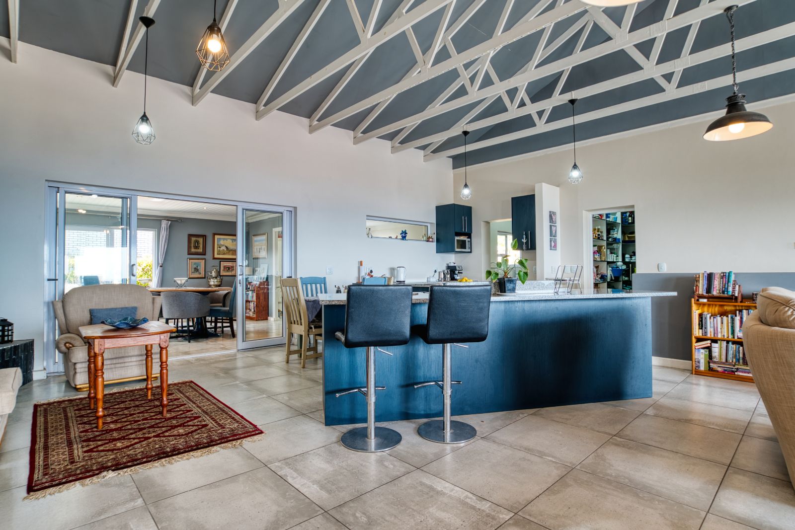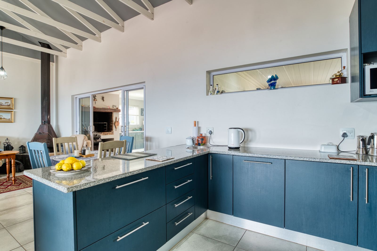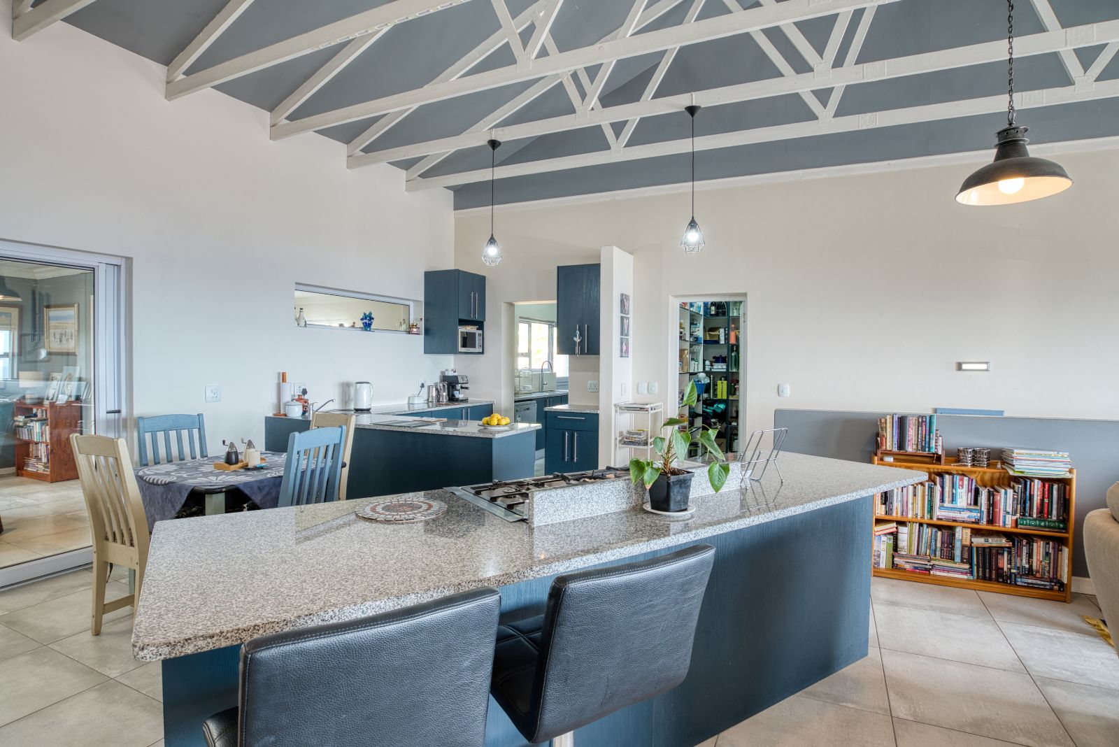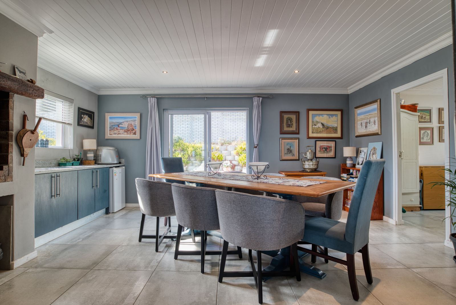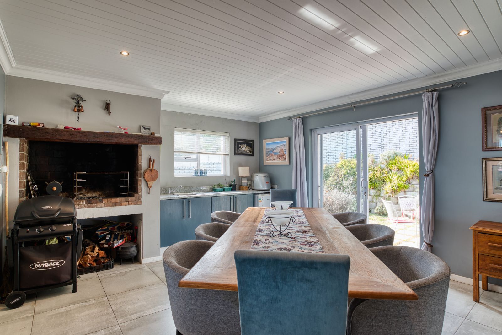 The dining area flows into an enclosed braai room, perfect for year-round entertaining. To the right of the braai room is a studio, ideal for working from home or easily convertible into a fourth bedroom. From the braai room, you can access the sunny backyard, offering a relaxed outdoor space.
