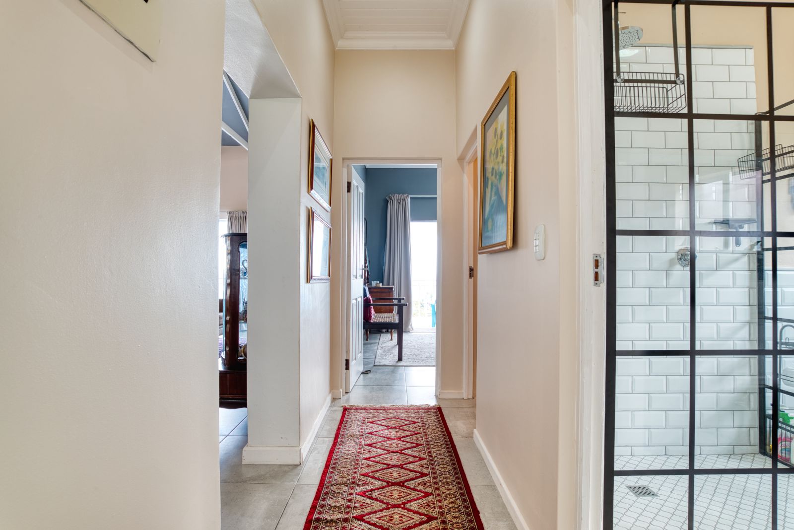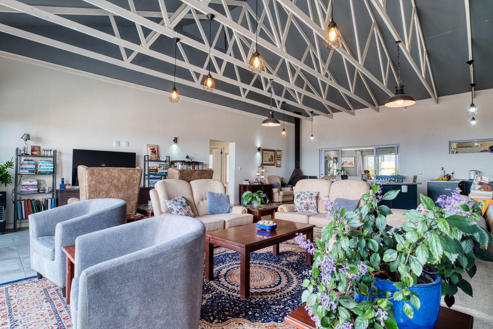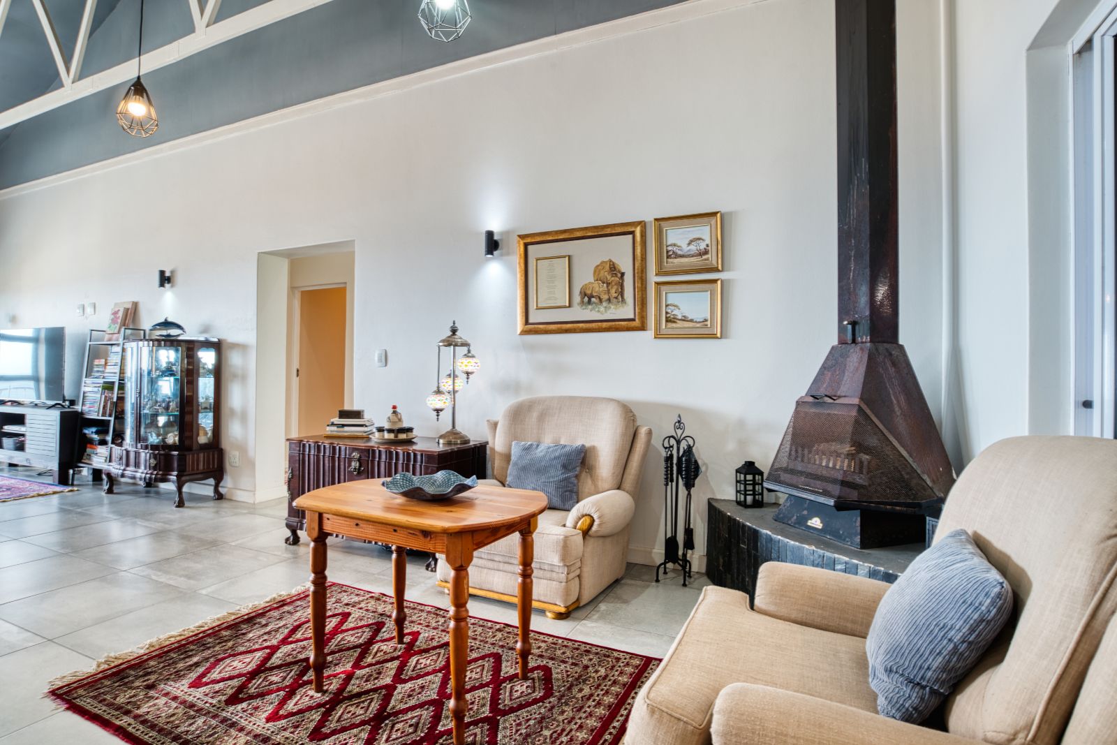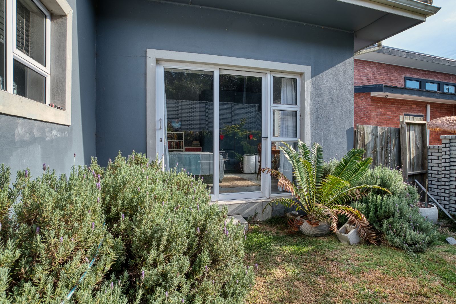 The dining area flows into an enclosed braai room, perfect for year-round entertaining. To the right of the braai room is a studio, ideal for working from home or easily convertible into a fourth bedroom. From the braai room, you can access the sunny backyard, offering a relaxed outdoor space.