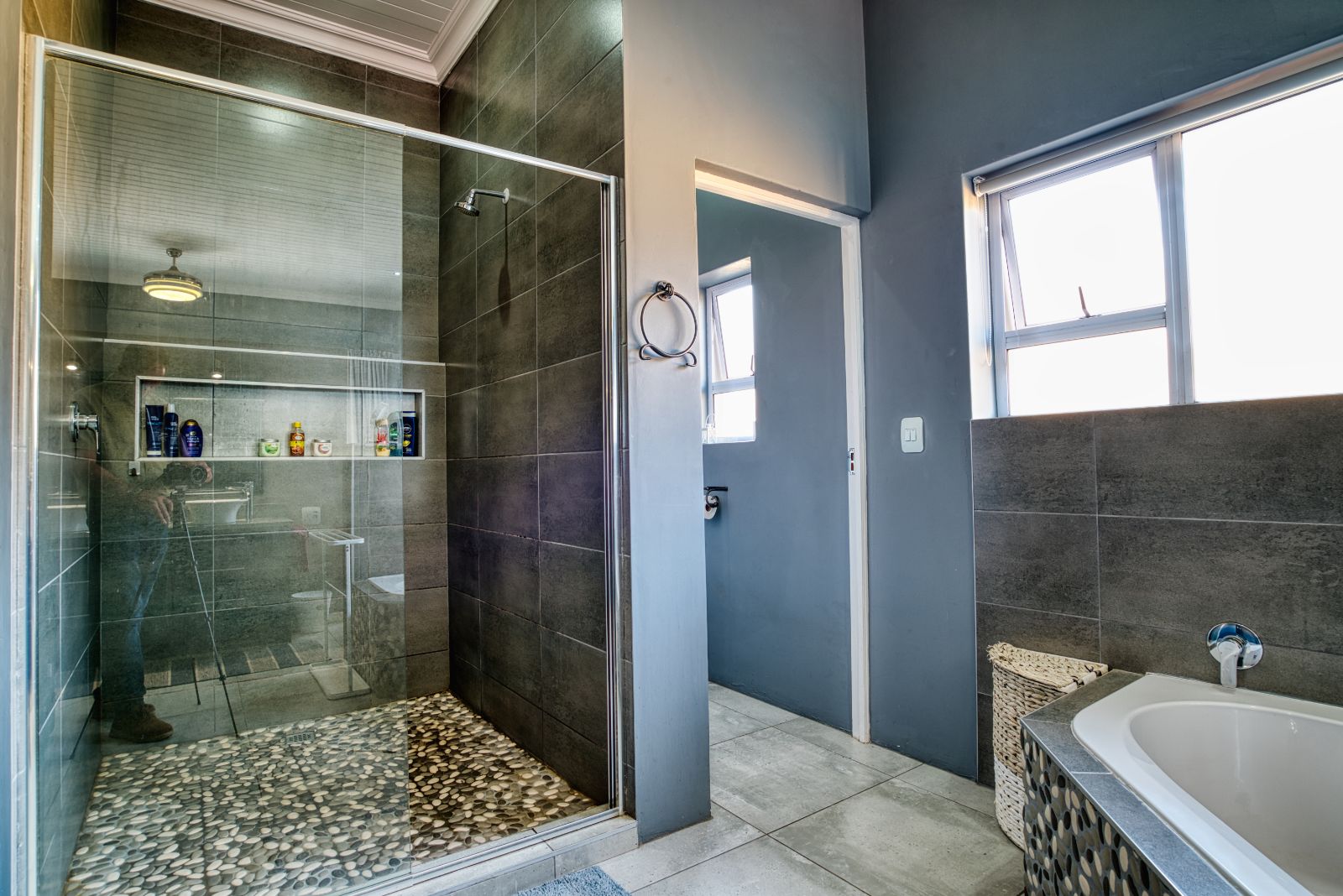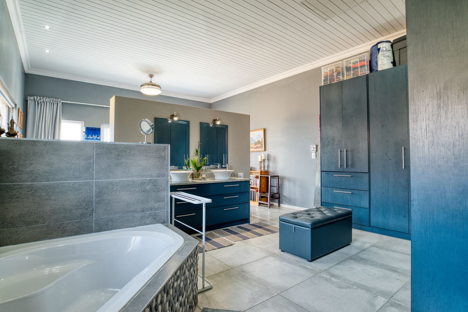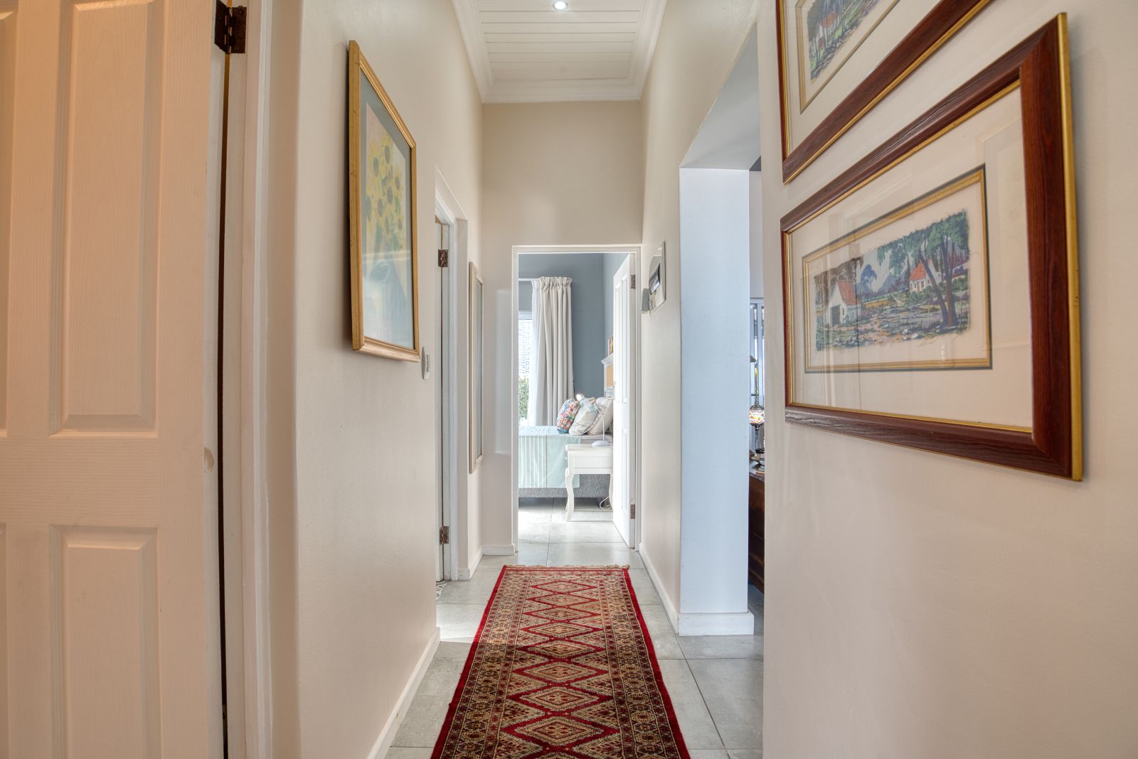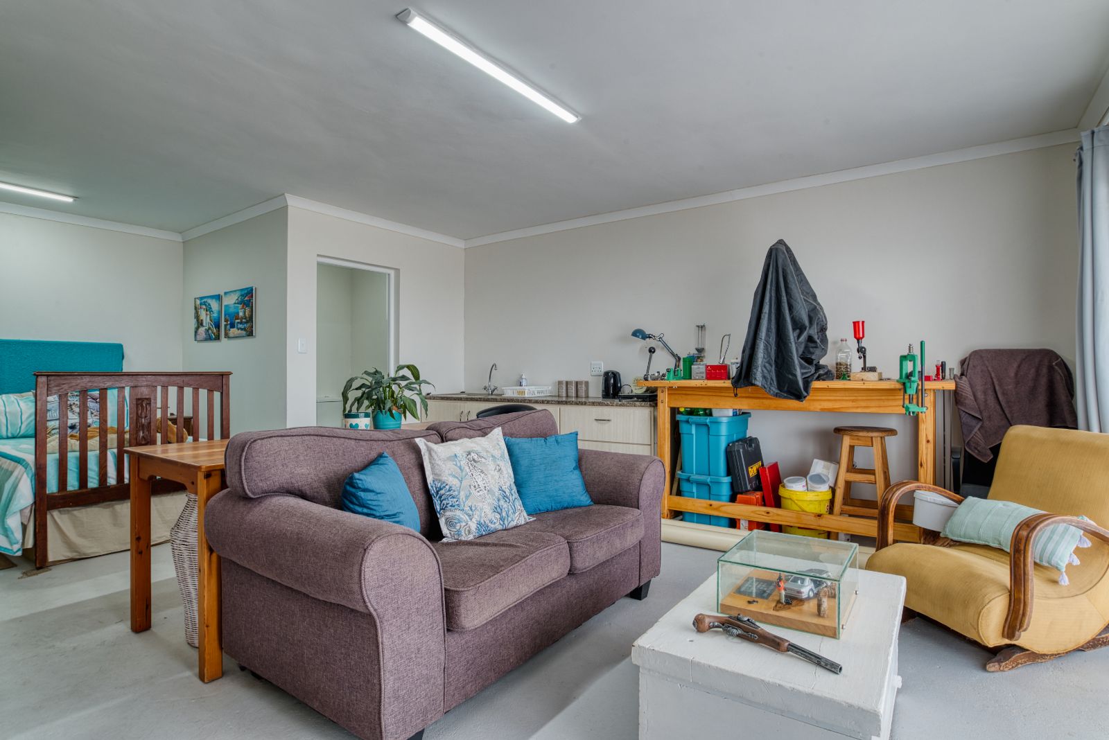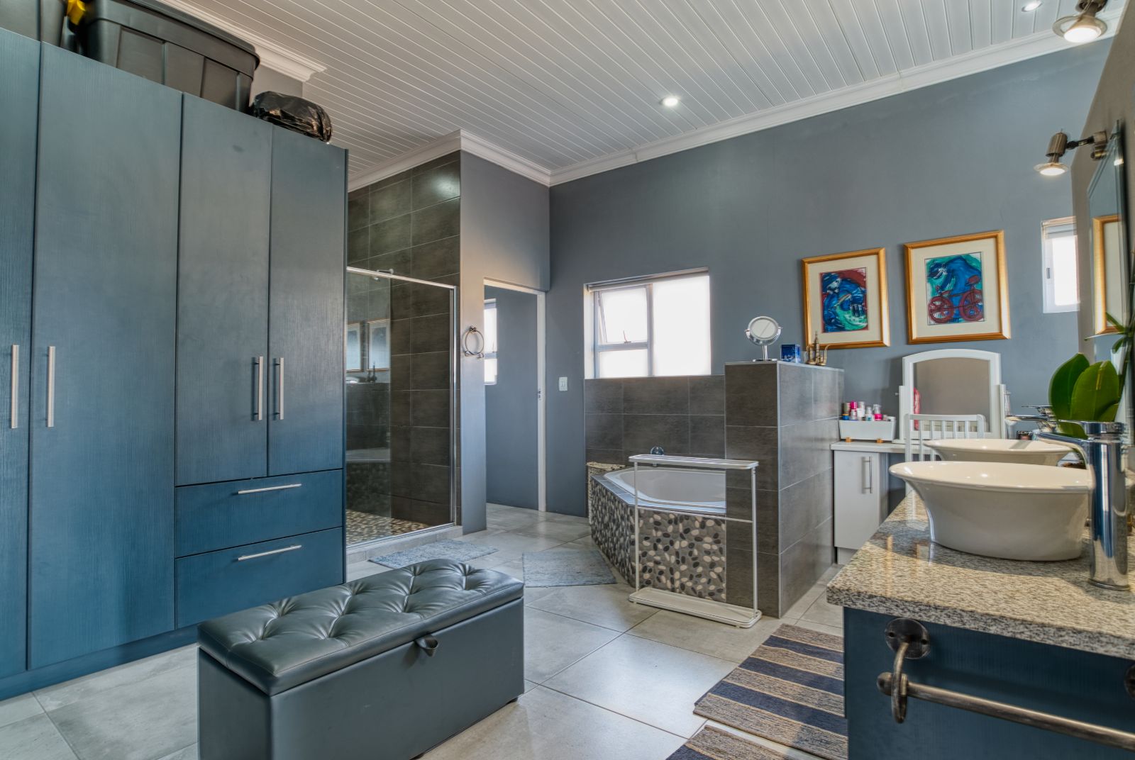 The dining area flows into an enclosed braai room, perfect for year-round entertaining. To the right of the braai room is a studio, ideal for working from home or easily convertible into a fourth bedroom. From the braai room, you can access the sunny backyard, offering a relaxed outdoor space.