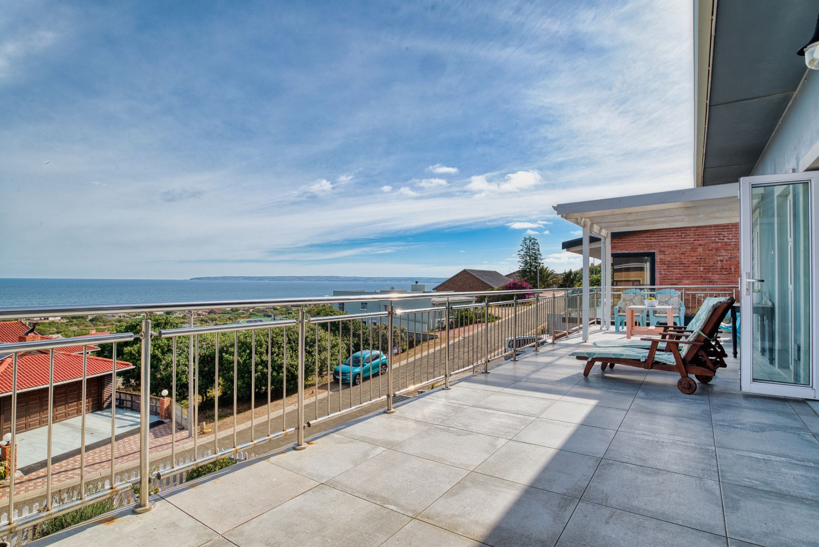 Straight ahead, a staircase leads to the upper level and into a generous open-plan living space. This level offers a modern kitchen with a separate scullery, a dining area with a fireplace, and a comfortable family lounge. From the lounge, large sliding doors open onto an expansive balcony with magnificent ocean views.