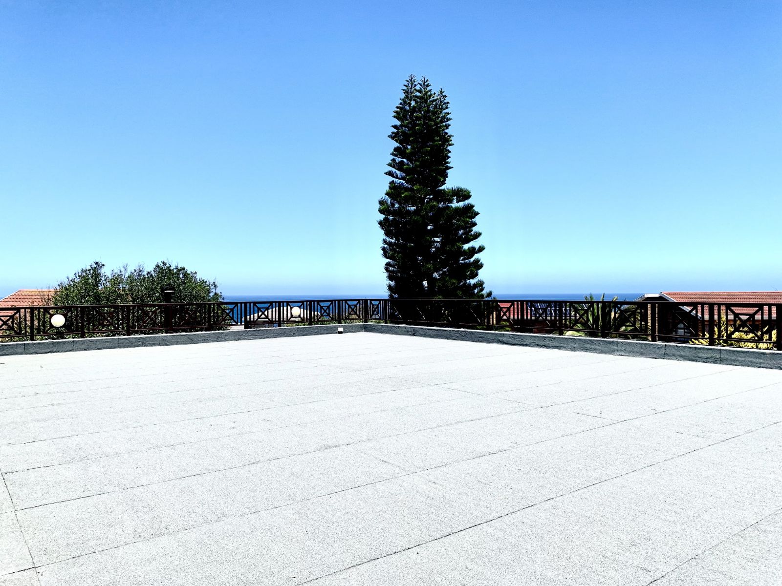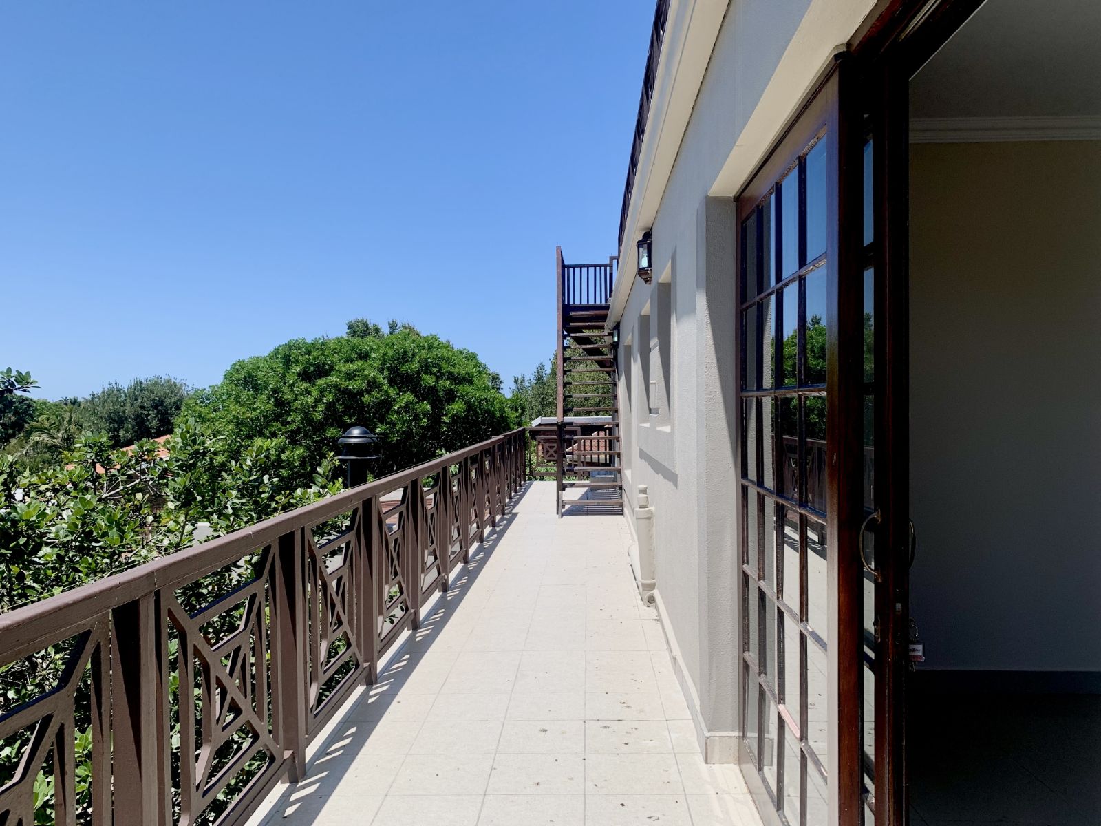 The upper level features a main bedroom with full en-suite bathroom (bath and shower) and direct access to a long balcony with ocean views. Three additional north-facing bedrooms enjoy beautiful mountain views, with two opening onto a balcony that leads via staircase to a roof terrace offering 360-degree ocean and mountain views. A comfortable living area with fireplace and extra storage room/study completes this level.