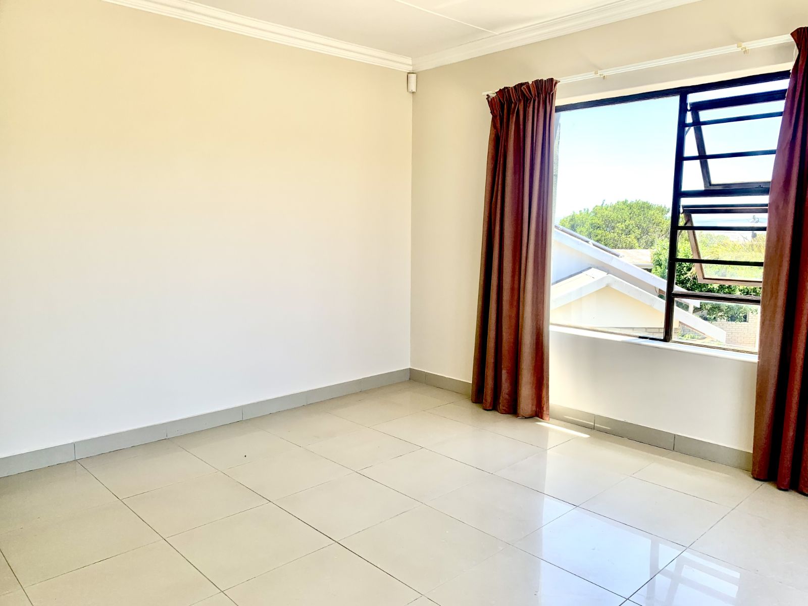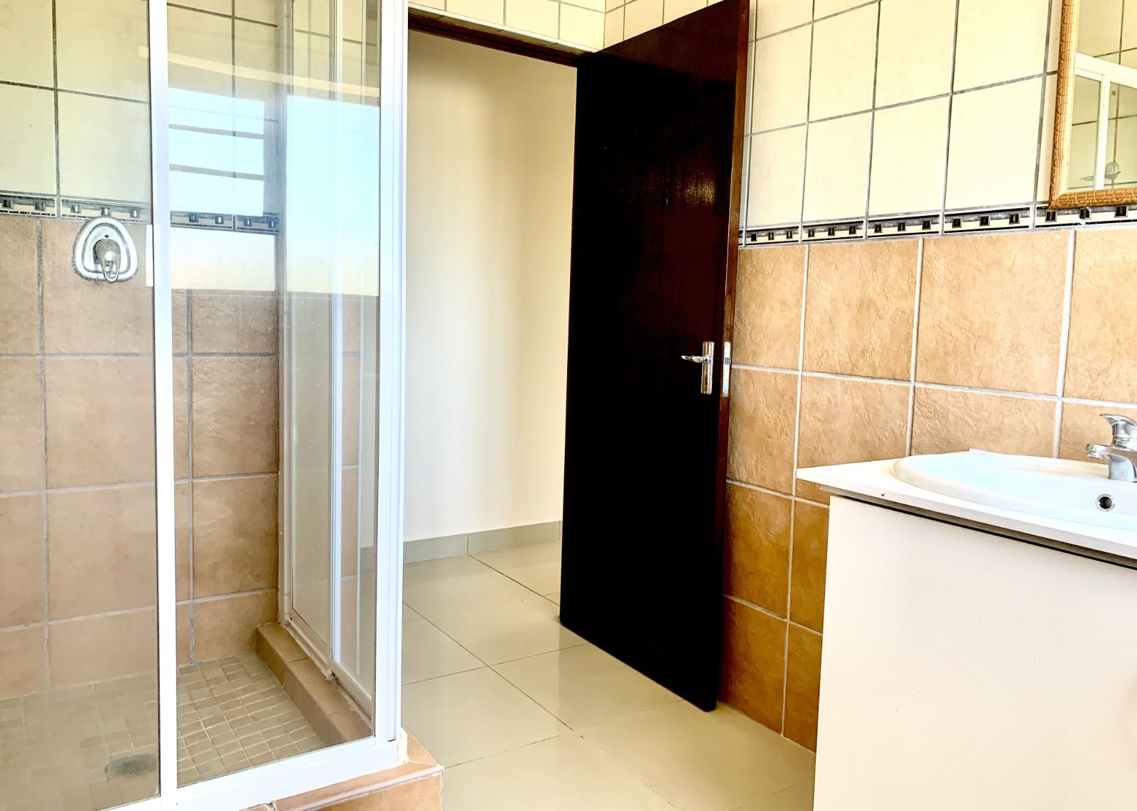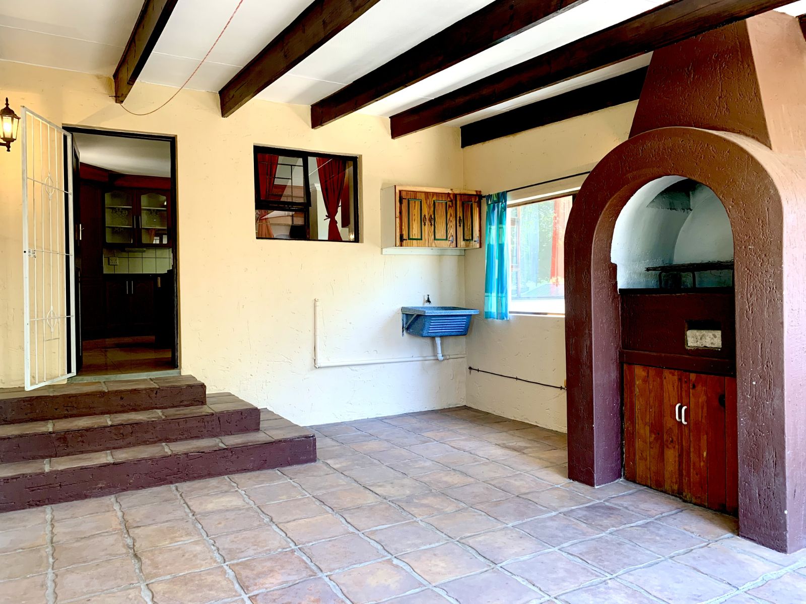 The lower level welcomes you with a generous lounge and dining area, ideal for family living and entertaining. The modern kitchen offers ample cupboard space and room for essential appliances, flowing into an enclosed, under-roof braai room that opens onto a large garden.