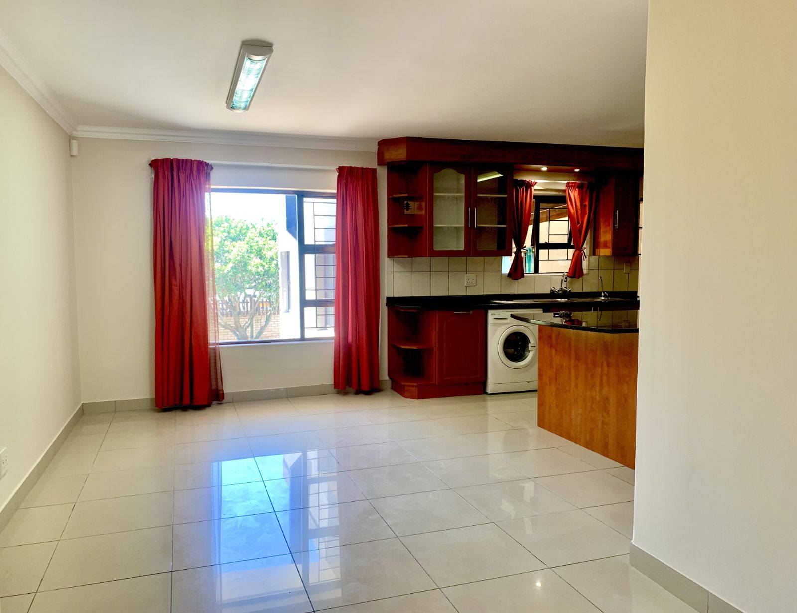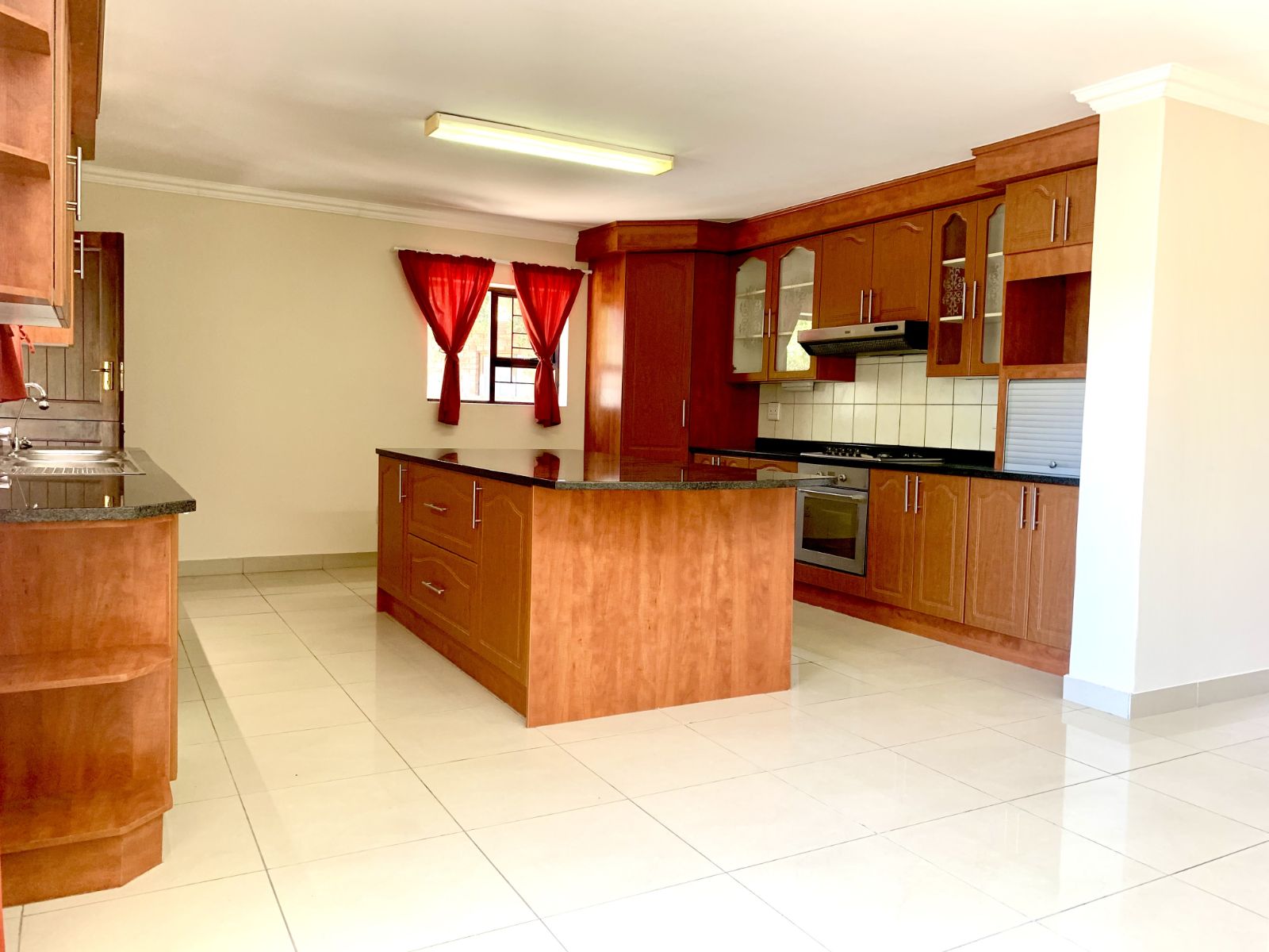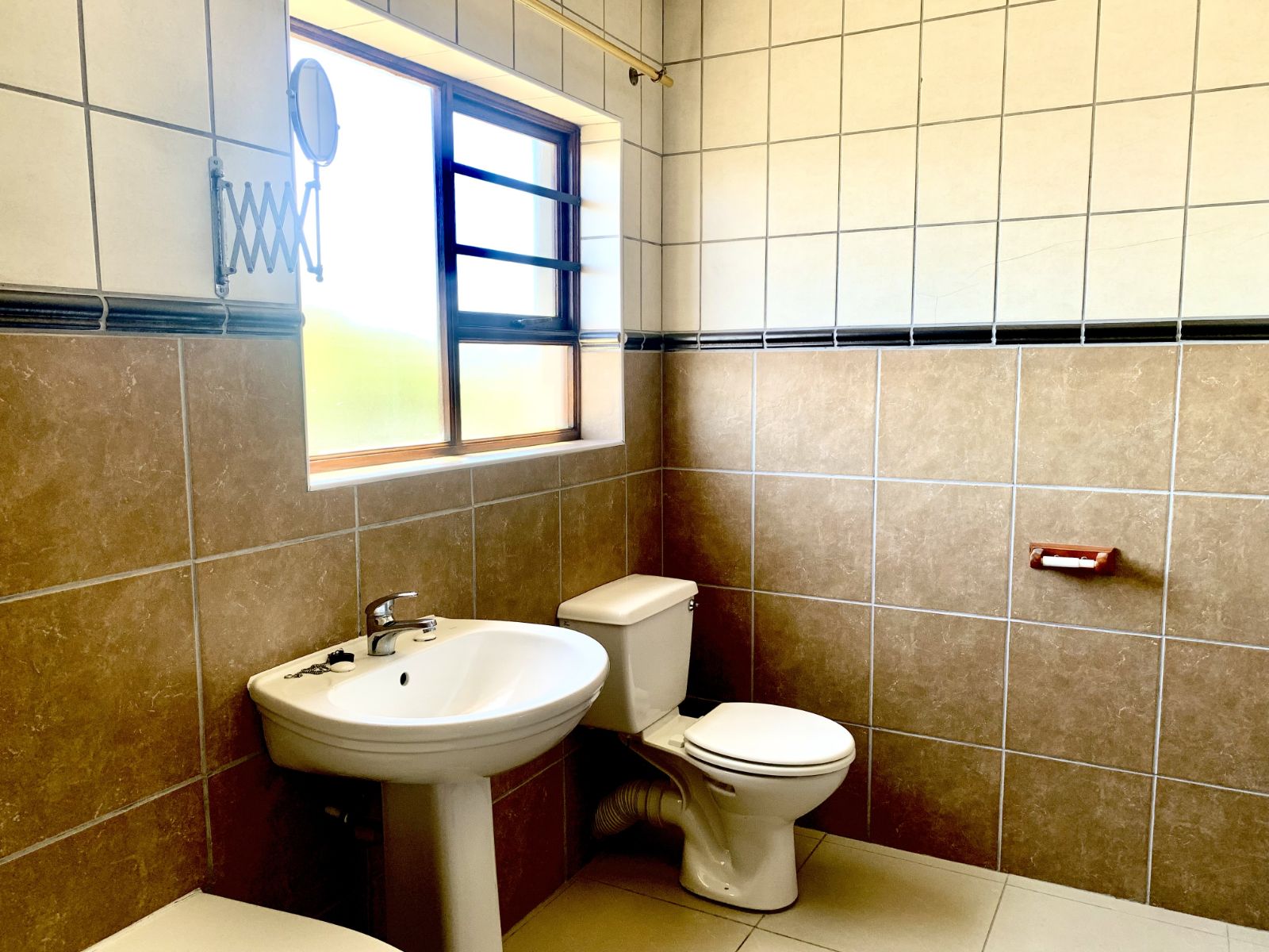 The lower level welcomes you with a generous lounge and dining area, ideal for family living and entertaining. The modern kitchen offers ample cupboard space and room for essential appliances, flowing into an enclosed, under-roof braai room that opens onto a large garden.
