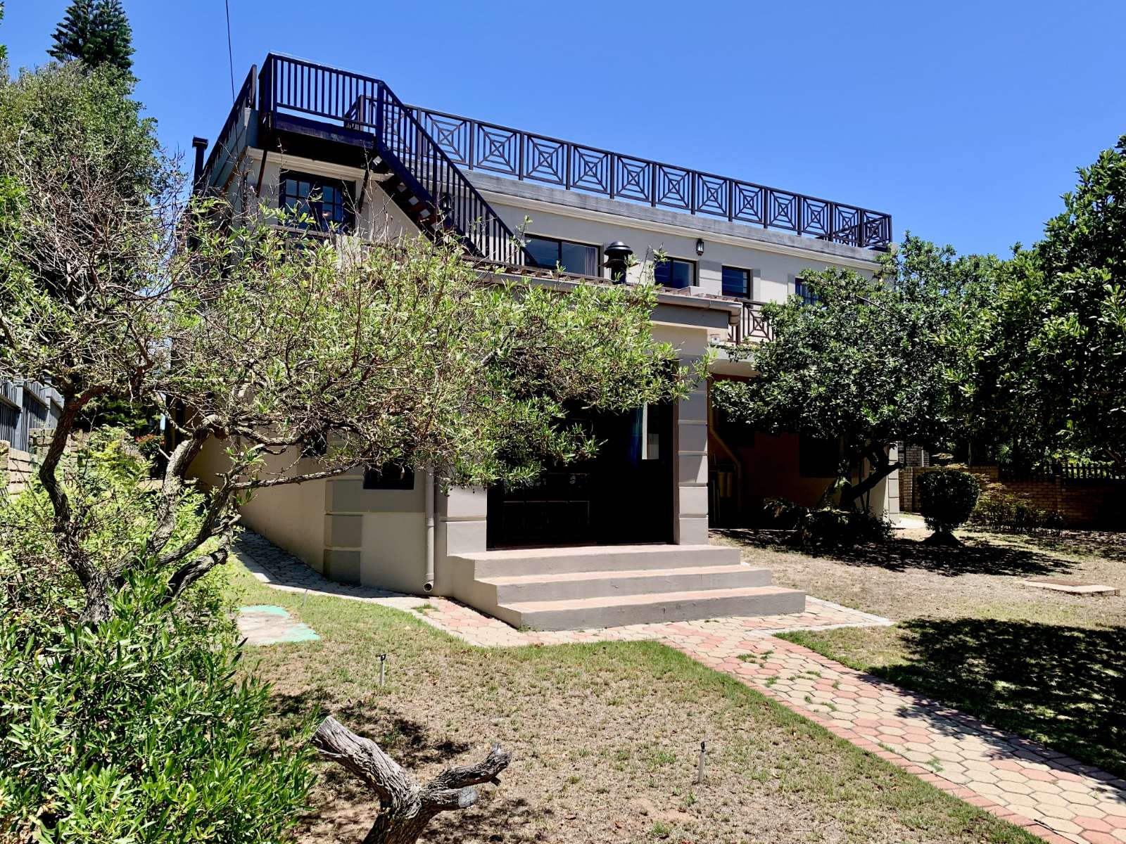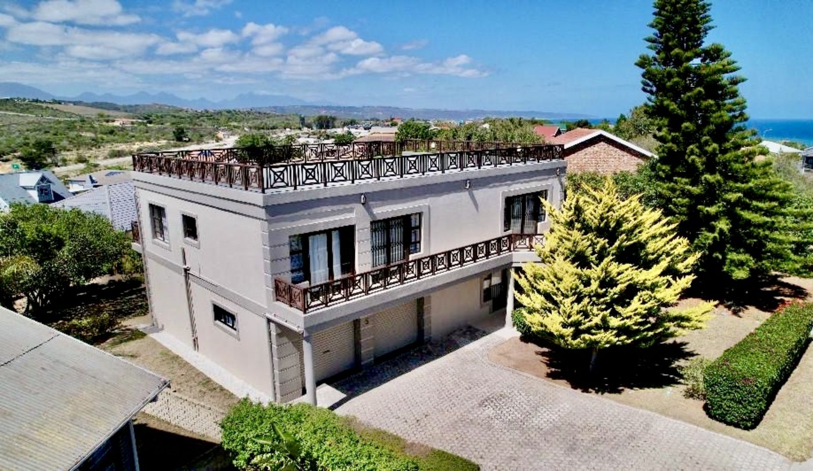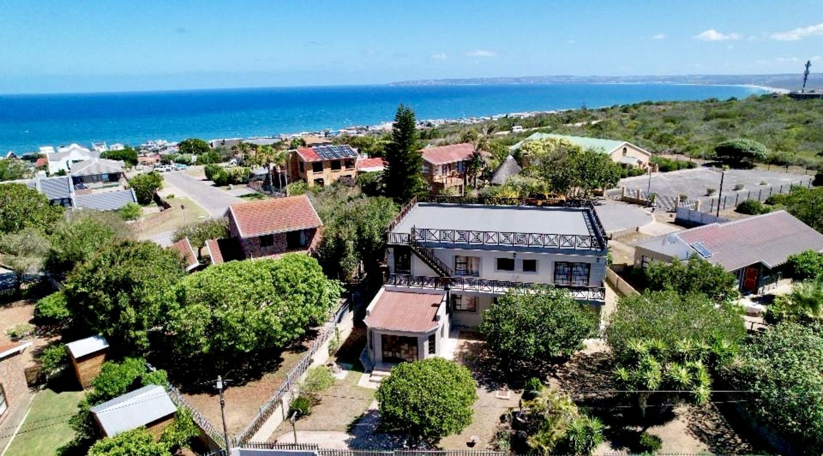 This spacious five-bedroom home offers exceptional coastal living with panoramic ocean and mountain views.