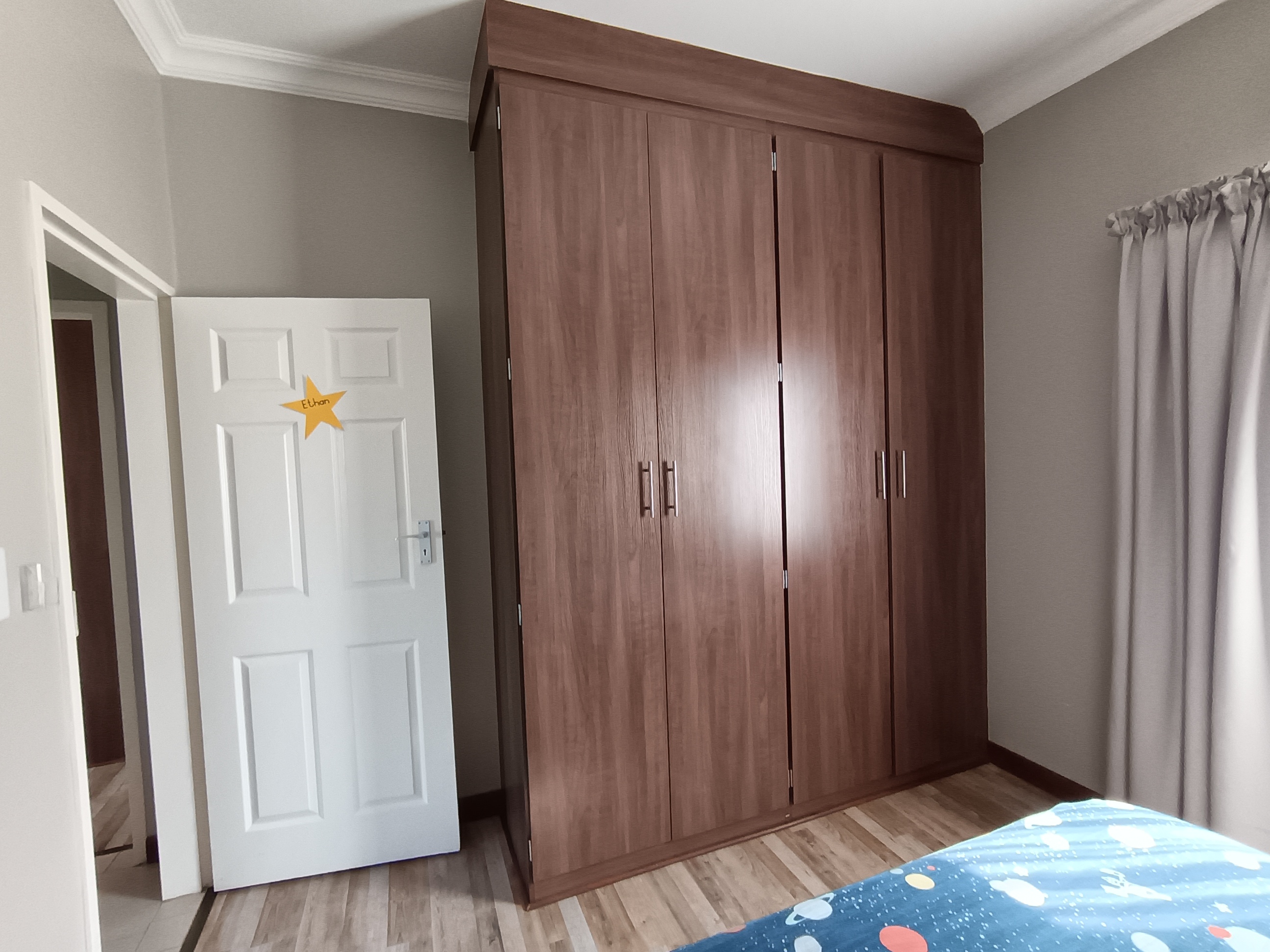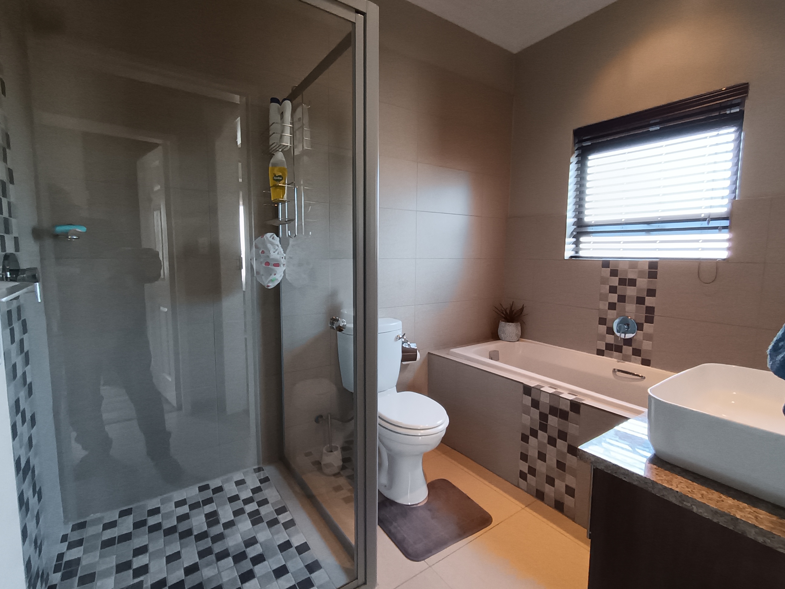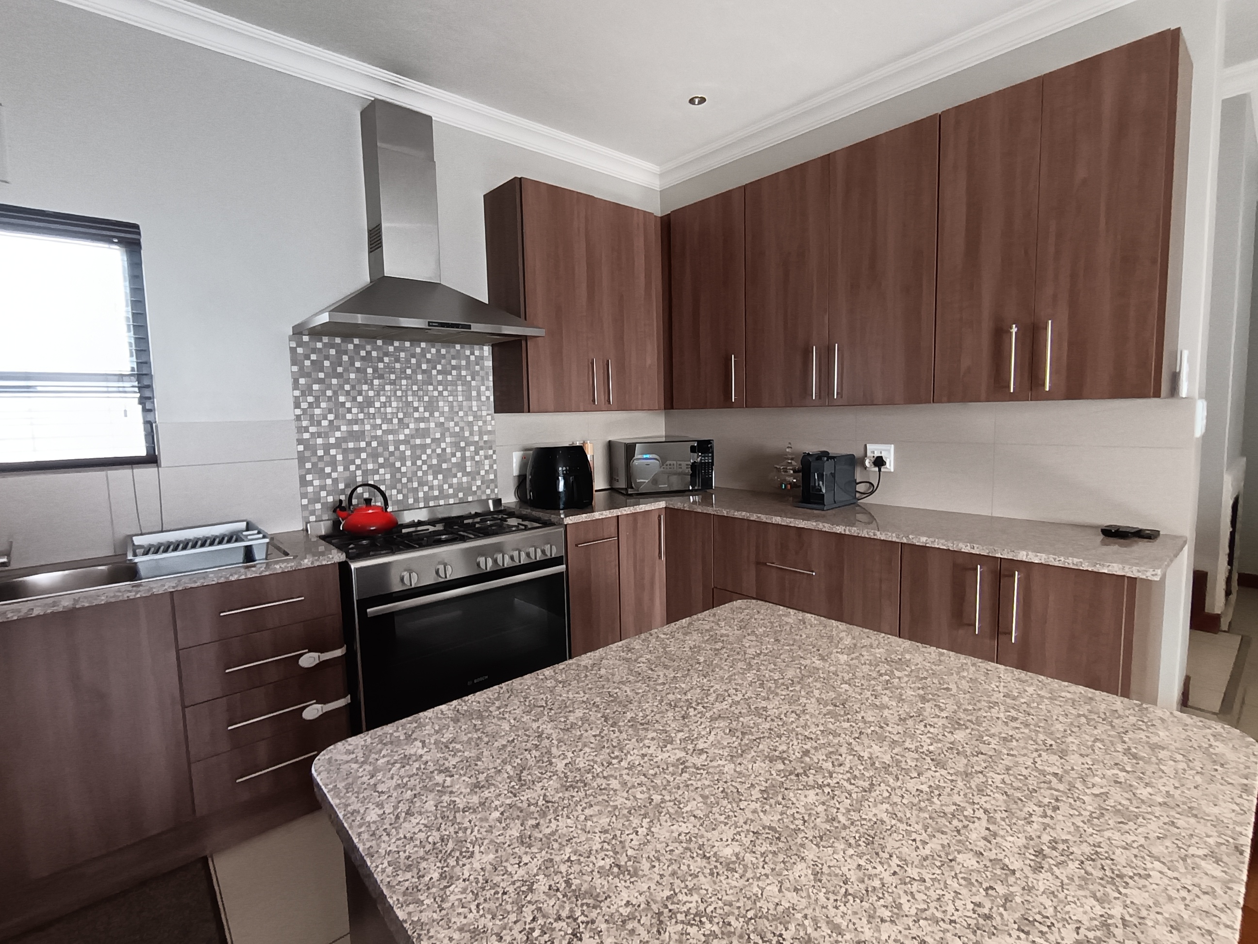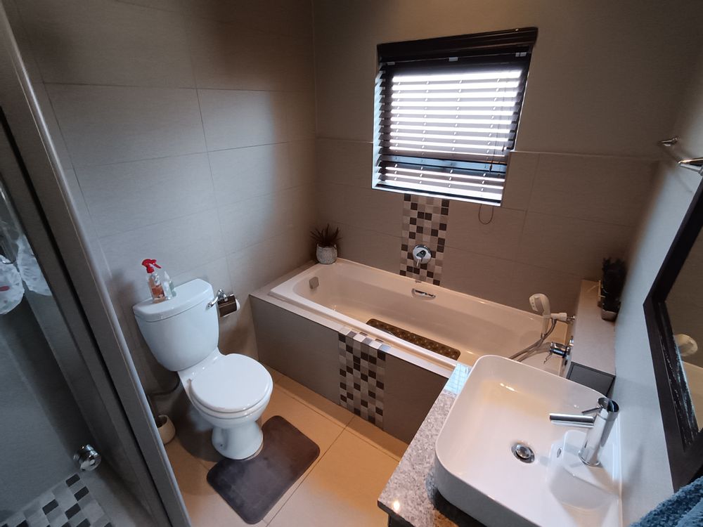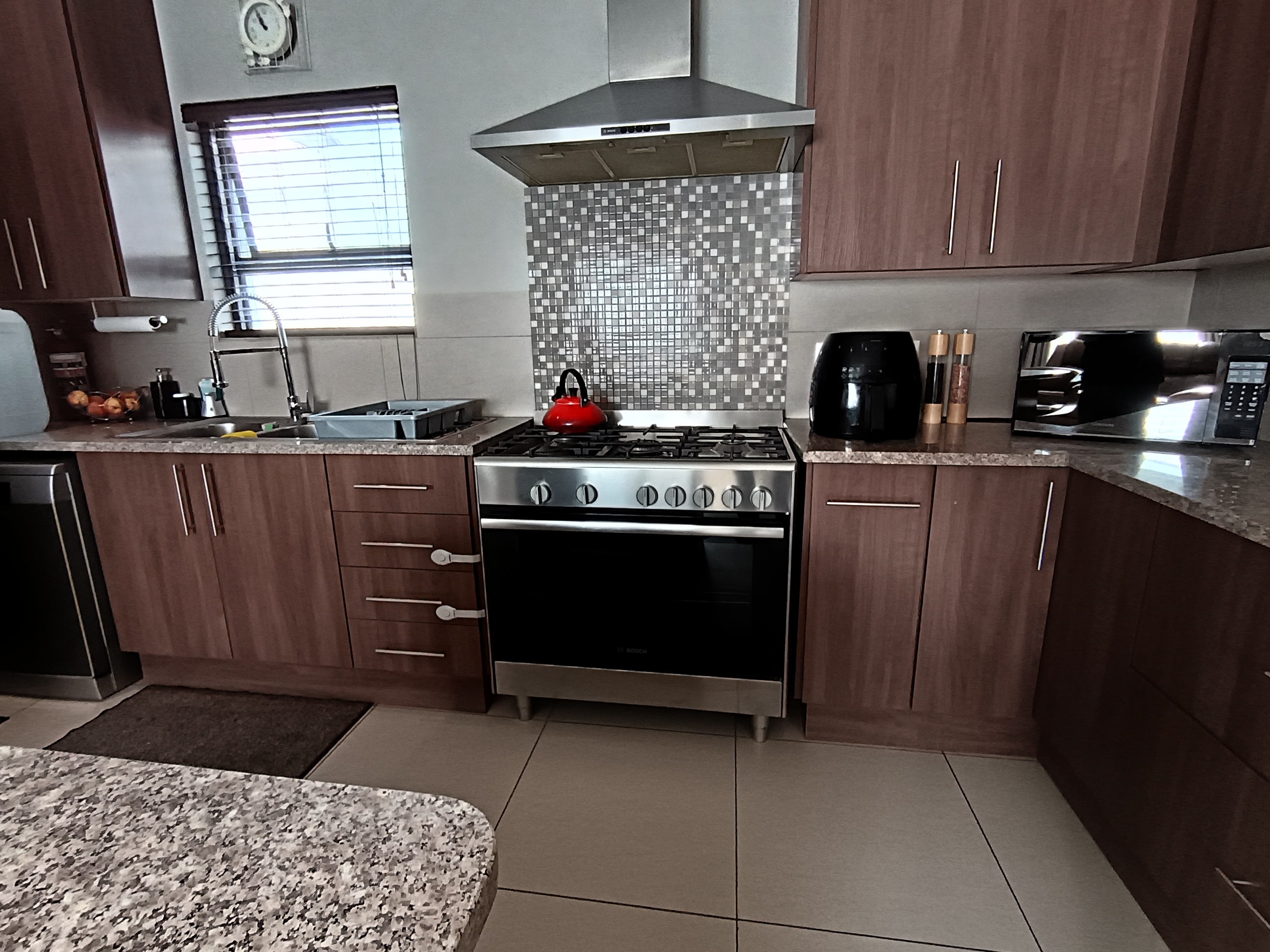 This contemporary double-storey home offers a perfect blend of comfort and modern living. The top floor features three spacious bedrooms all with built-in cupboards, including a luxurious ensuite in the main bedroom. The two full bathrooms features modern fixtures designed with both functionality and elegance in mind. There is also a third guest bathroom situated on the ground floor for added convenience. The modern kitchen is well equipped with high quality kitchen appliances featuring a 900mm gas stove, oven and extractor fan.