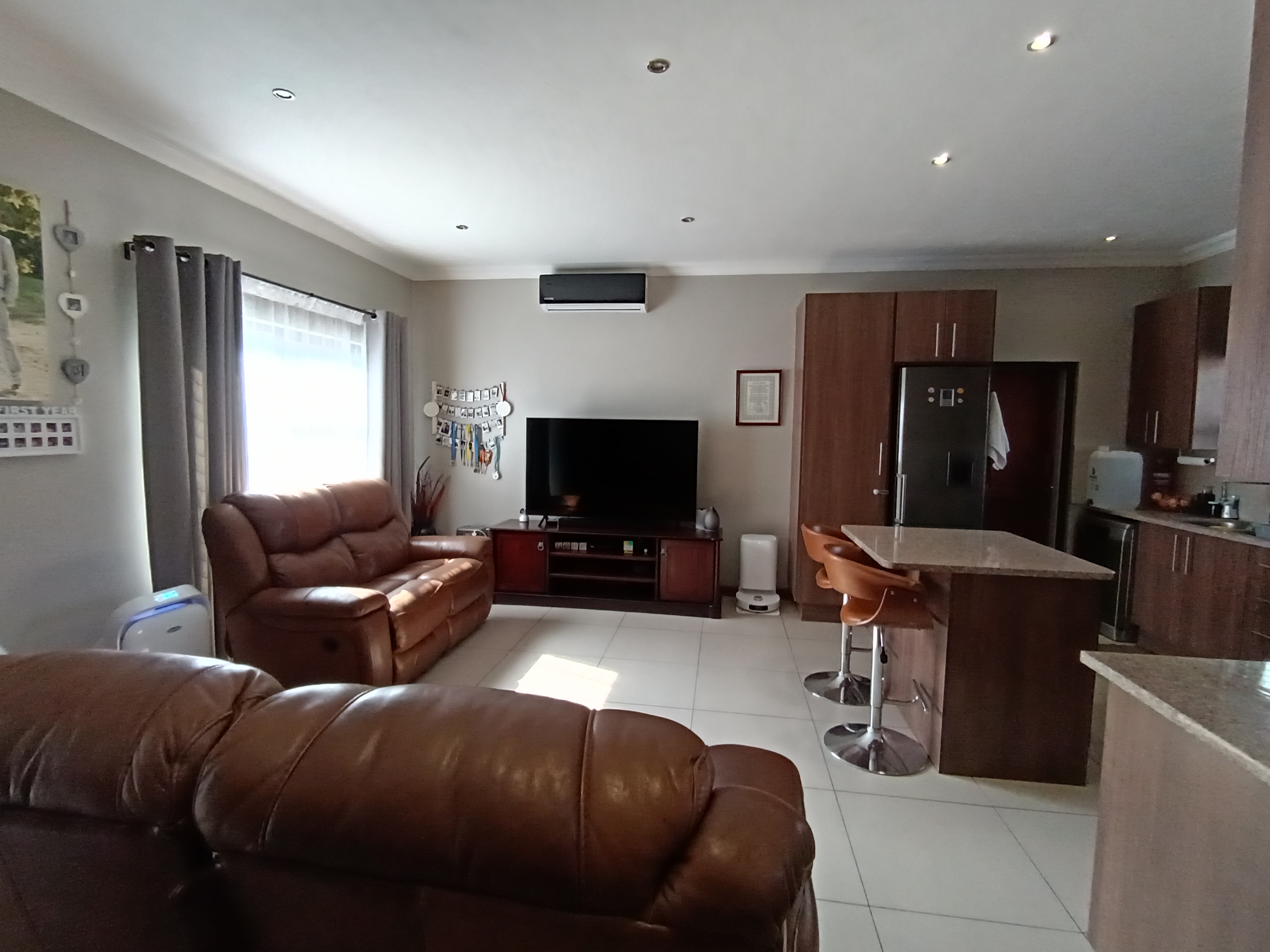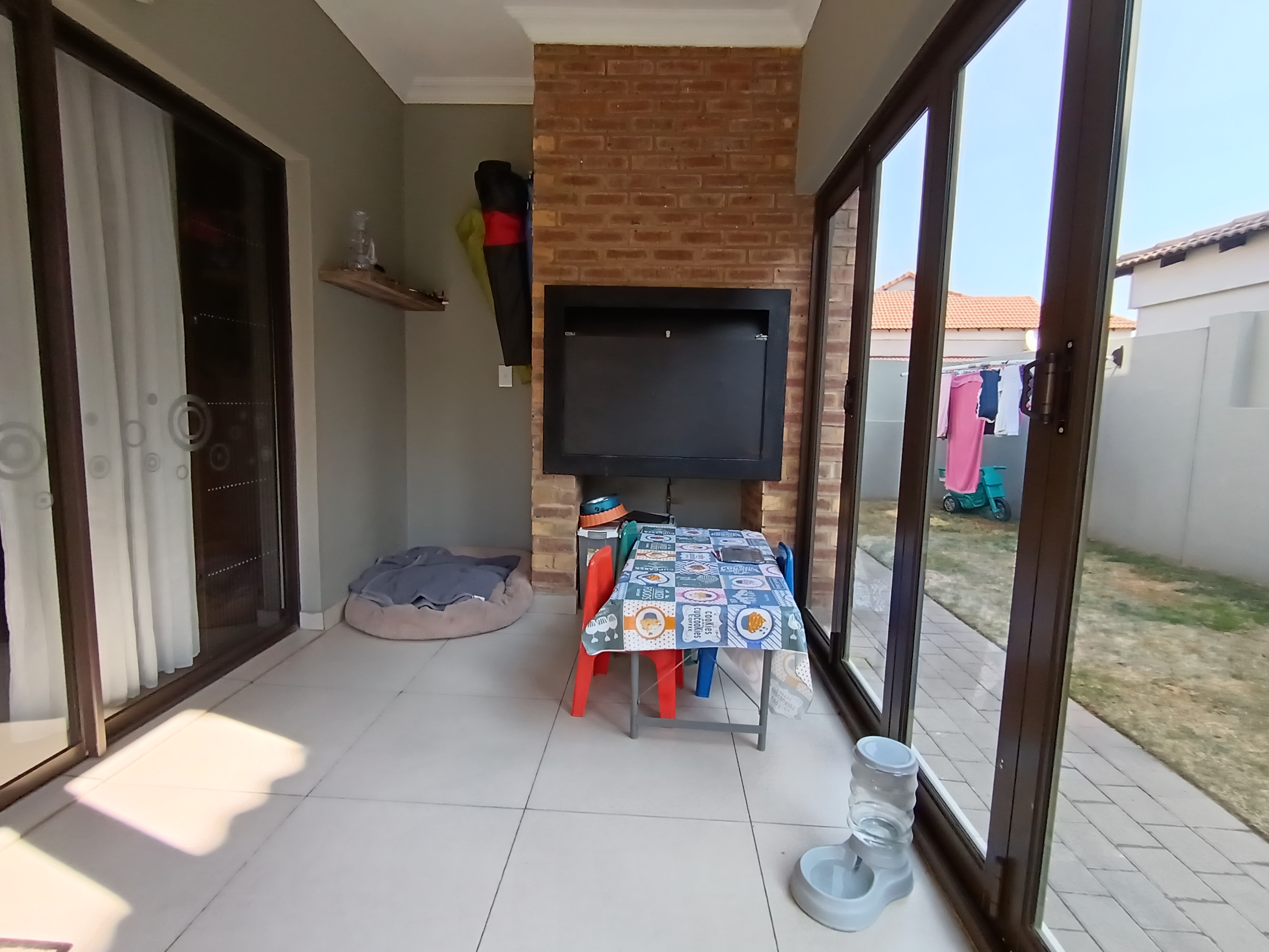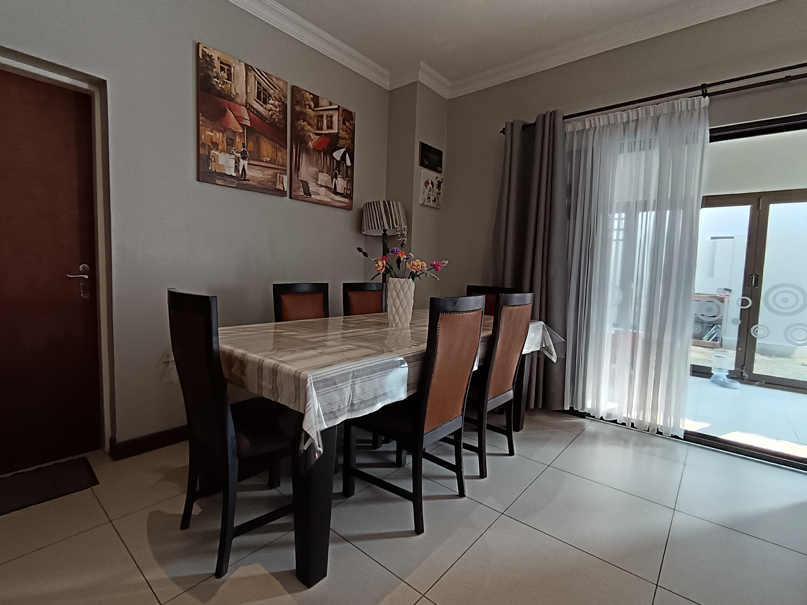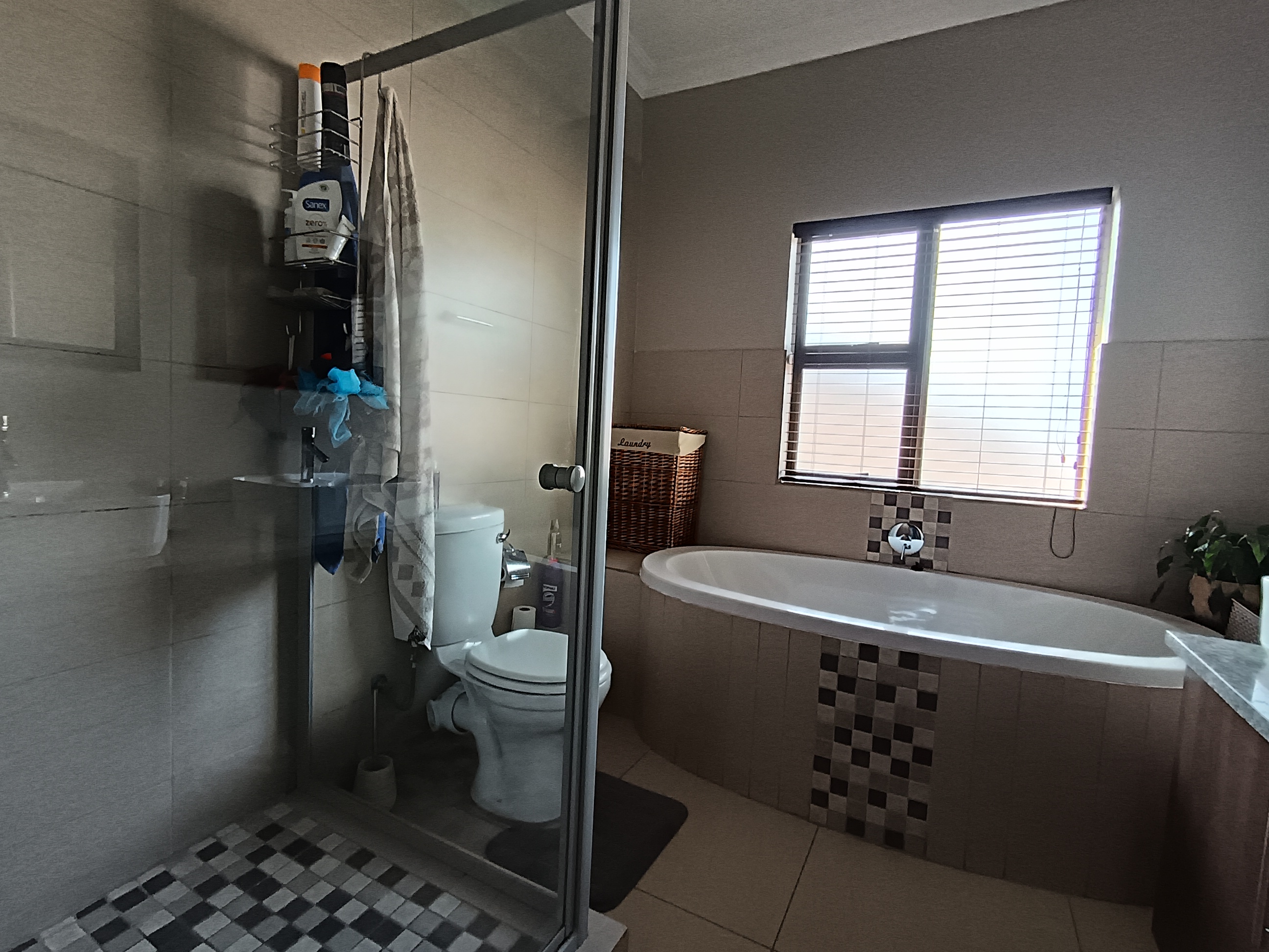 The dining area flows seamlessly into the covered patio which includes a built-in braai perfect for entertaining guests. The property also boasts a double automated garage, offering secure and convenient parking. Other extras includes, stacking doors, Trellidor gates, burglar bars, alarm system with indoor and outdoor beams, and aircons in the three bedrooms and living area. With it's sleek design , modern touches, and thoughtful layout, this home is perfect for families or professionals looking for a move-in ready place.