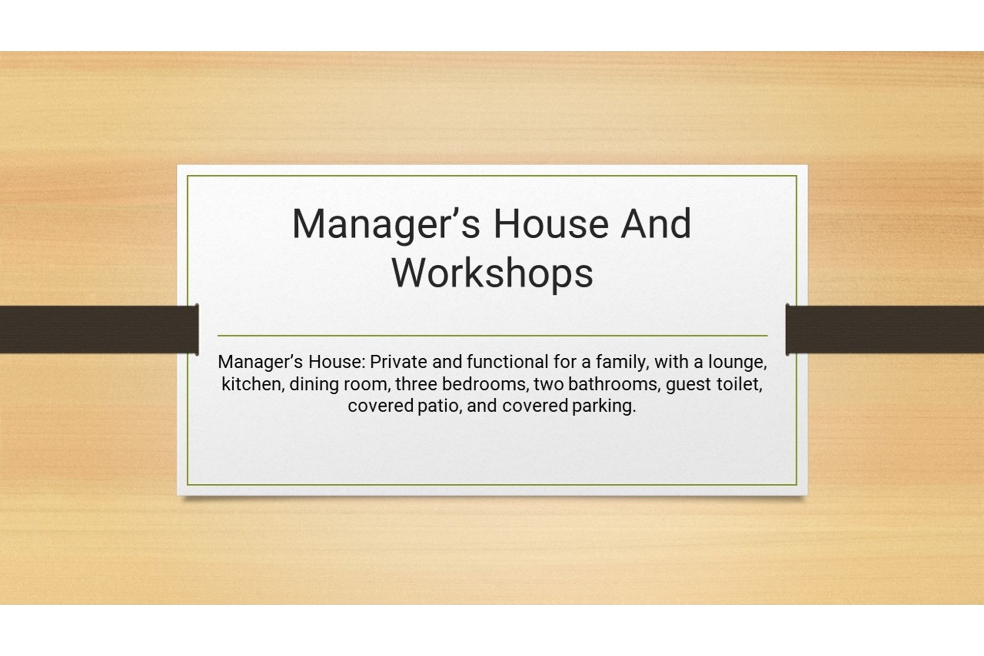 Manager’s House: Private and functional for a family, with a lounge, kitchen, dining room, three bedrooms, two bathrooms, guest toilet, covered patio, and covered parking.
