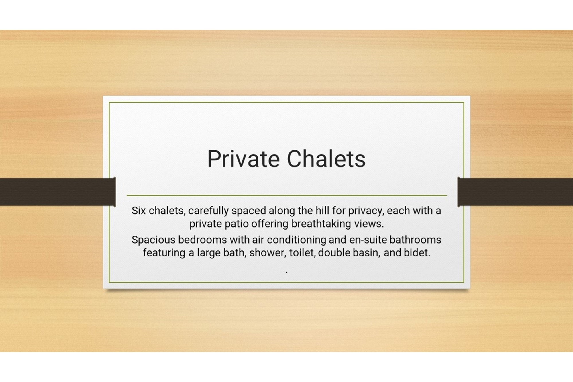 Exclusive Chalets: Six chalets, carefully spaced along the hill for privacy, each with a private patio offering breathtaking views.