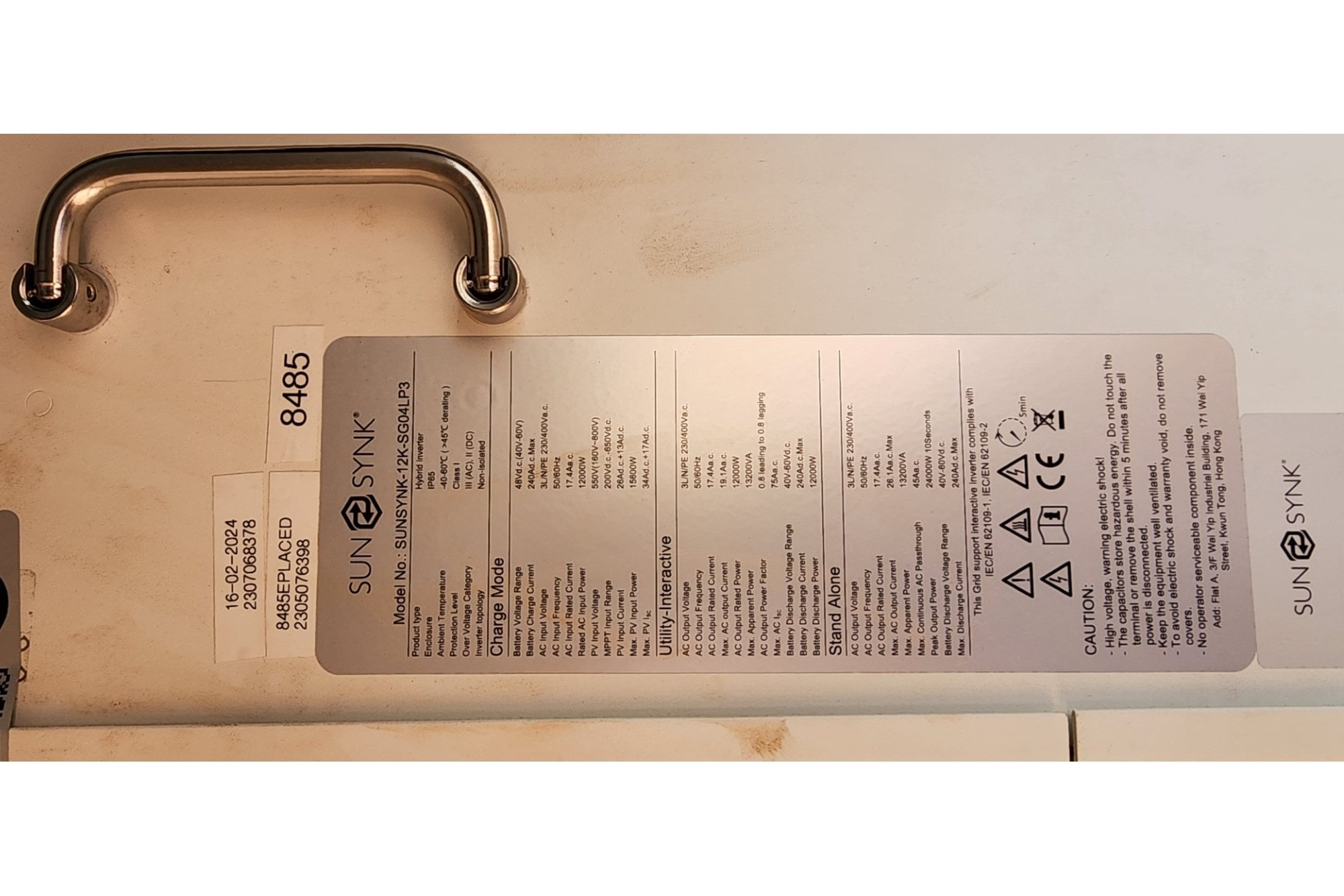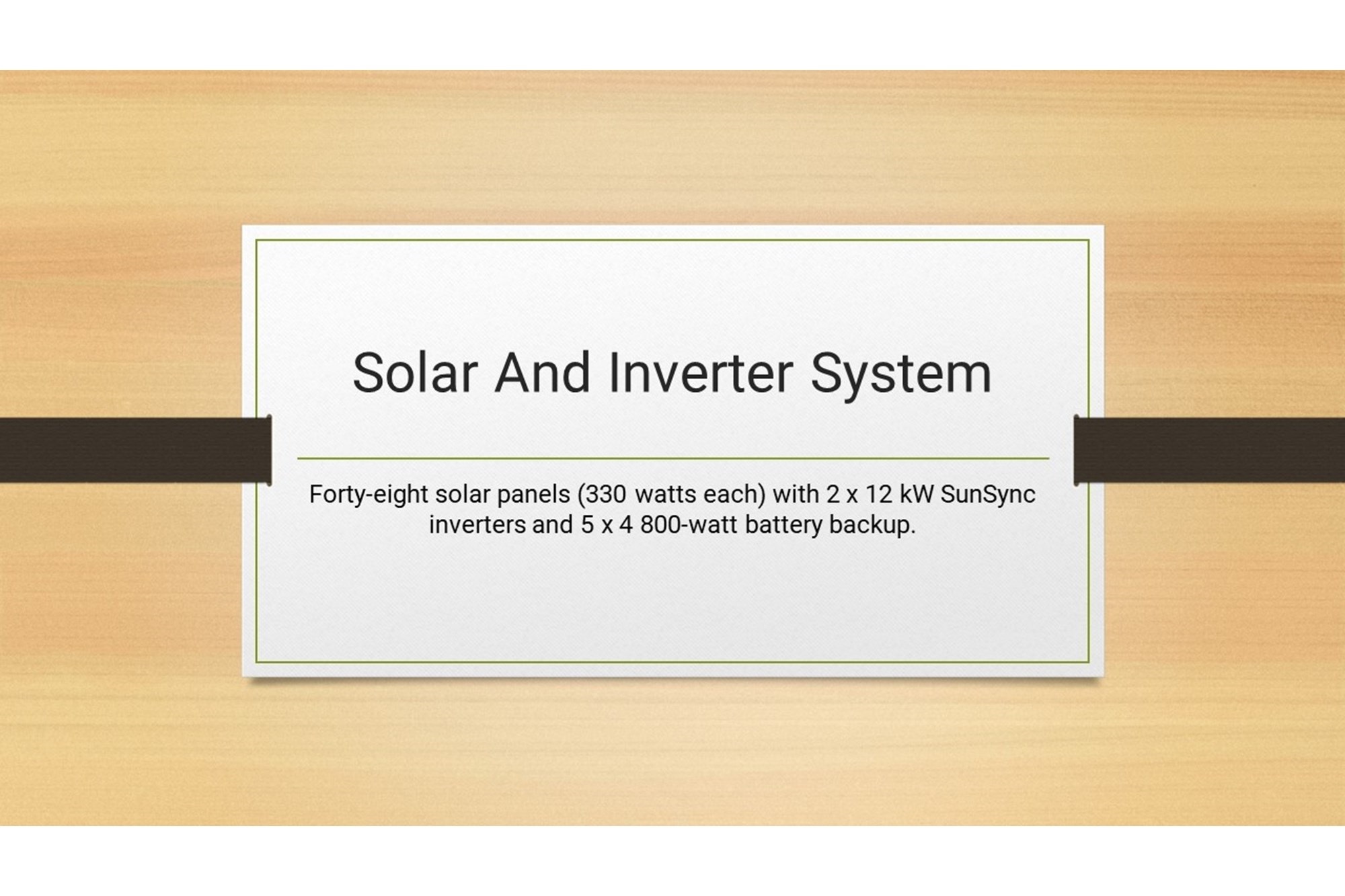 Solar Panels: Forty-eight solar panels (330 watts each) with 2 x 12 kW SunSync inverters and 5 x 4 800 watt battery backup.