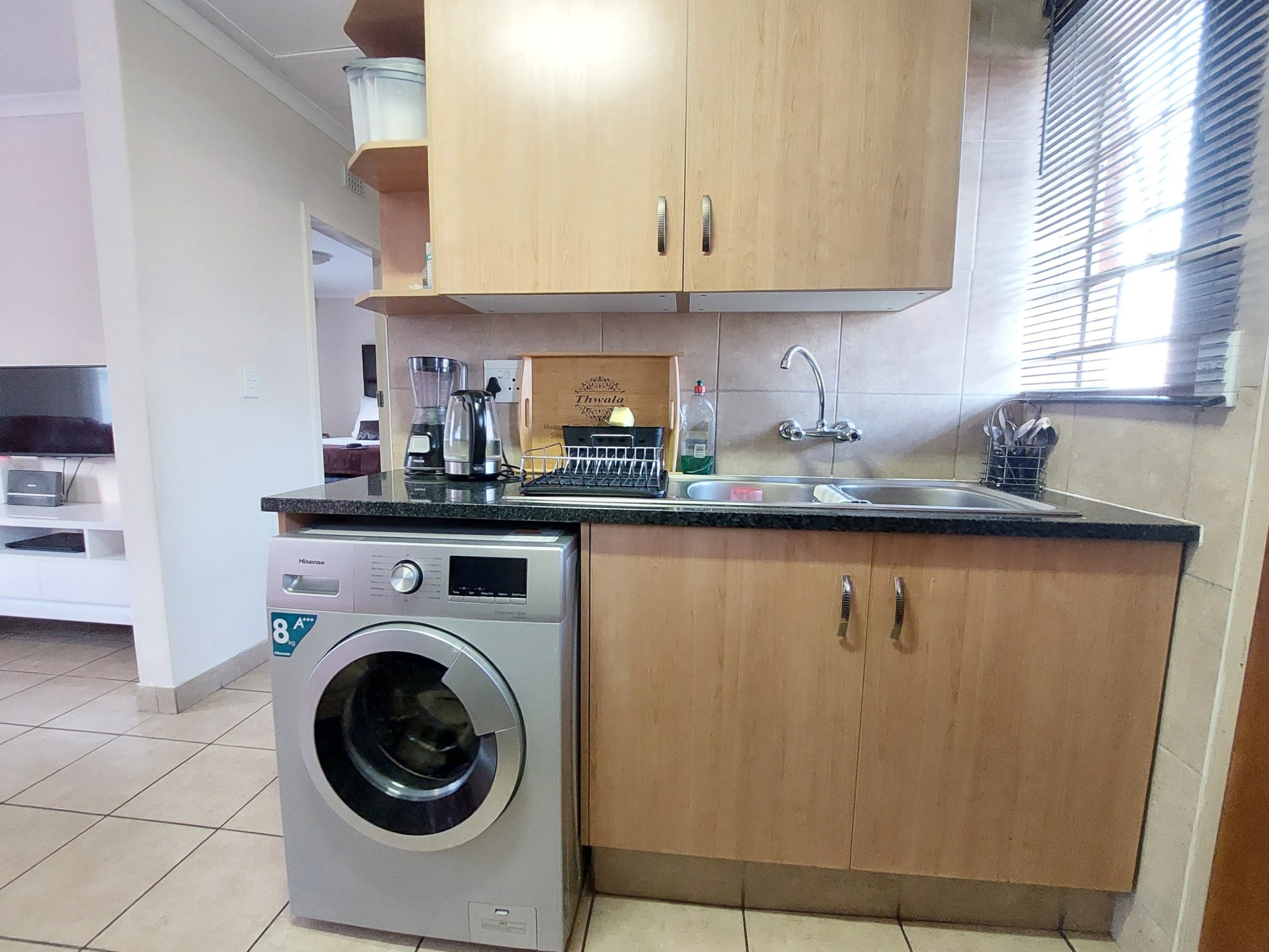 Open plan kitchen with granite tops and space for a fridge