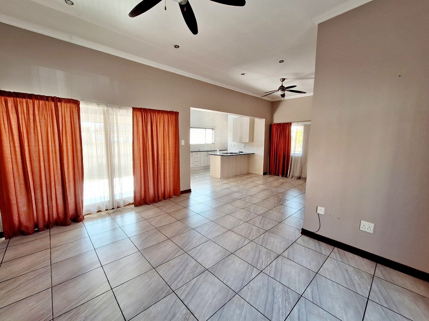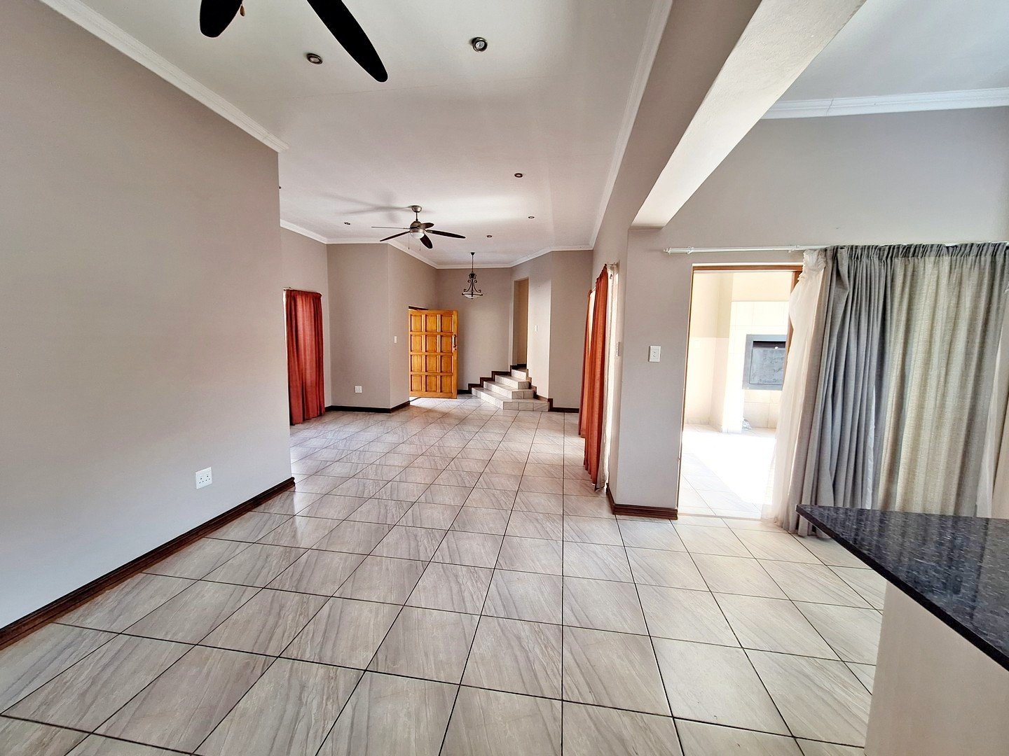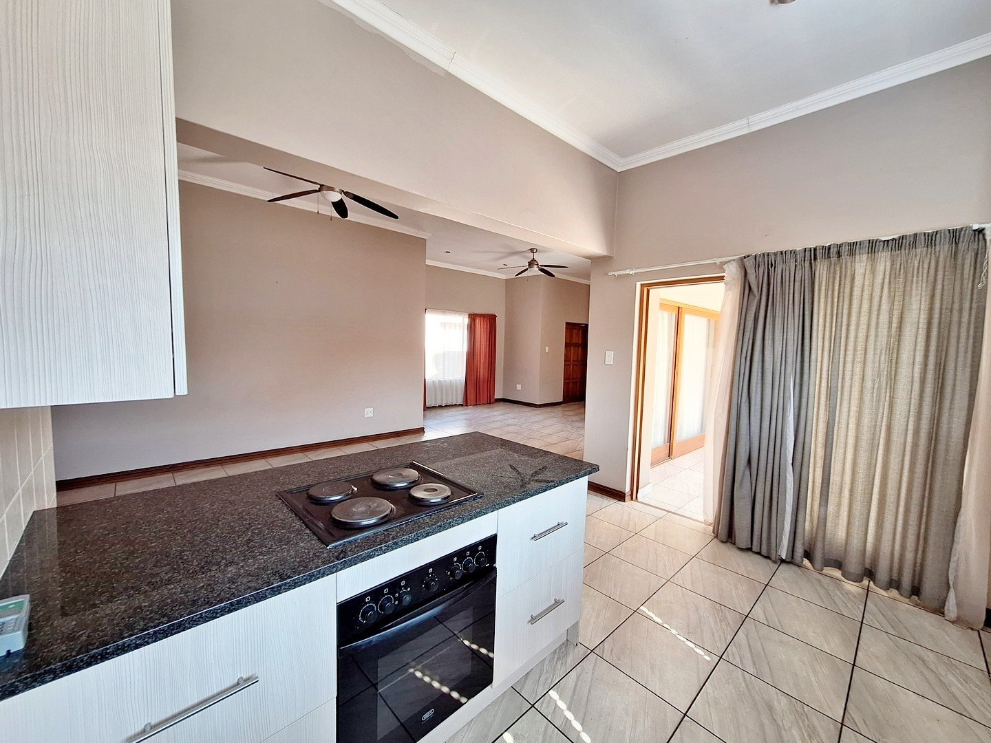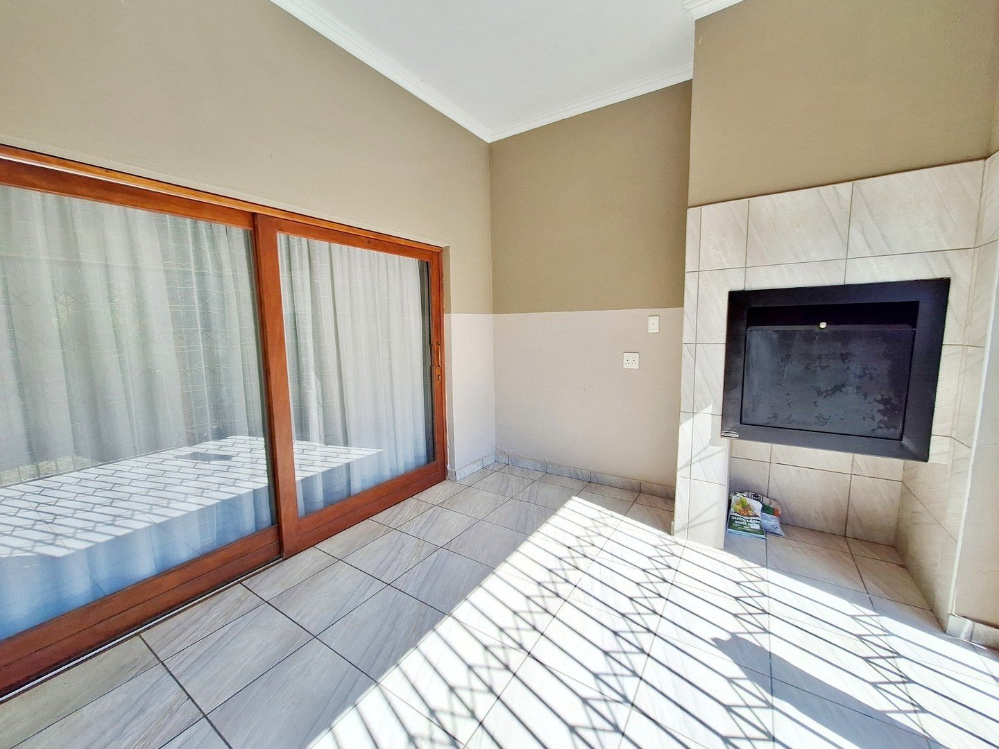2 spacious living areas are open plan and consists of a lounge and dining room. The covered patio has a built-in braai. All these effortlessly flows into the beautiful kitchen.