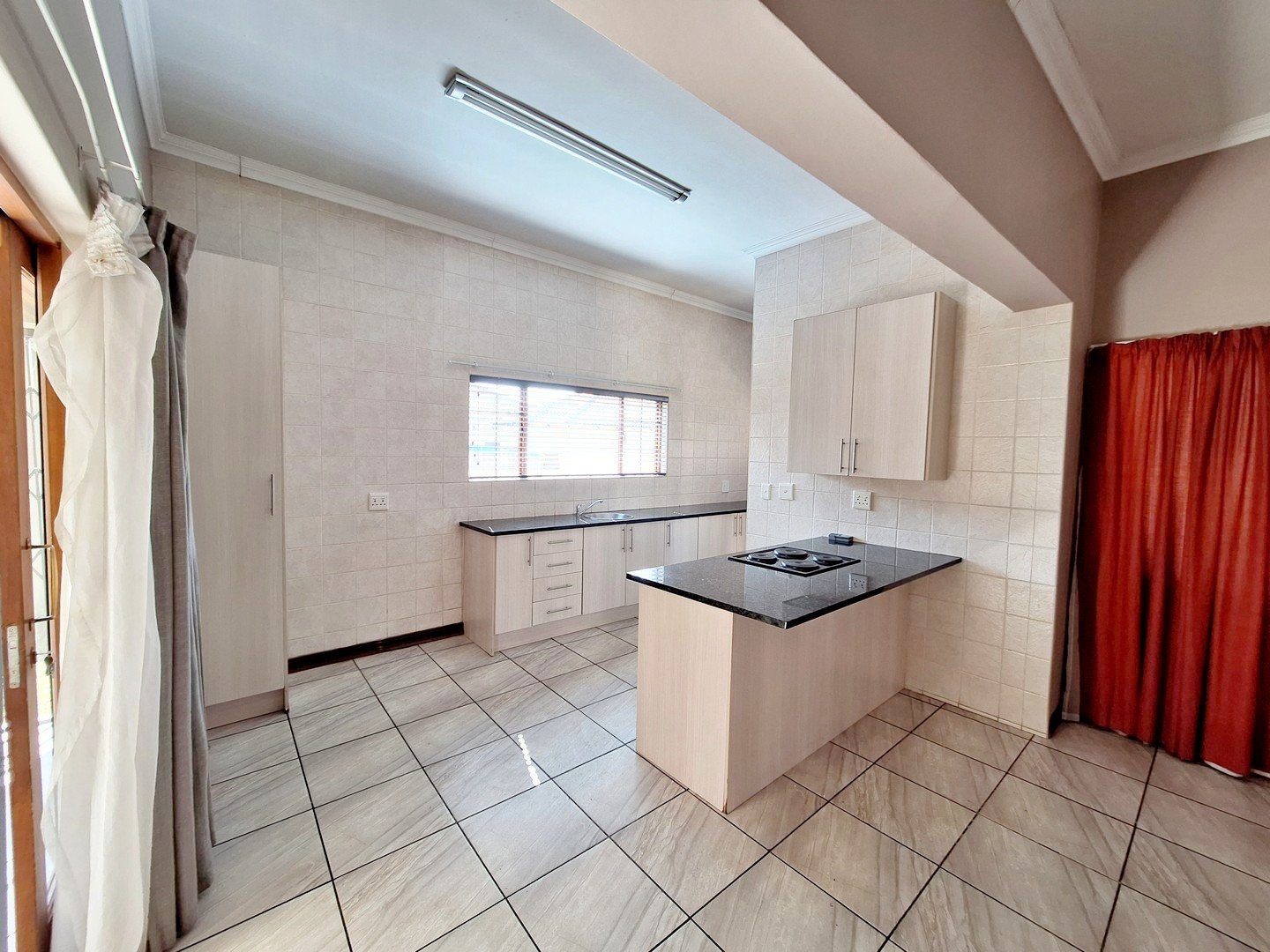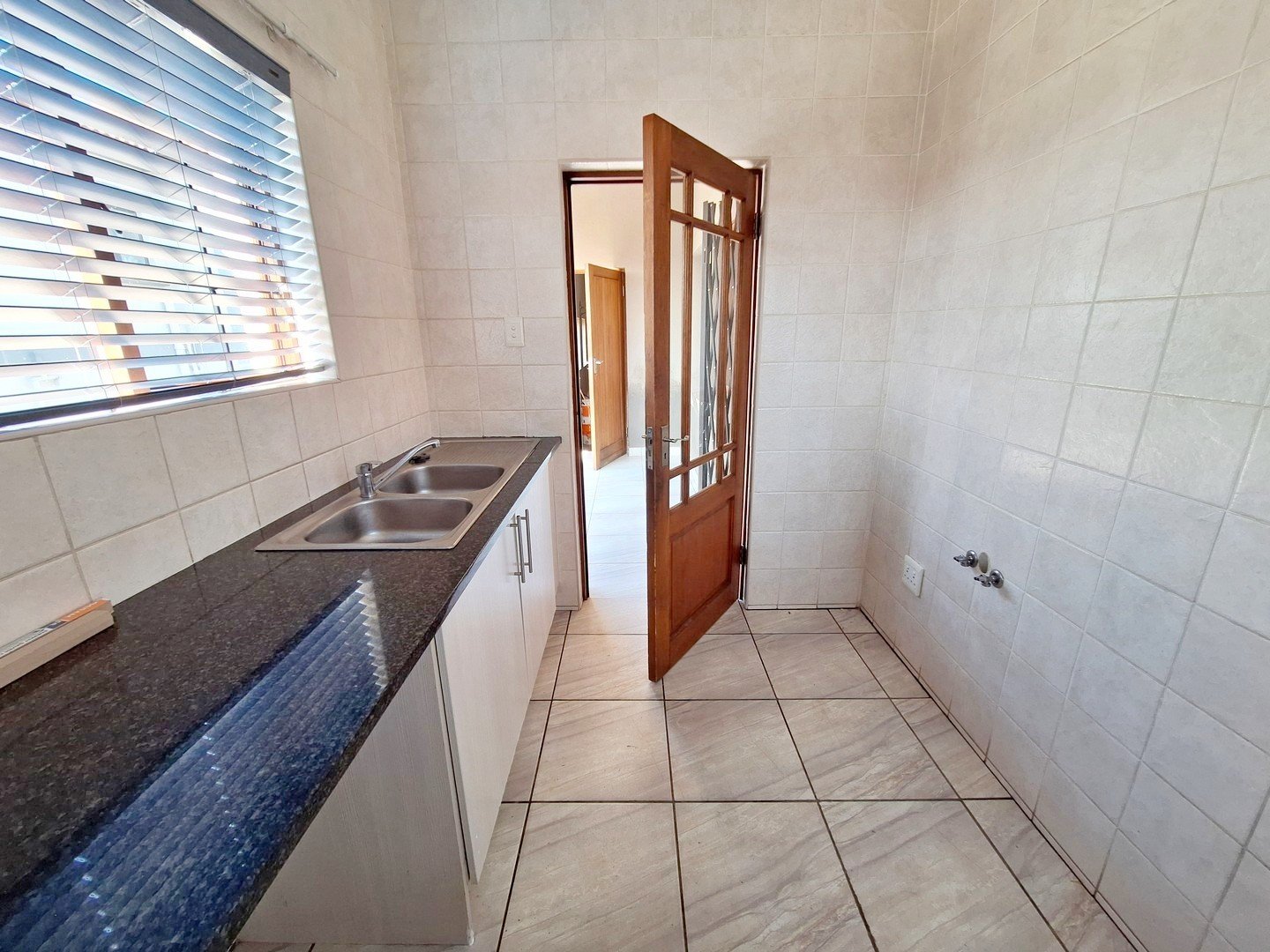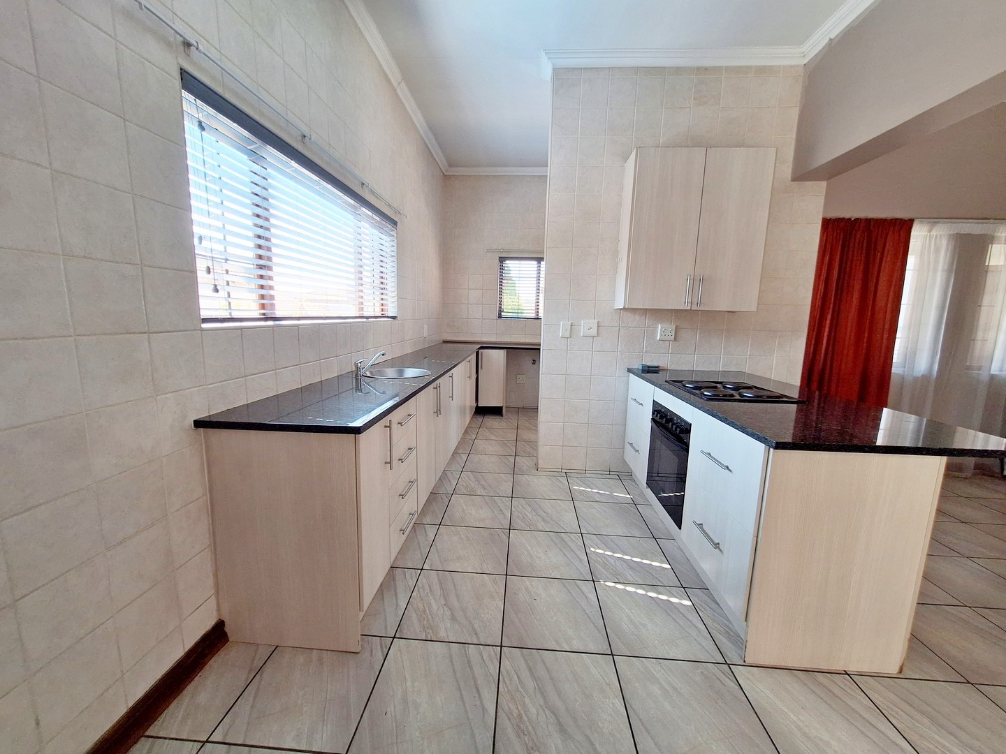 The kitchen has ample cupboard space, black granite counter tops, an undercounter oven and hob and a separate scullery / laundry. The scullery/laundry has space for most major appliances and leads into the double garage, with additional parking in front of the garage.