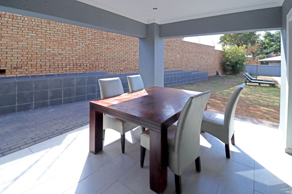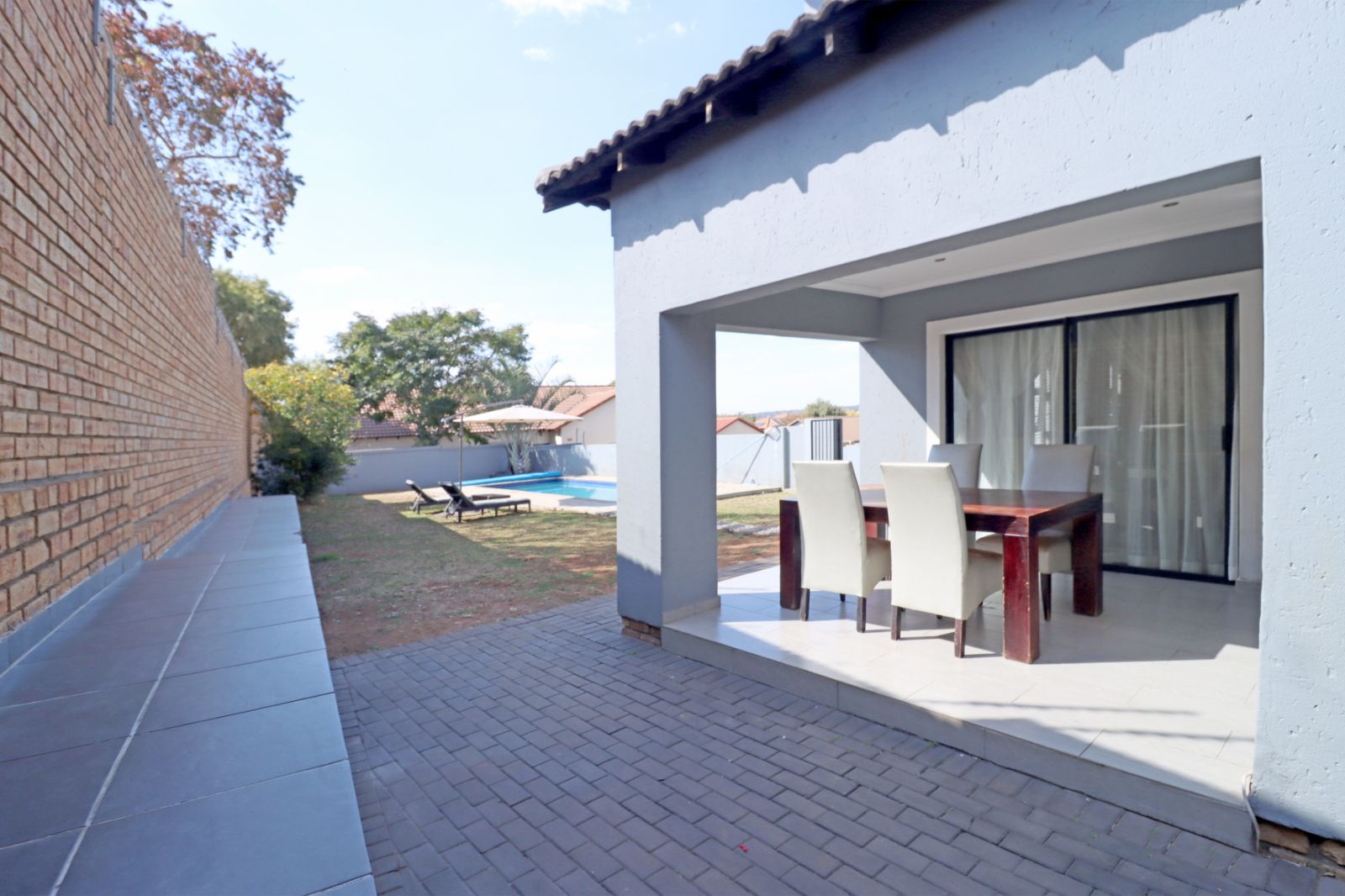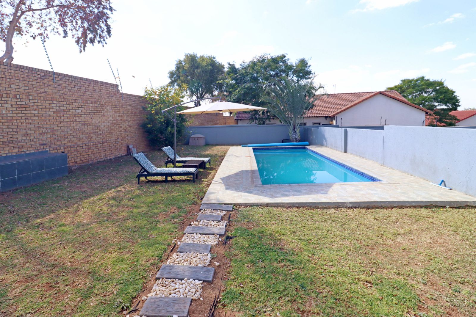 Open-plan living links a sleek, minimalistic granite-top kitchen with breakfast nook to dining & lounge areas that spill through glass doors to a covered patio with built-in braai, established garden, and sparkling ±27 sqm swimming pool with child-safety cover. Weekends sorted!
