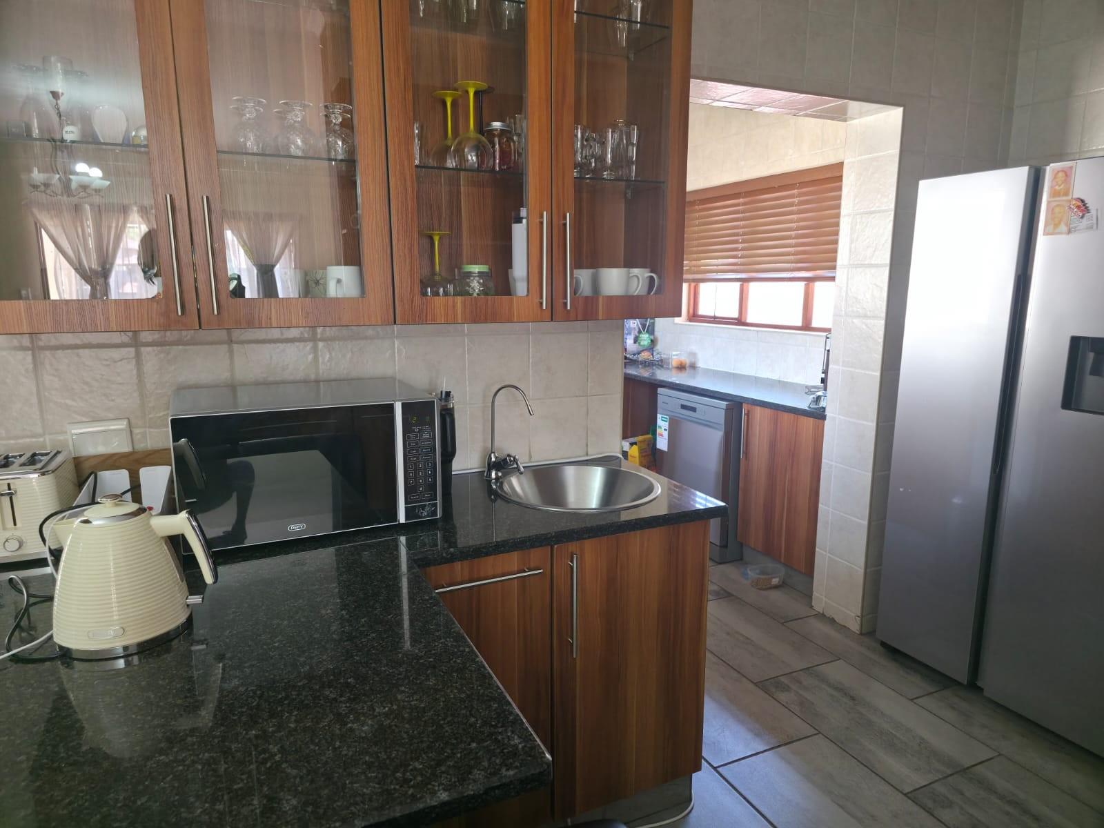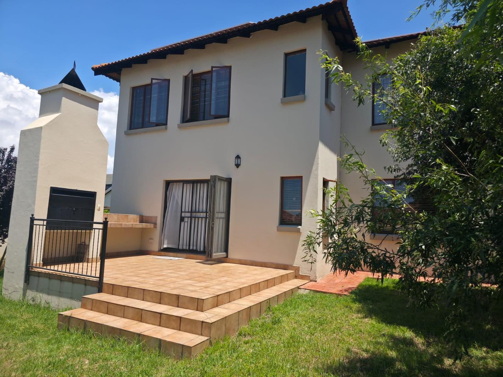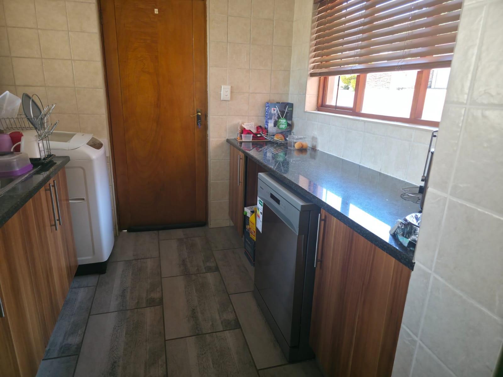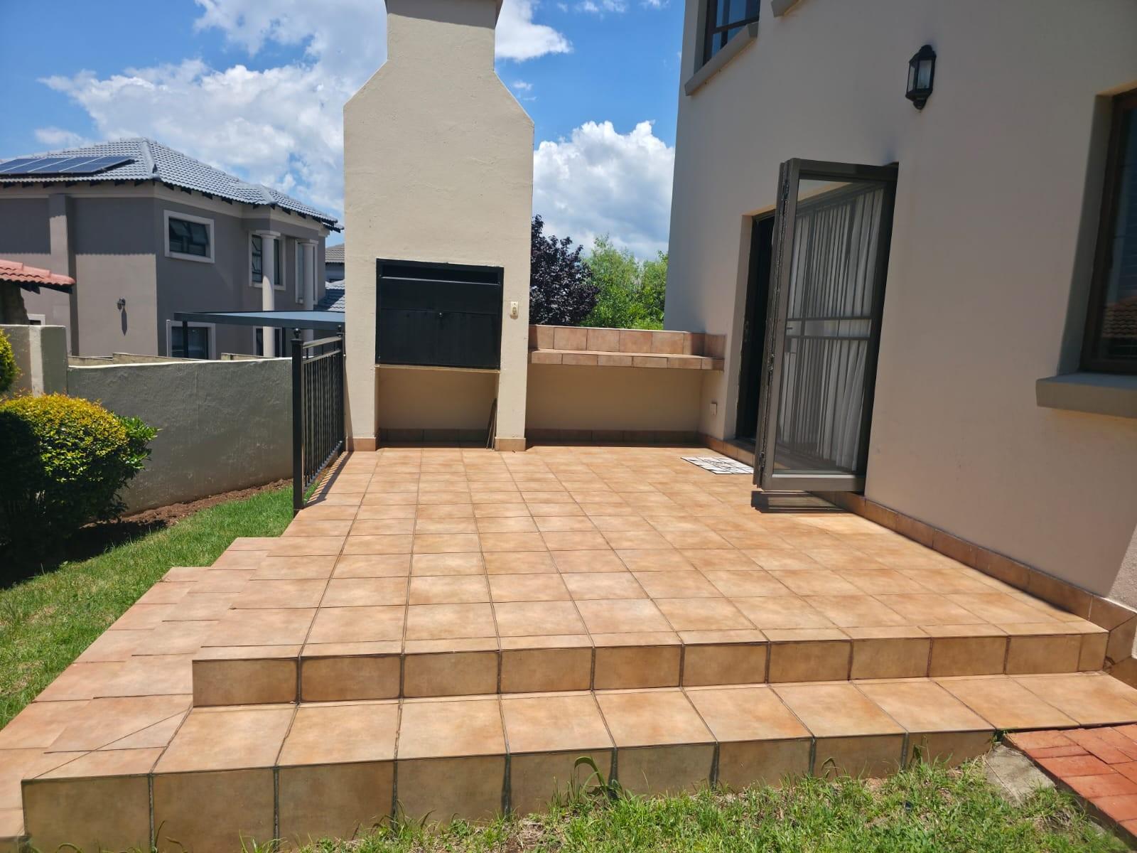 The home offers a modern kitchen with a separate scullery, ideal for convenience and extra storage. Sliding doors lead to an outside patio with a built-in braai, perfect for entertaining.
