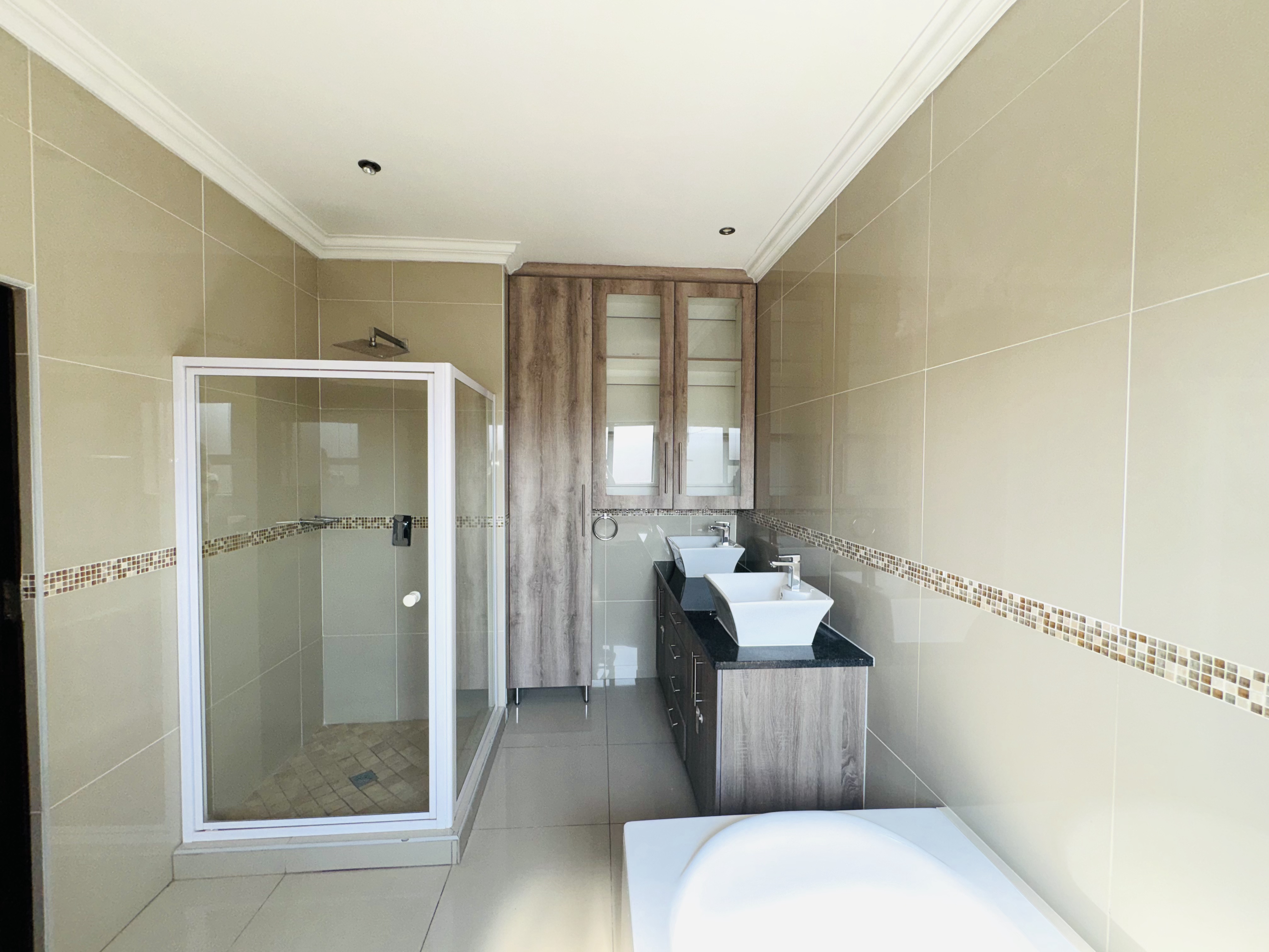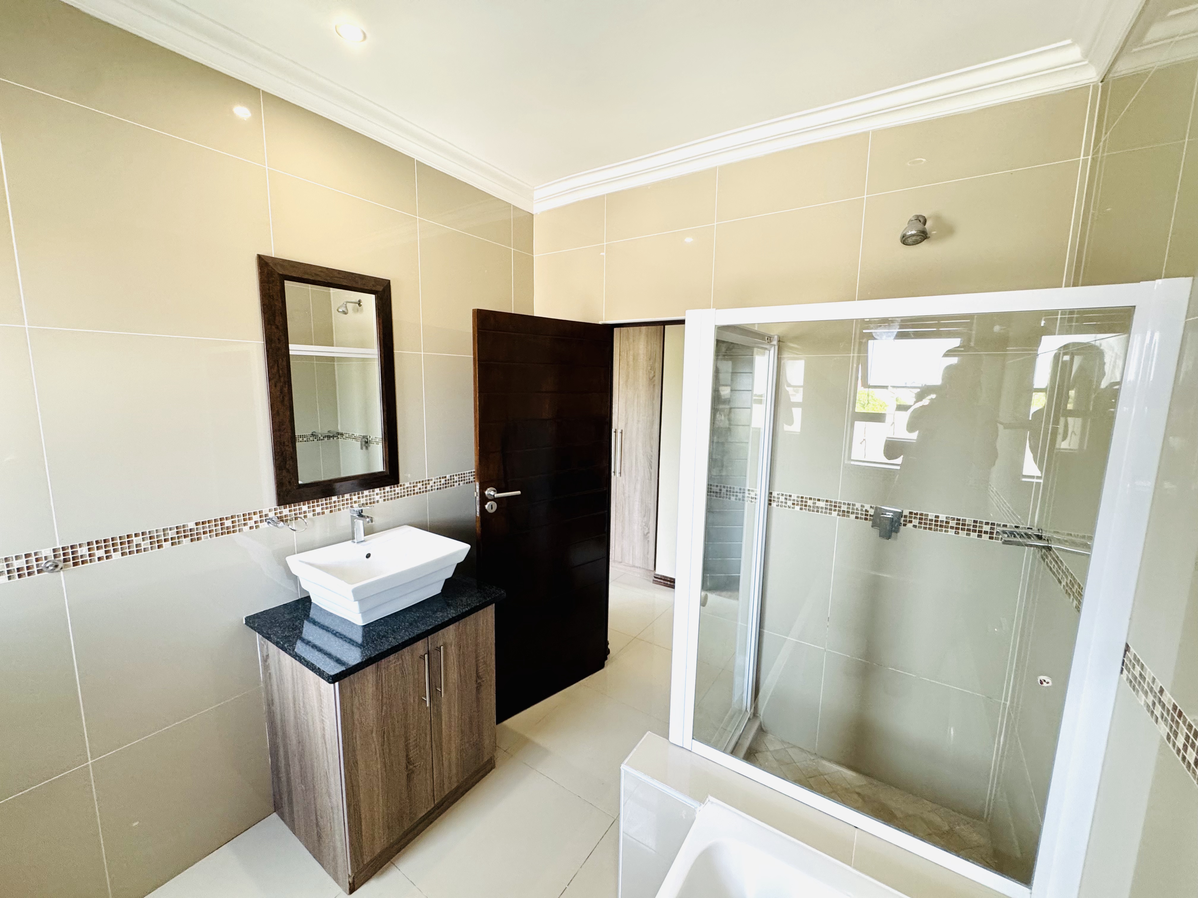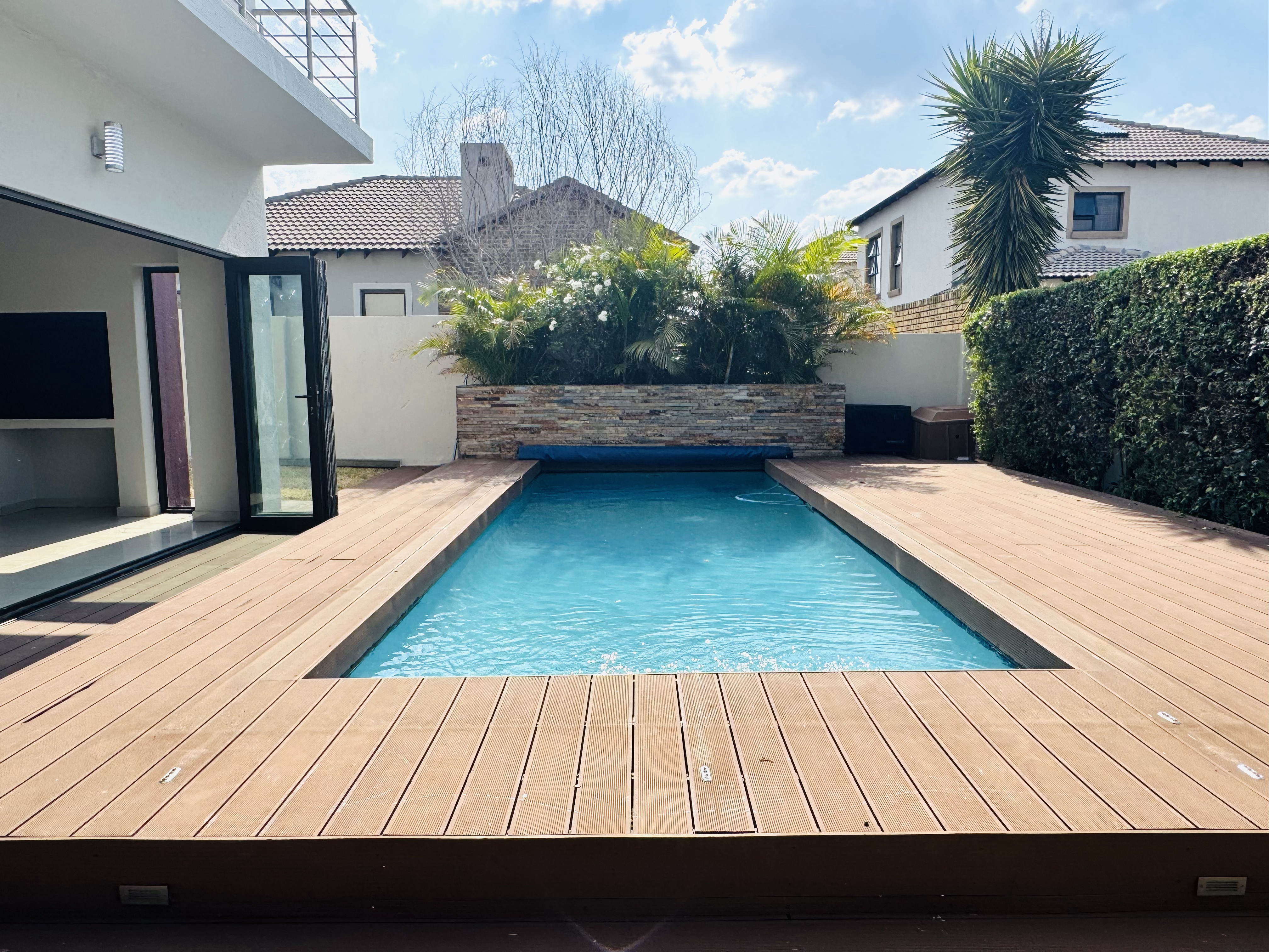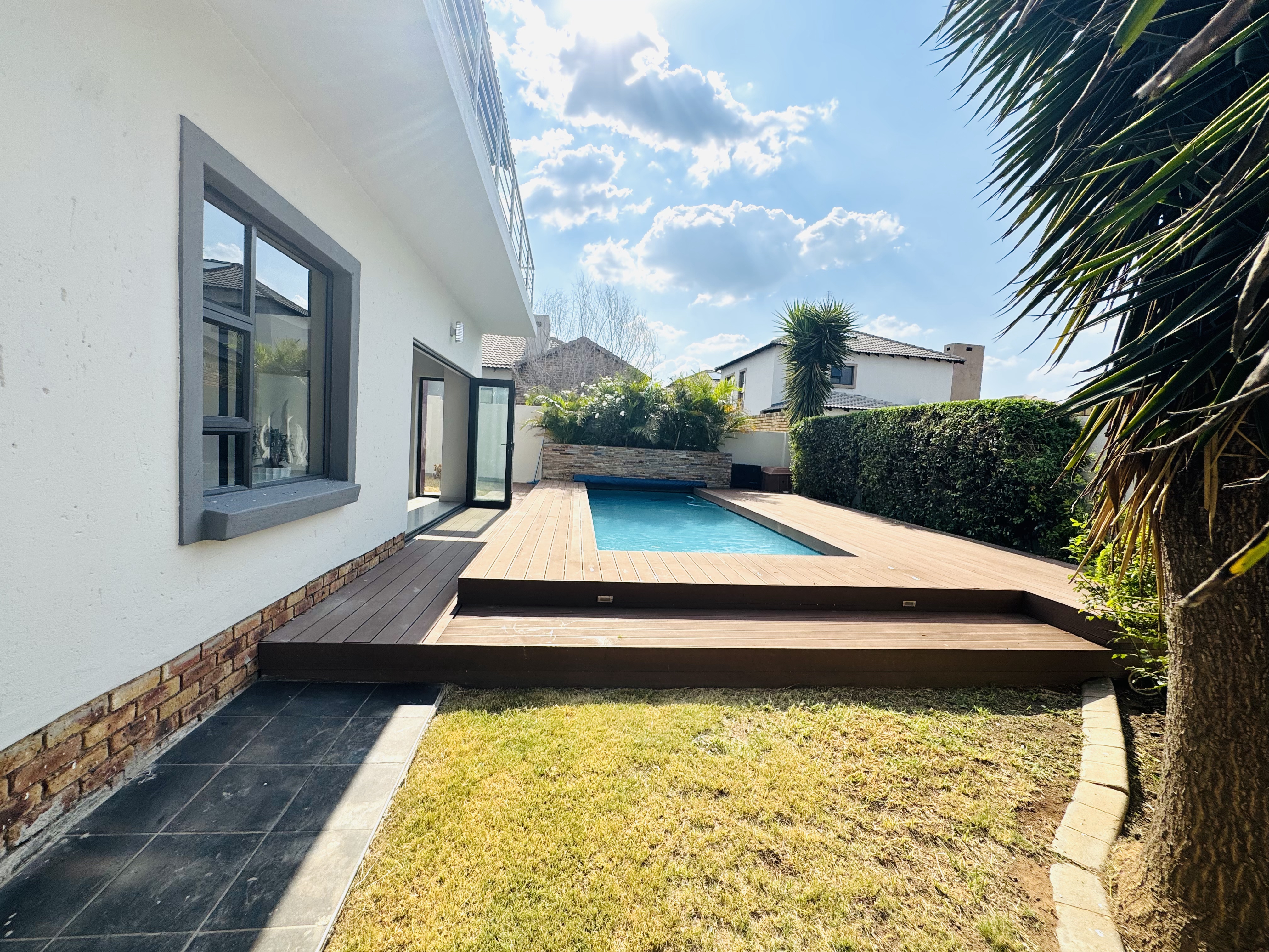 Accommodation is thoughtfully arranged. The home offers three generously sized bedrooms, each designed as a private retreat with refined finishes and excellent natural light. The master suite is elevated both literally and stylistically, opening onto a balcony that overlooks the pool and garden below—an ideal space for quiet mornings or sunset views. A guest cloakroom adds further convenience for entertaining.