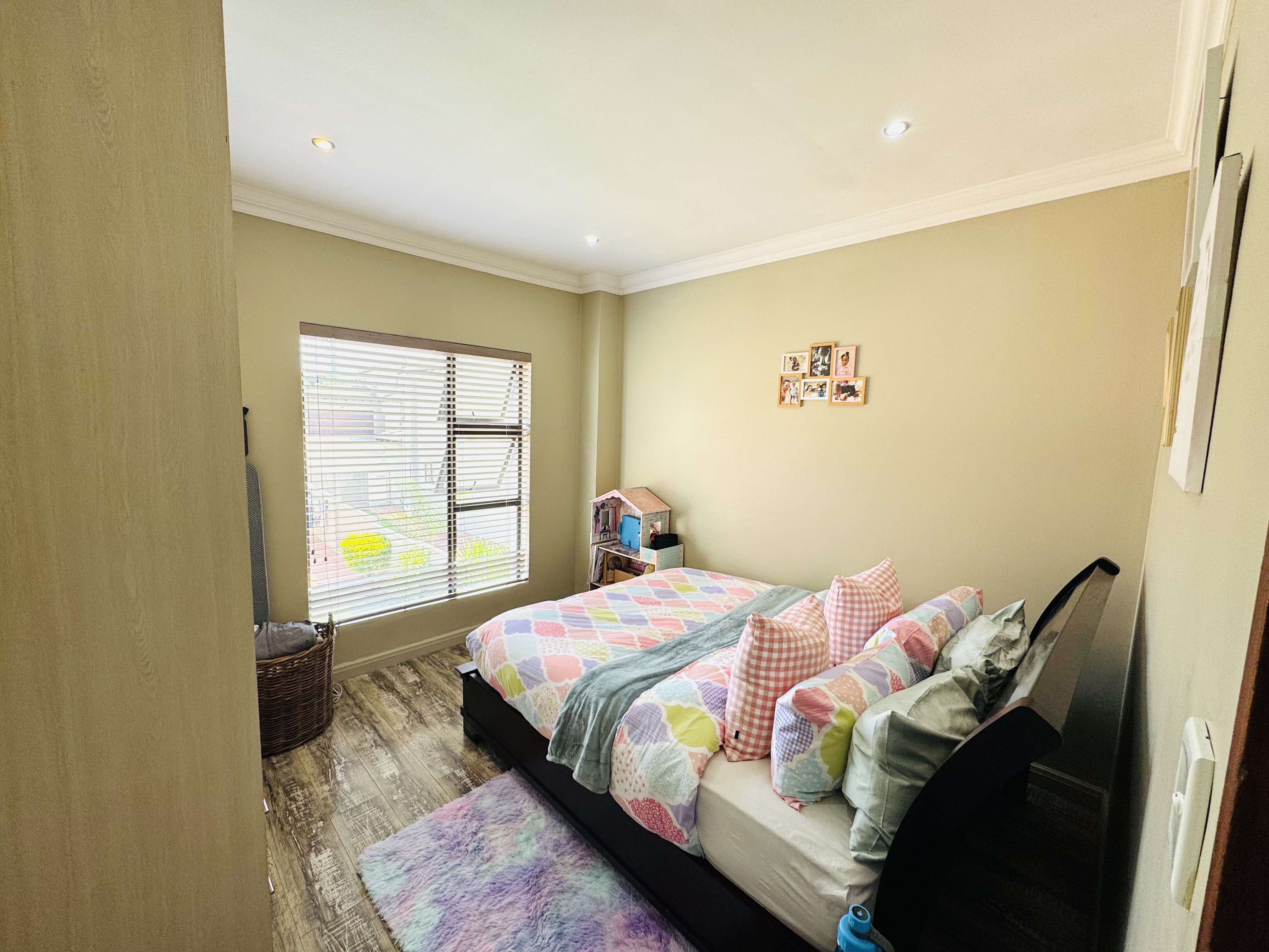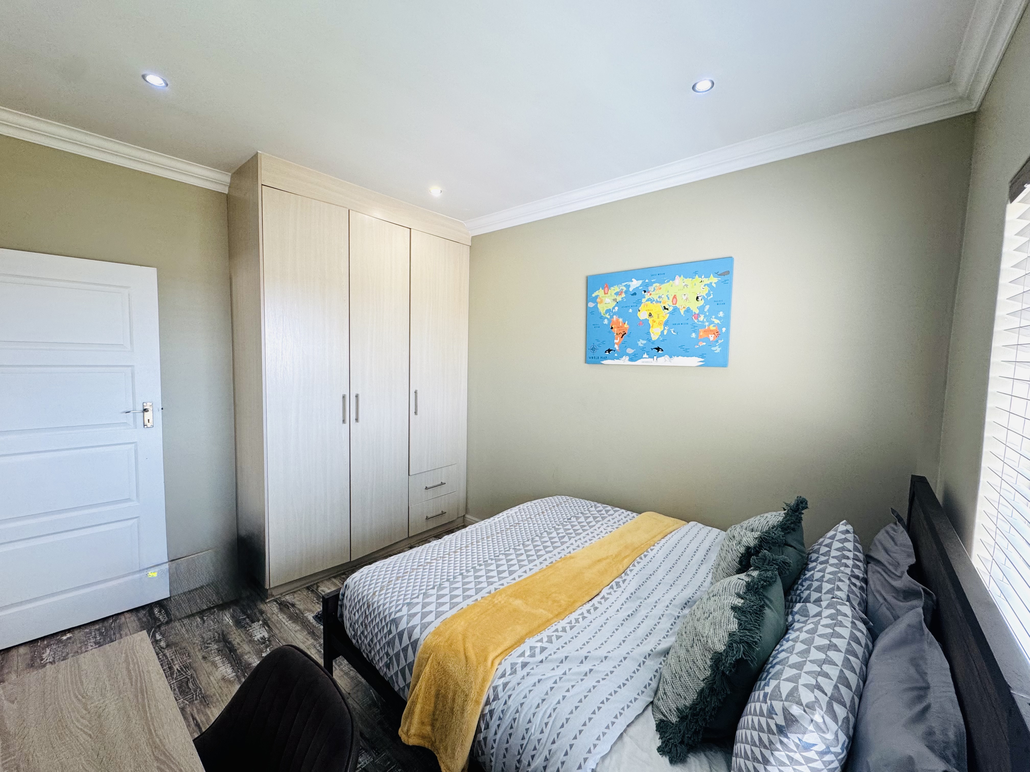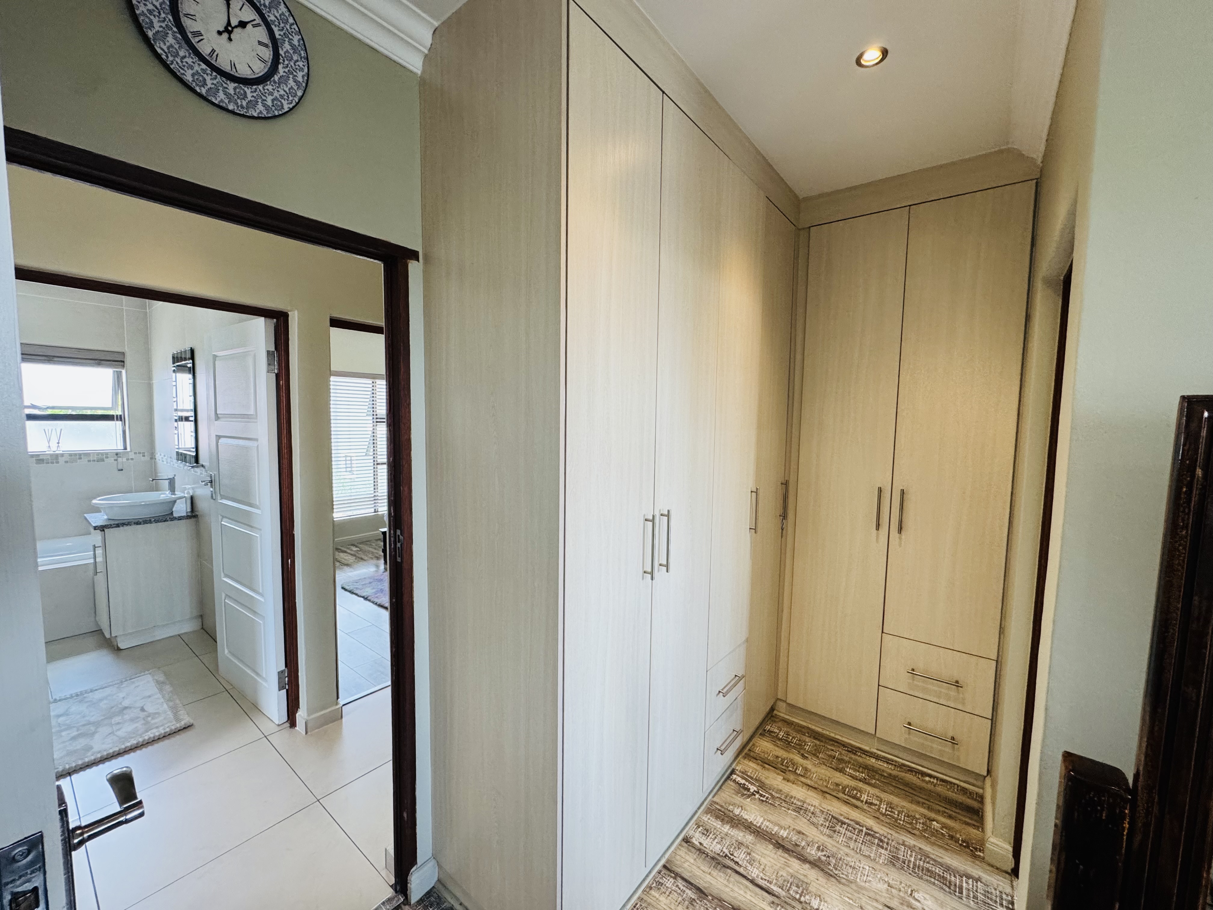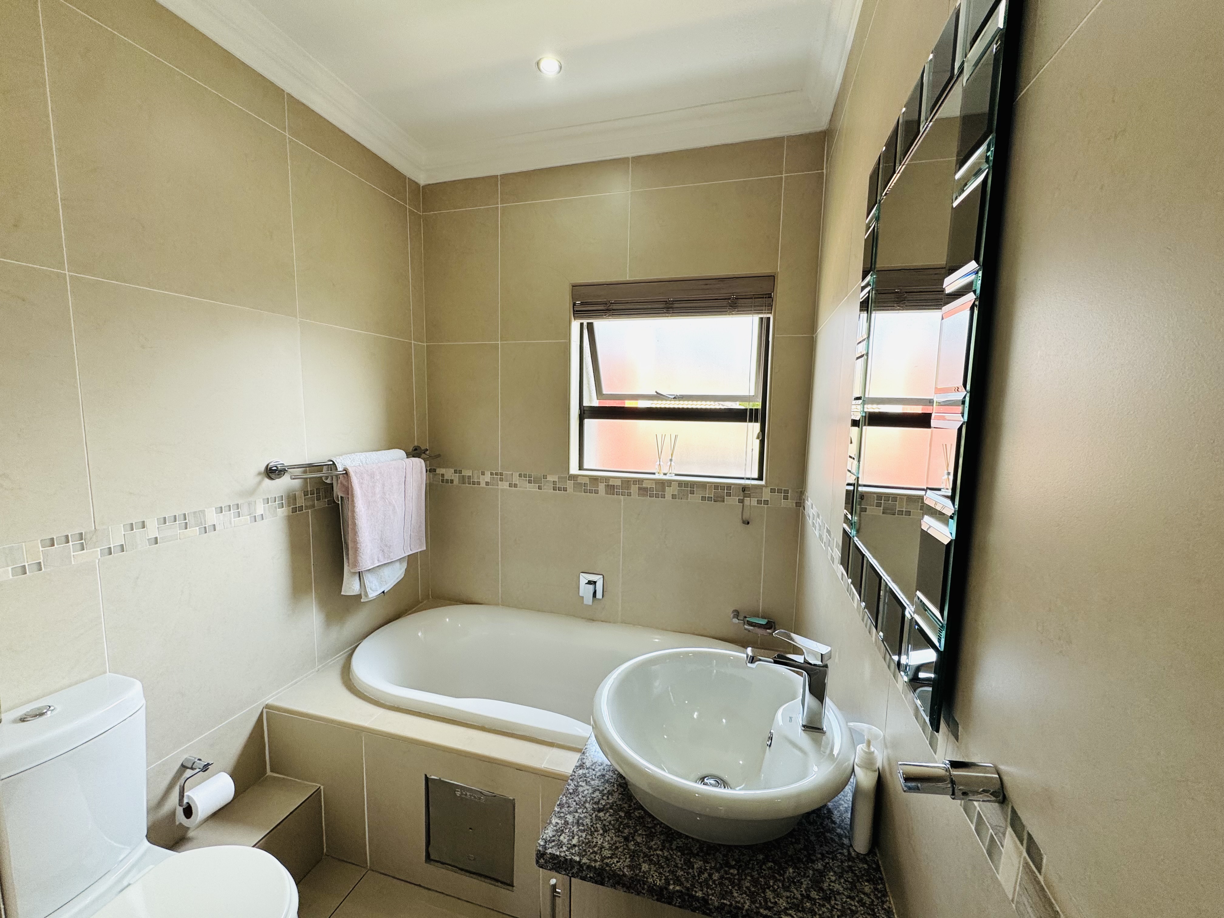 Upstairs, three inviting bedrooms provide tranquil retreats for the whole family. The main bedroom offers a serene escape with ample cupboard space and an elegant en suite bathroom.