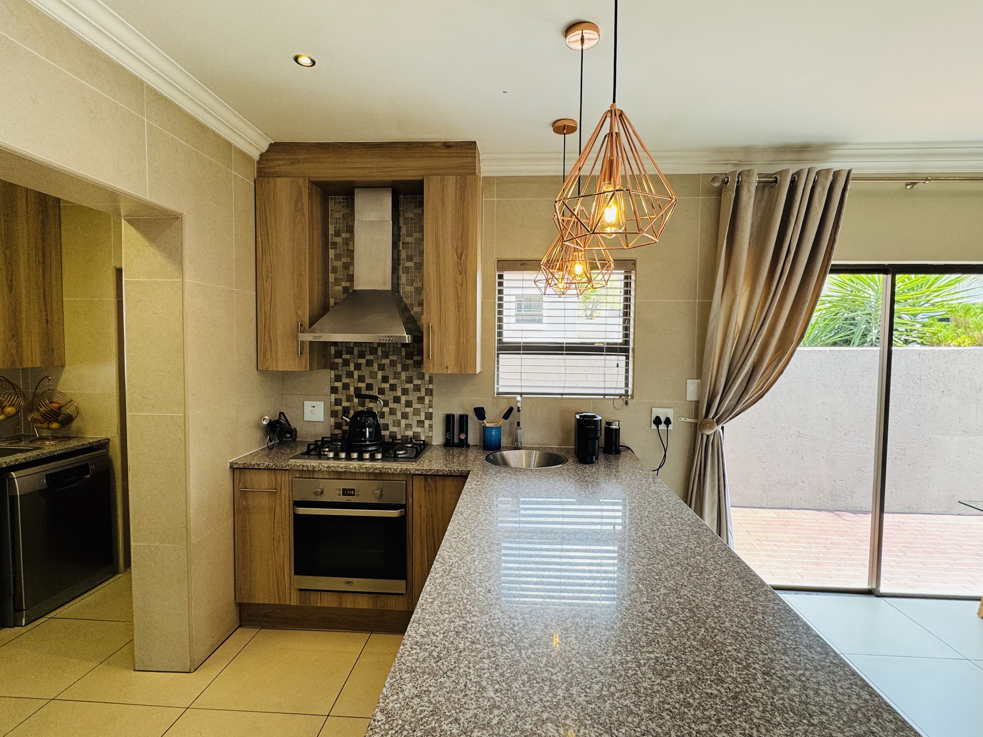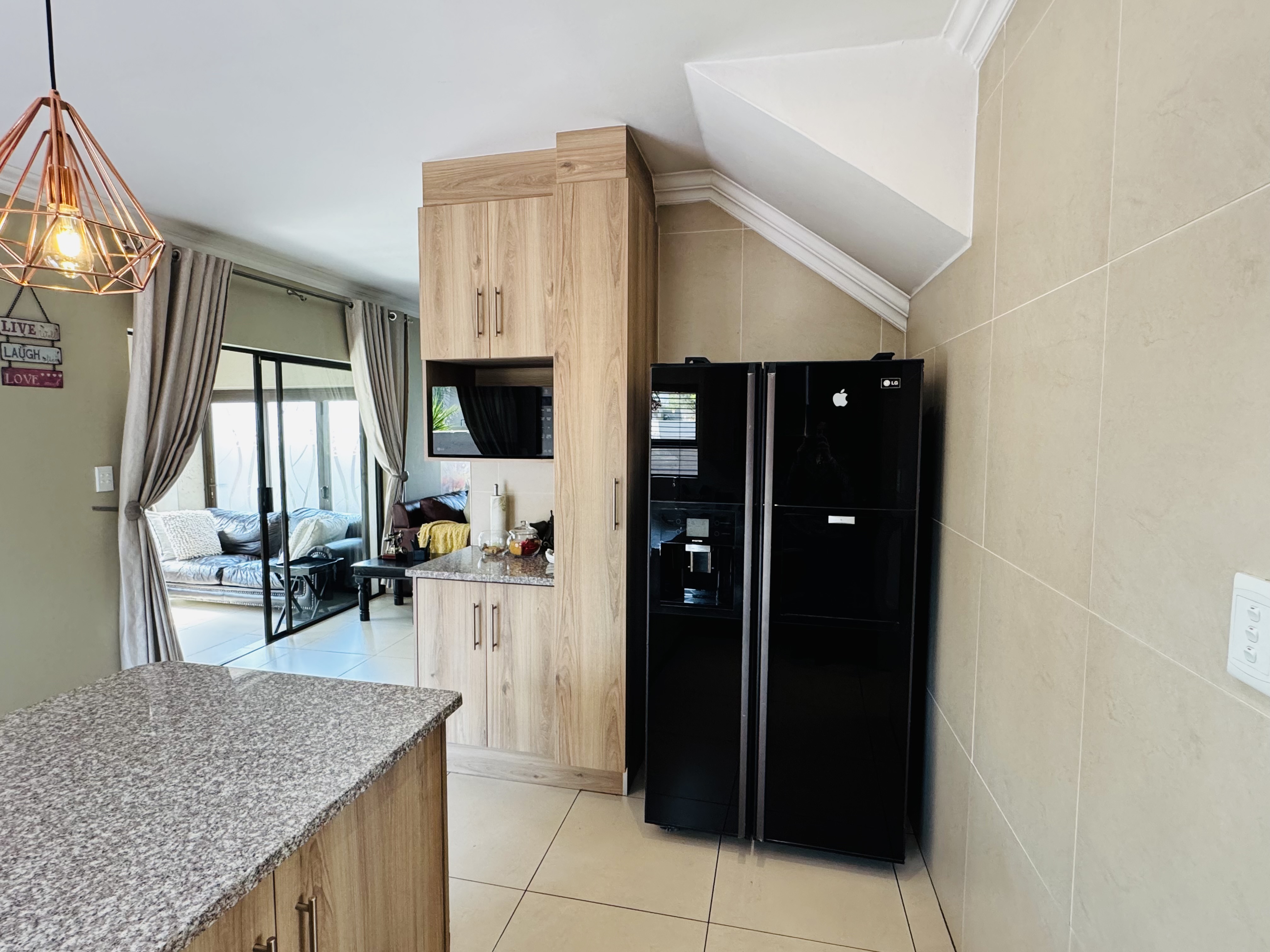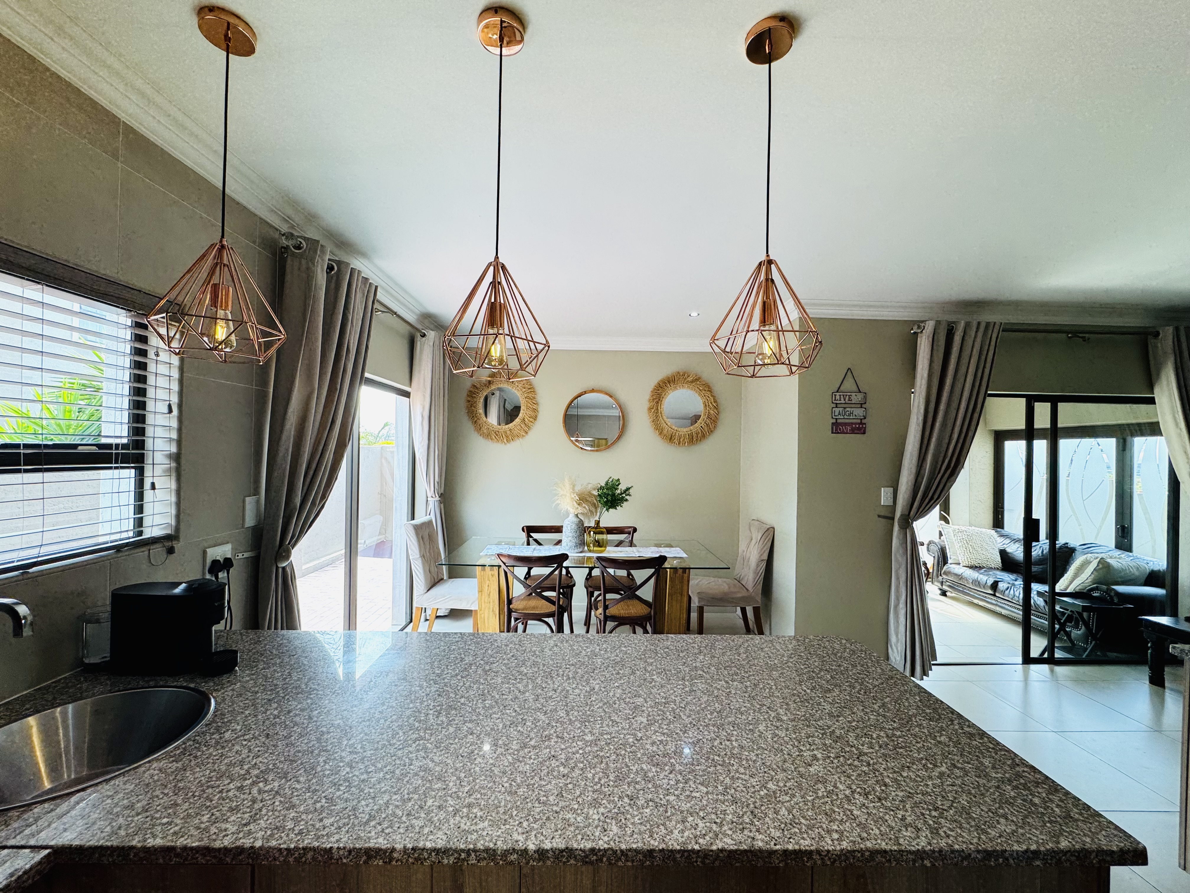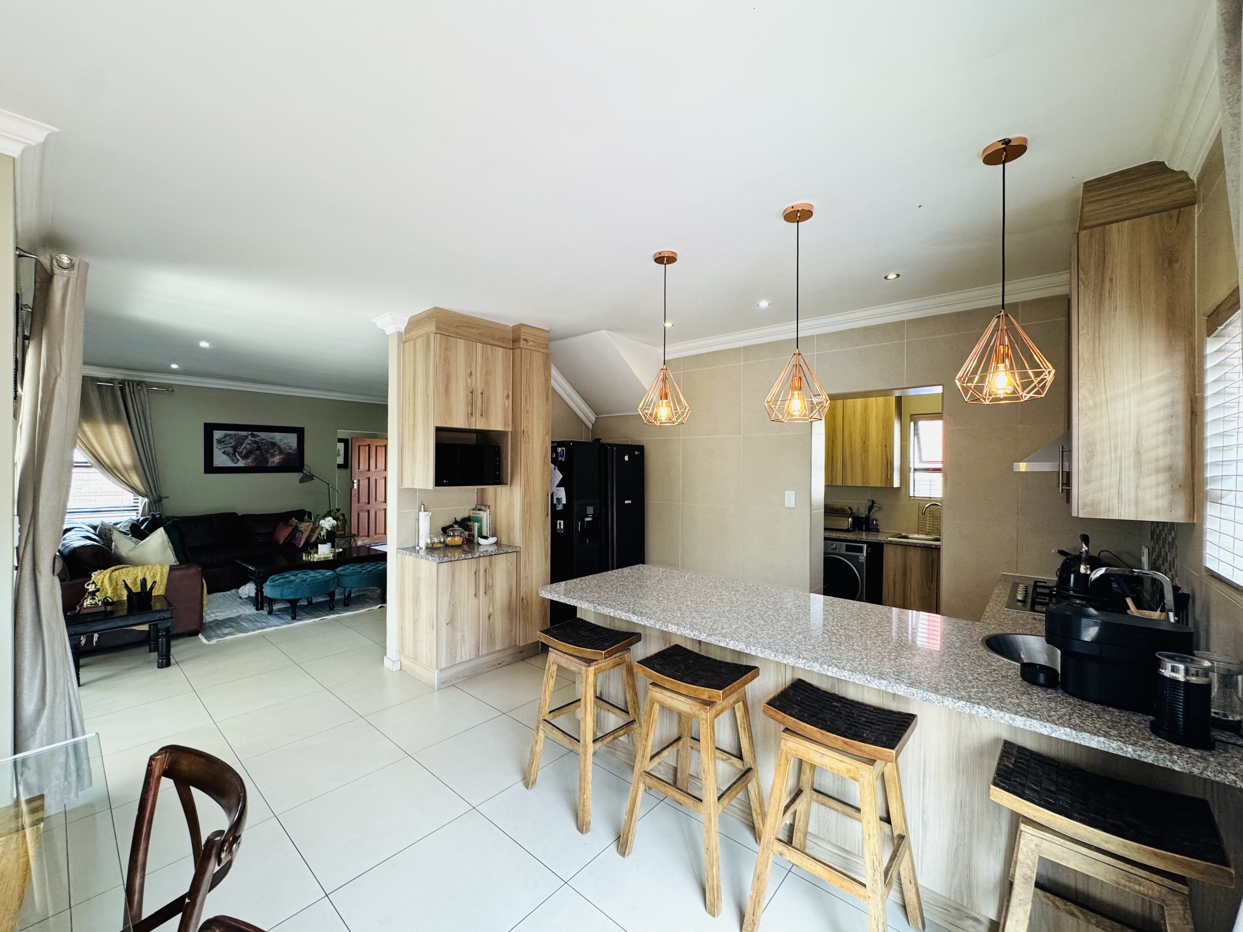The open-plan lounge, dining area, and kitchen create a seamless flow—ideal for entertaining friends or spending quality time together. The kitchen’s elegant finishes, statement lighting, and large breakfast counter make it the stylish heart of the home.