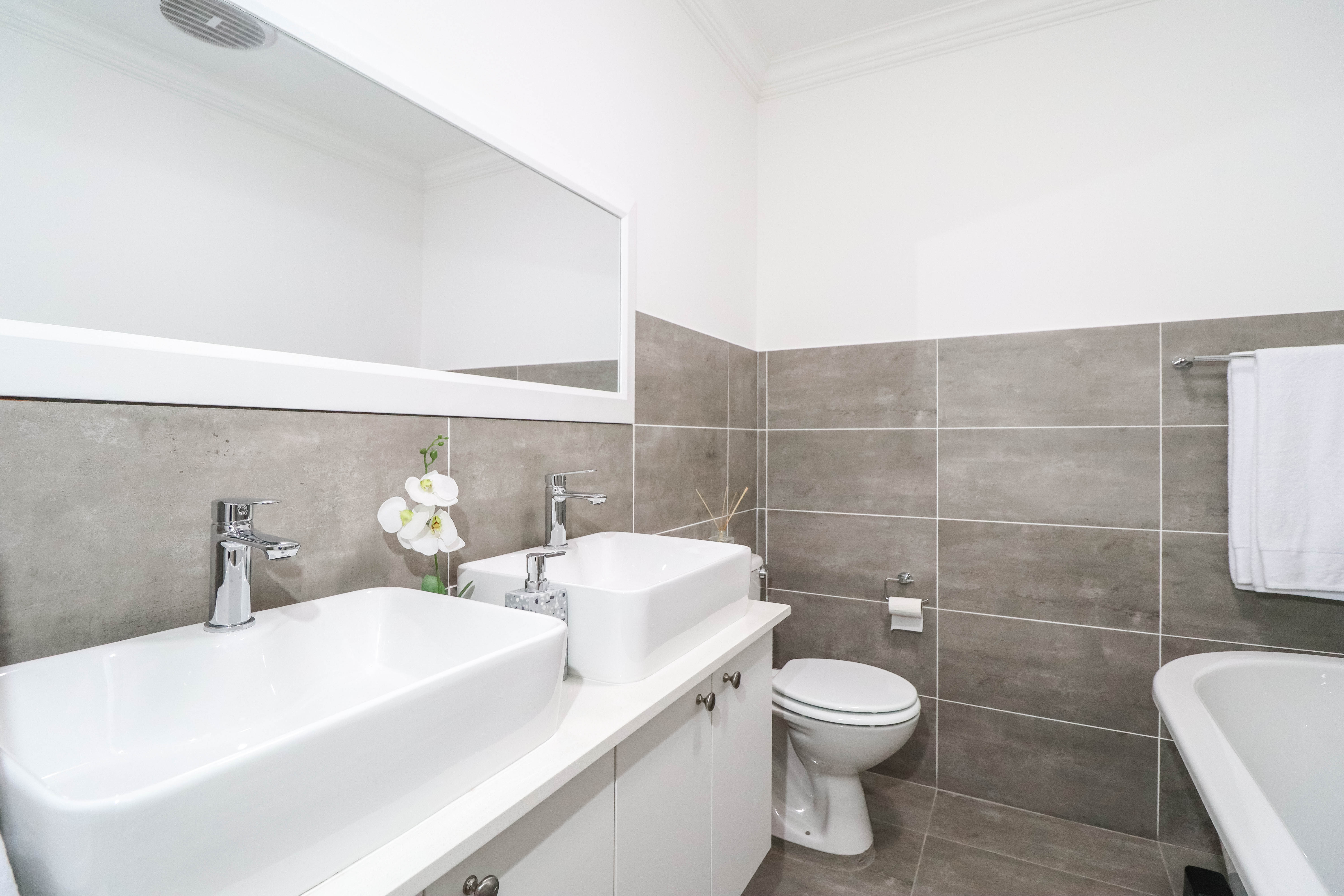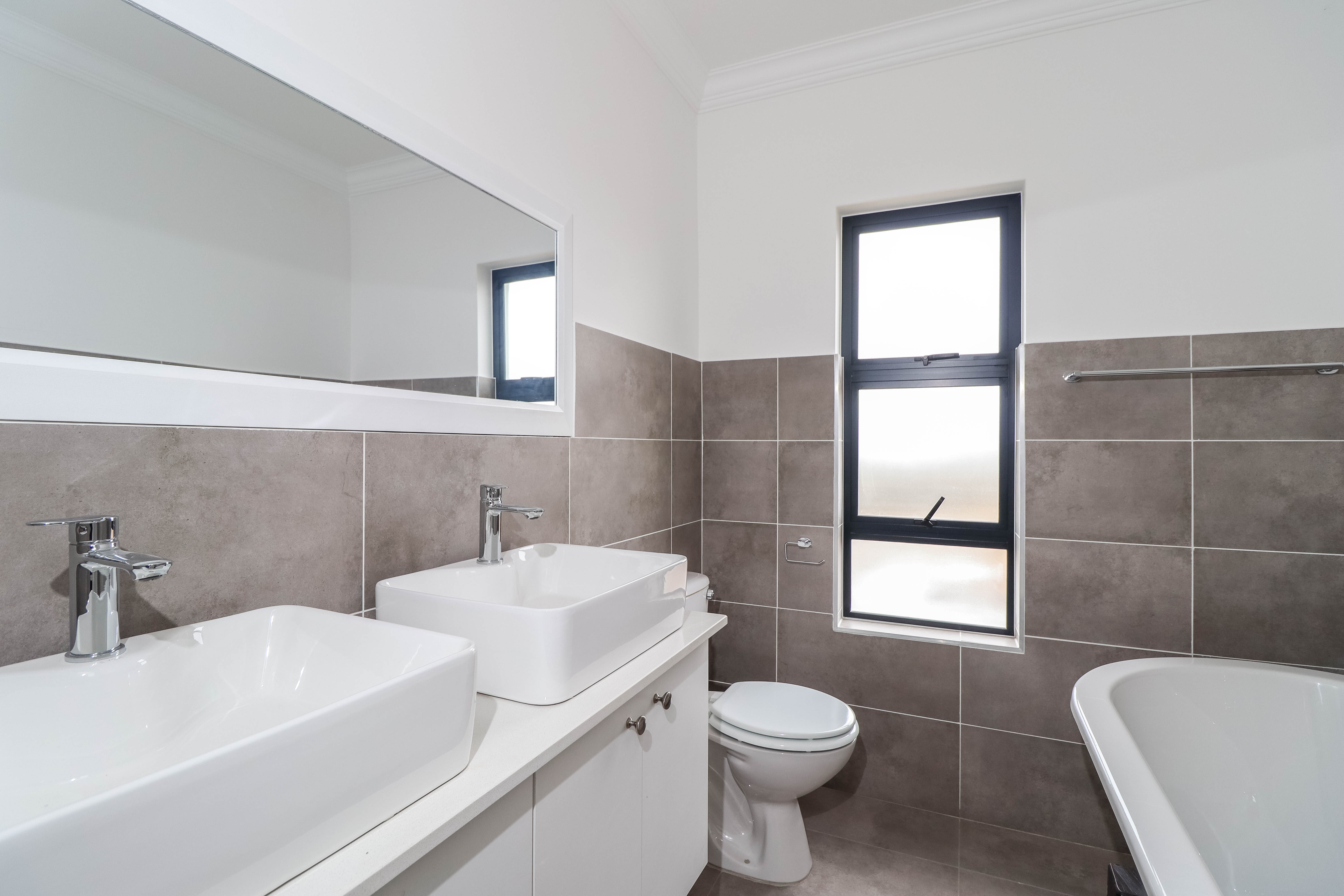 Upstairs there is a study nook, 3 bedrooms with built in cupboards and the master bedroom has an en-suite bathroom with a beautiful bath tub, his and hers basins and toilet. The family bathroom has a shower, basin and toilet.