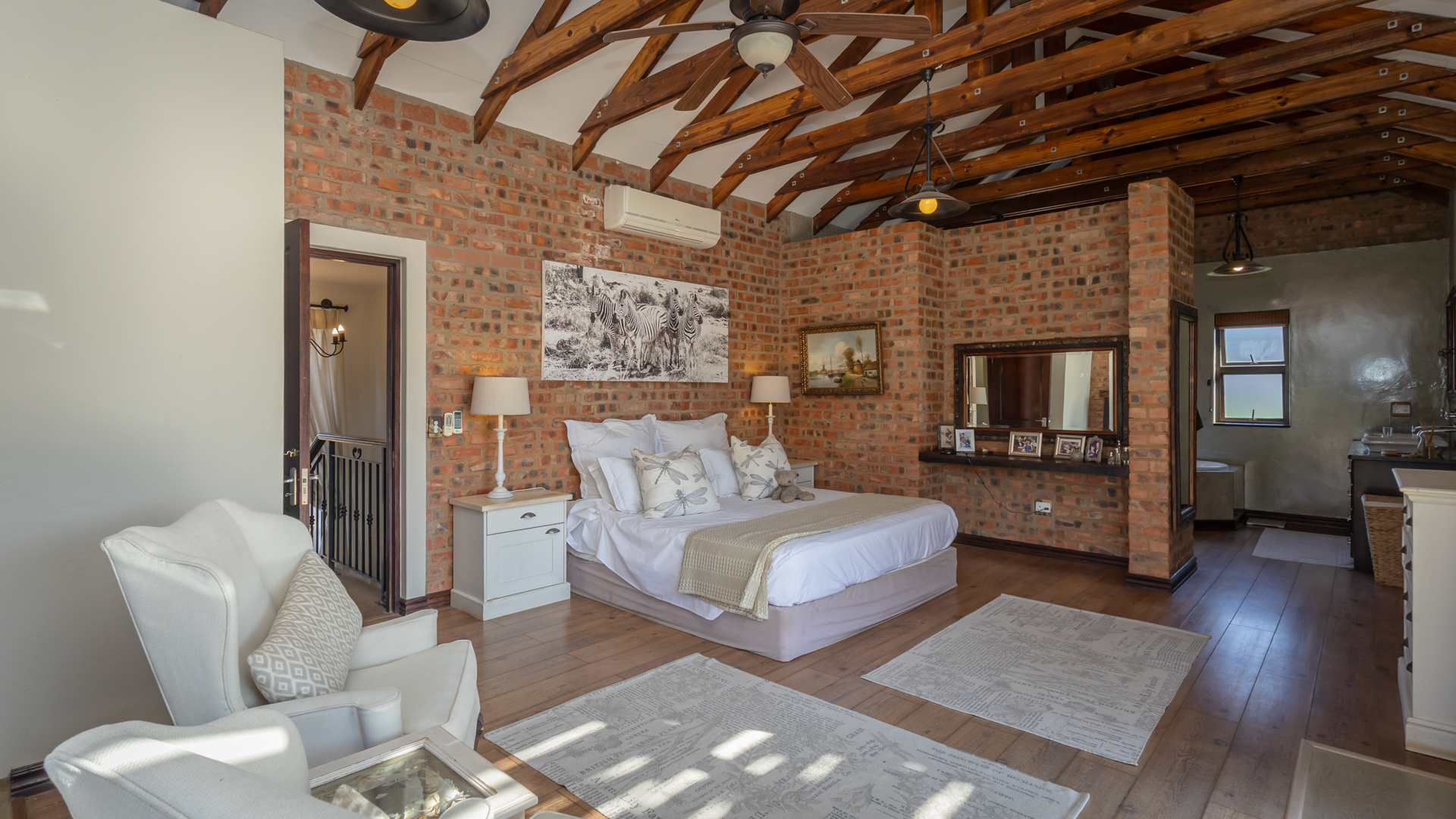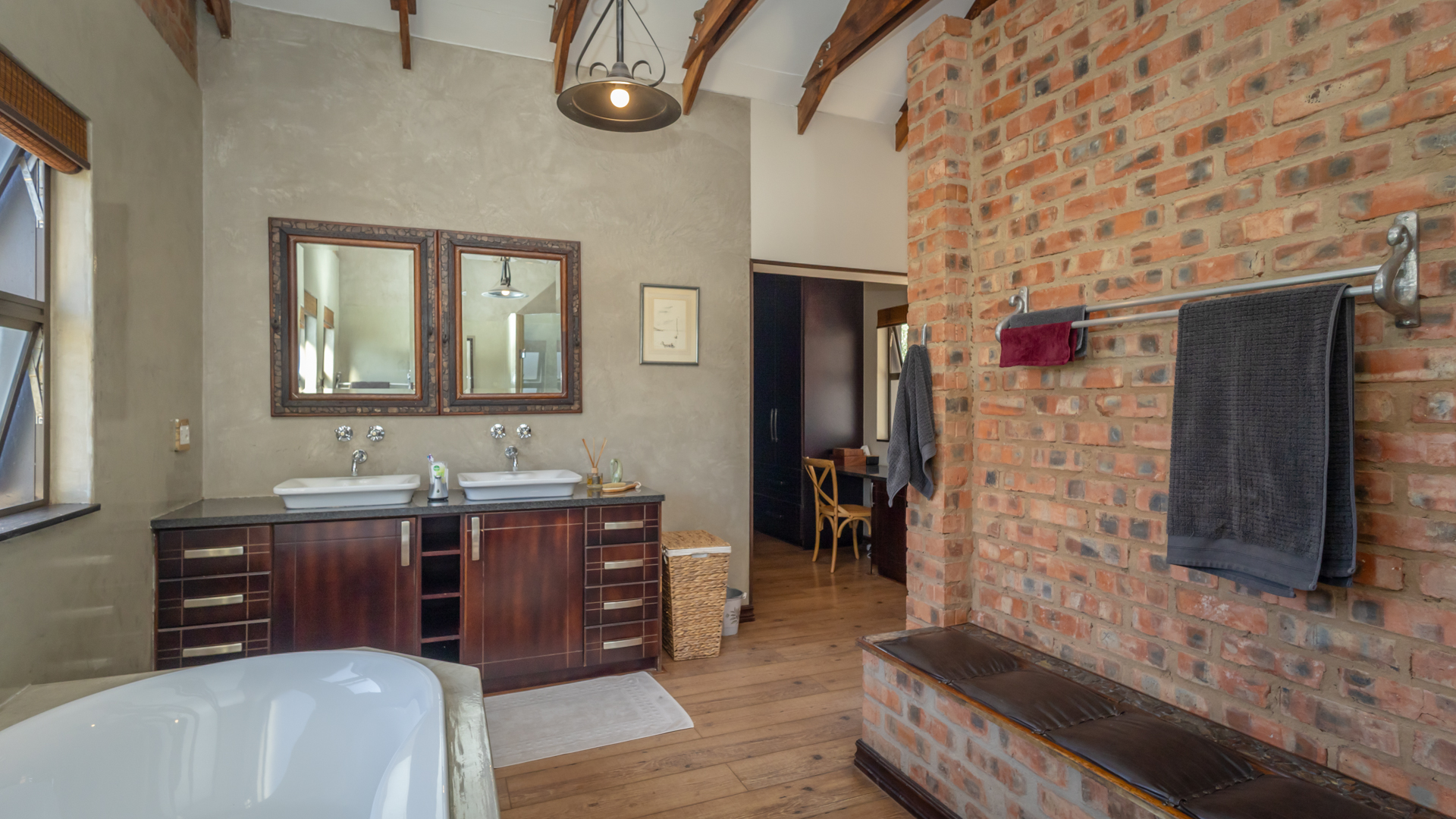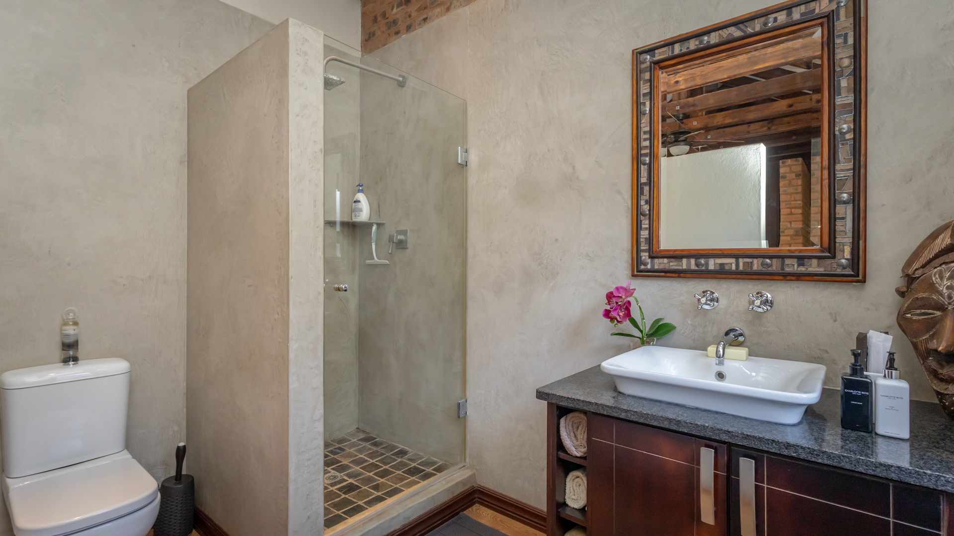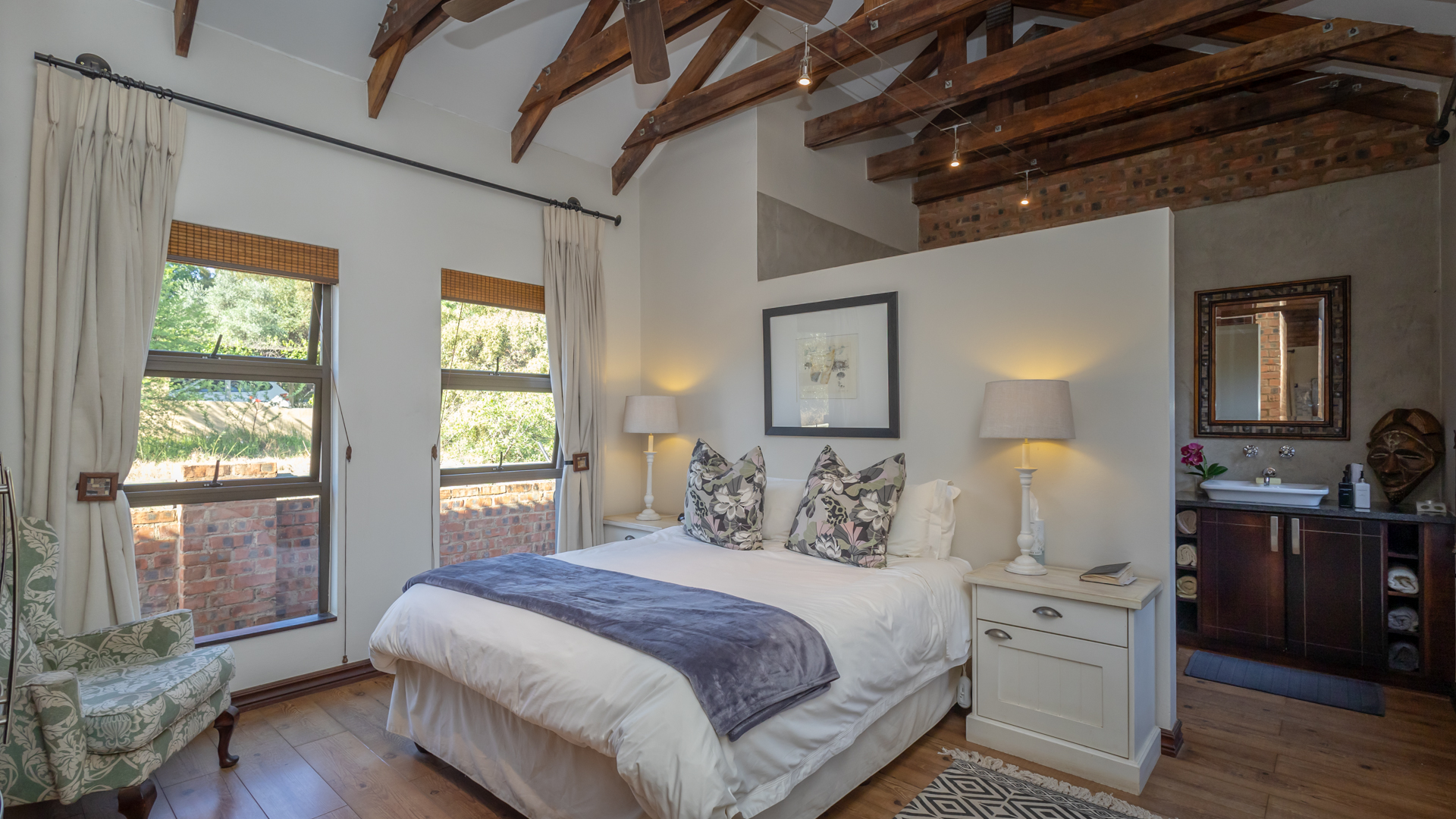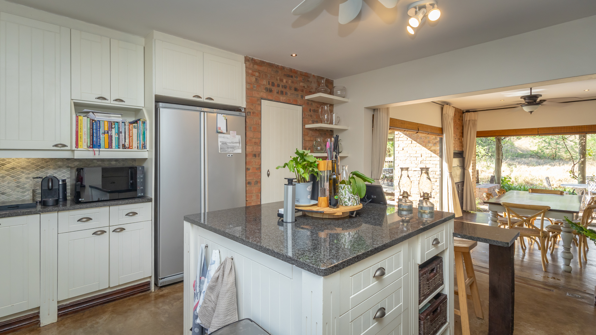 Designed for those who value privacy, nature, and refined living, the home features bright, open-plan interiors filled with natural textures and high-end finishes. The beautifully appointed kitchen is both stylish and functional—an inspiring space for any home cook. The inviting living and dining areas open effortlessly onto a covered patio through stackable sliding doors on two sides, with views of the sparkling pool, lush garden, inland Bass Dam and the majestic Magalies Mountains, it’s the perfect setting for entertaining or unwinding in serene seclusion.