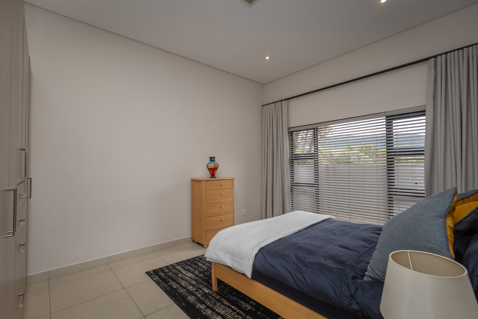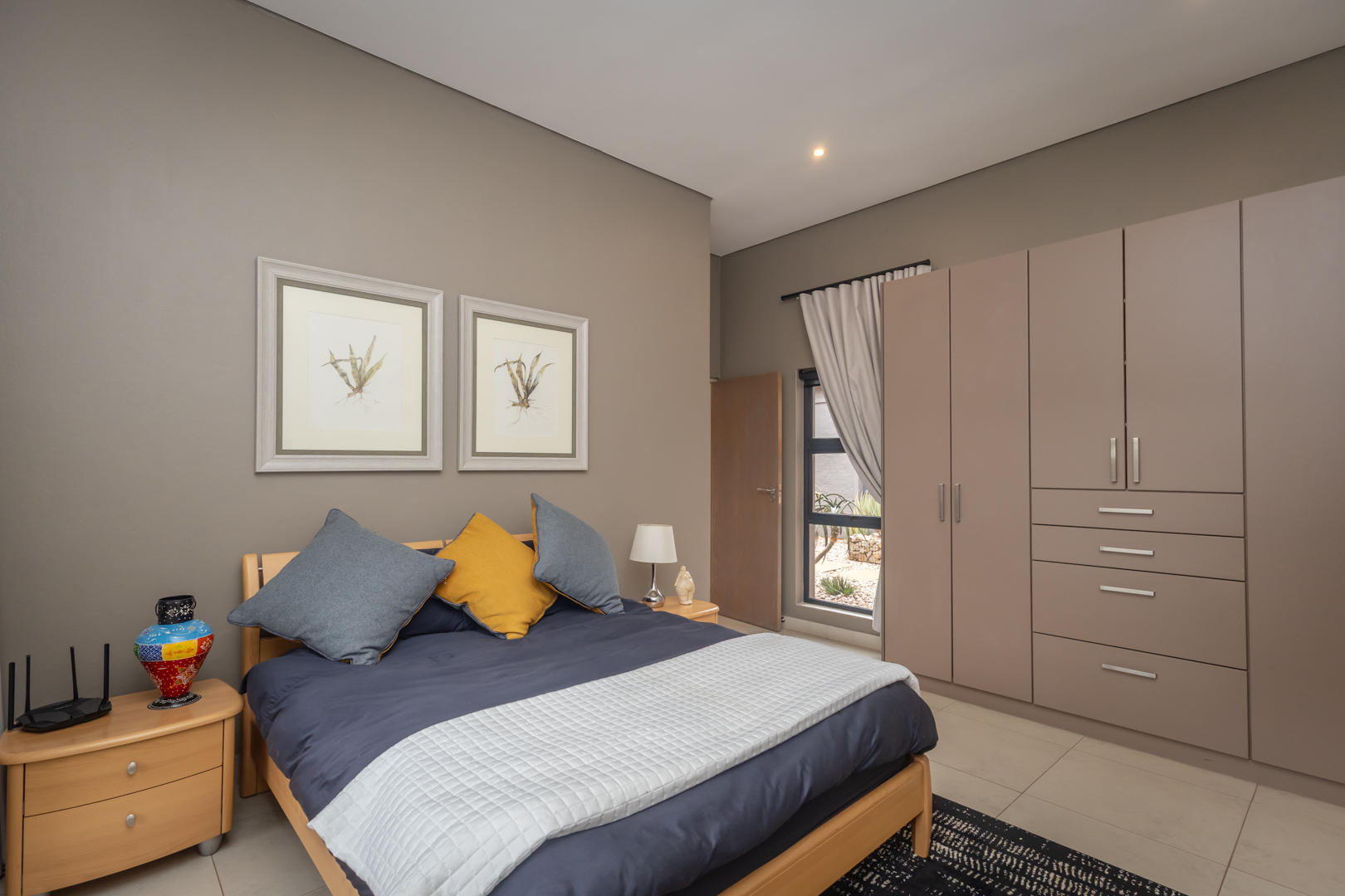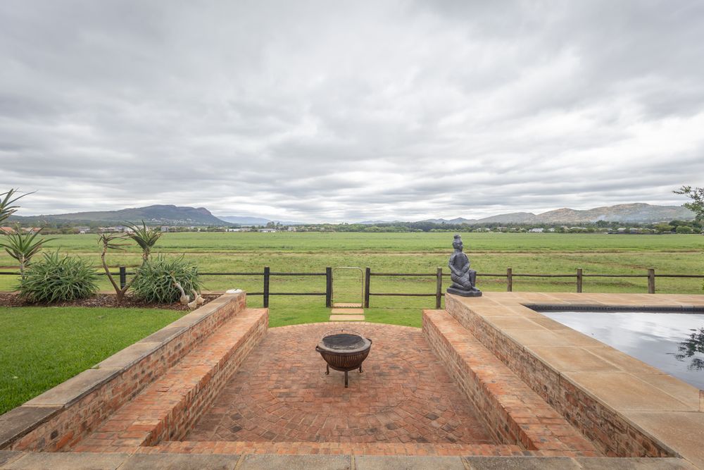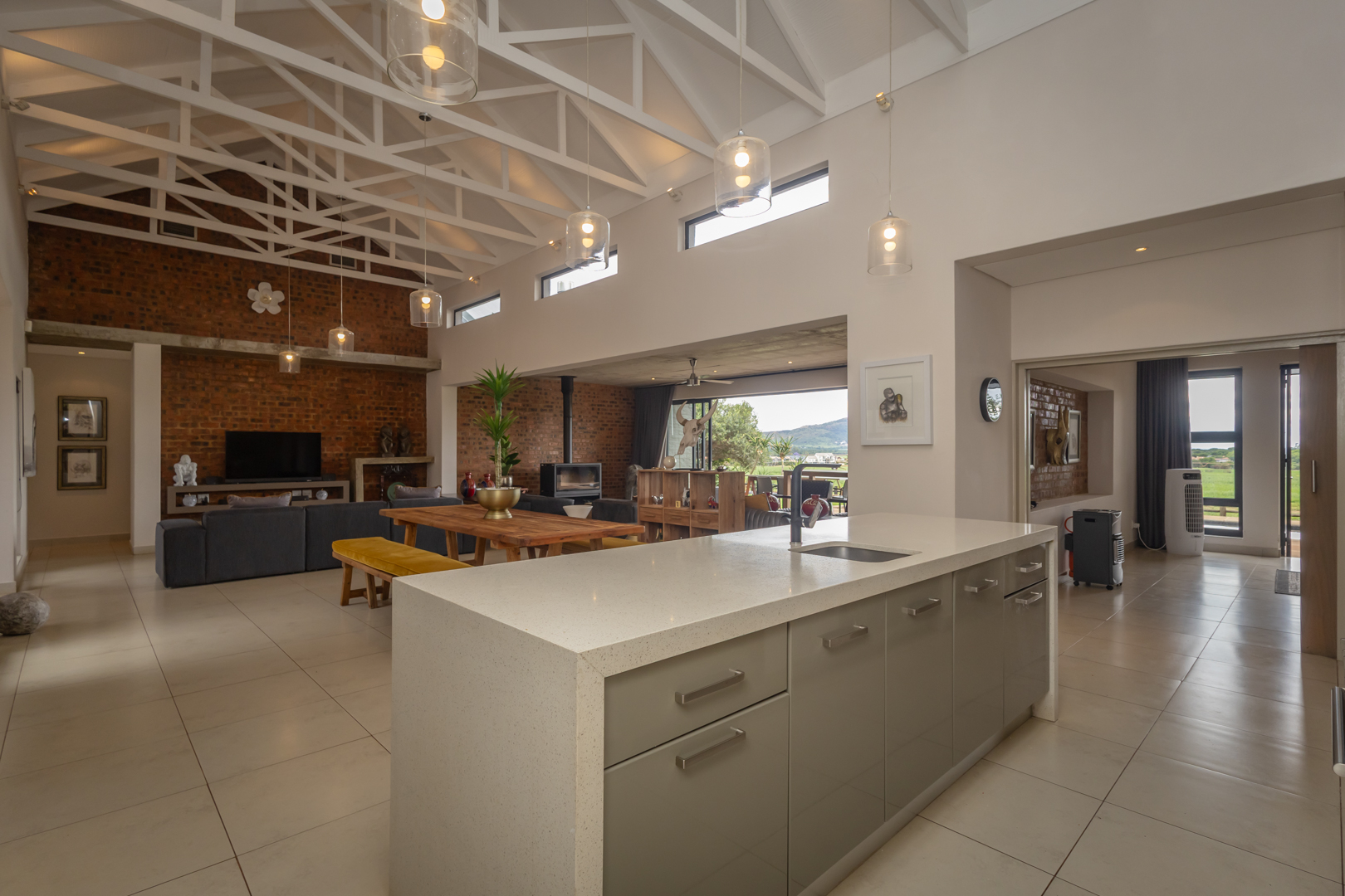 The spacious living and dining areas flow seamlessly into a stylish open-plan kitchen with generous counter space — ideal for everyday meals or hosting guests. Sliding doors open onto an impressive outdoor entertainment area complete with a boma, built-in gas braai, and sparkling swimming pool, all overlooking tranquil mountain vistas. The beautifully landscaped, water-wise garden ensures easy maintenance and sustainability throughout the seasons.