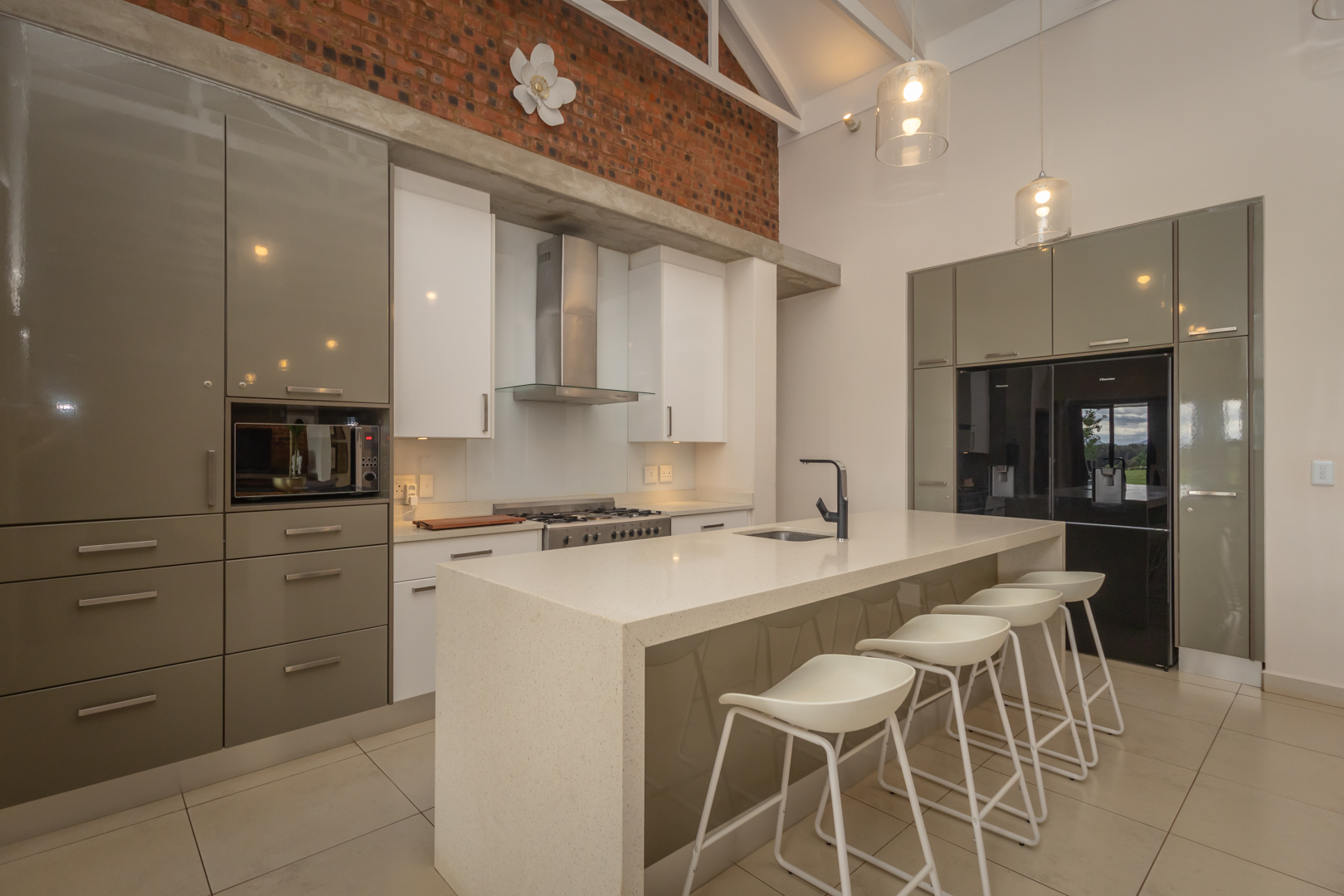 This modern masterpiece perfectly balances luxury, comfort, and contemporary design. Ideal for both entertaining and relaxed family living, it features expansive open-plan living areas enhanced by double-volume ceilings and sleek concrete finishes. Large windows and glass doors flood the interior with natural light while showcasing breathtaking views of the pivot fields and the majestic Magalies Mountains.