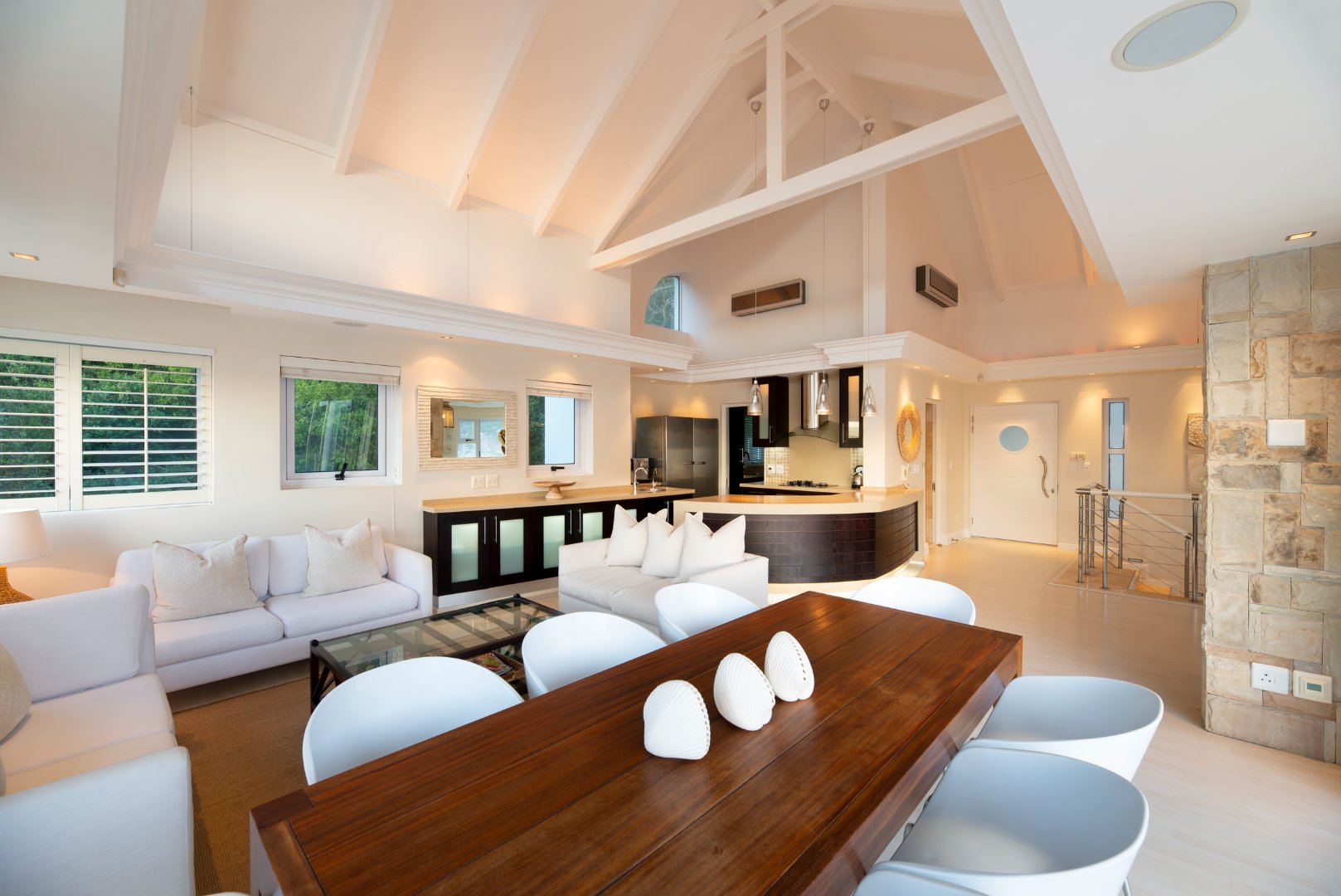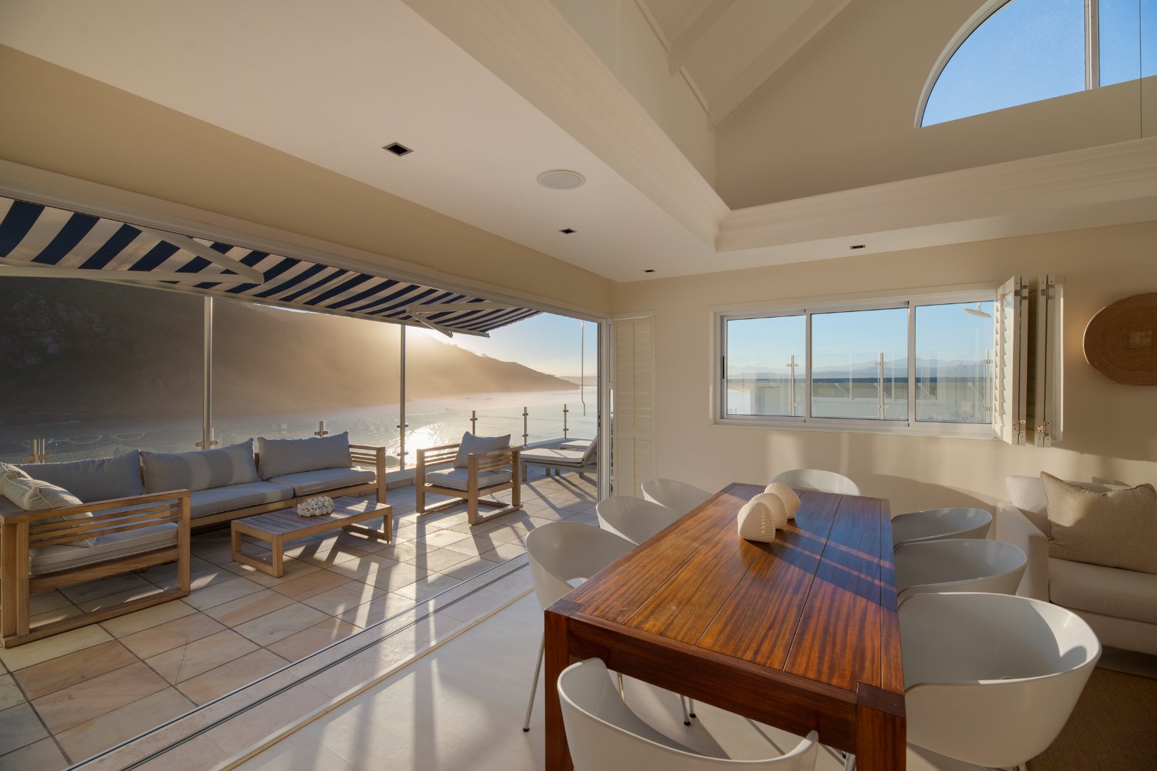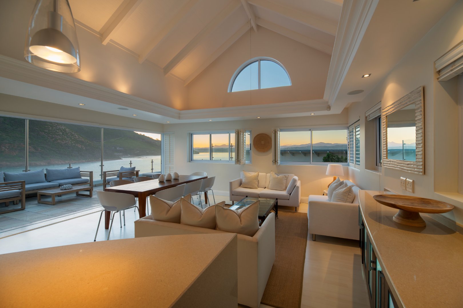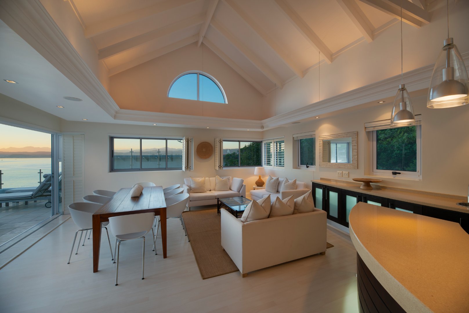Distinguished, clean-cut minimalist style, designed with a sequence of aluminium & glass to bring in natural light and to captivate the beautiful views and spectacular sunsets from this prime location. The expansive continuum carries the eye from the rocky white waved ocean 180 degrees across to the calm blue-green lagoon vistas.