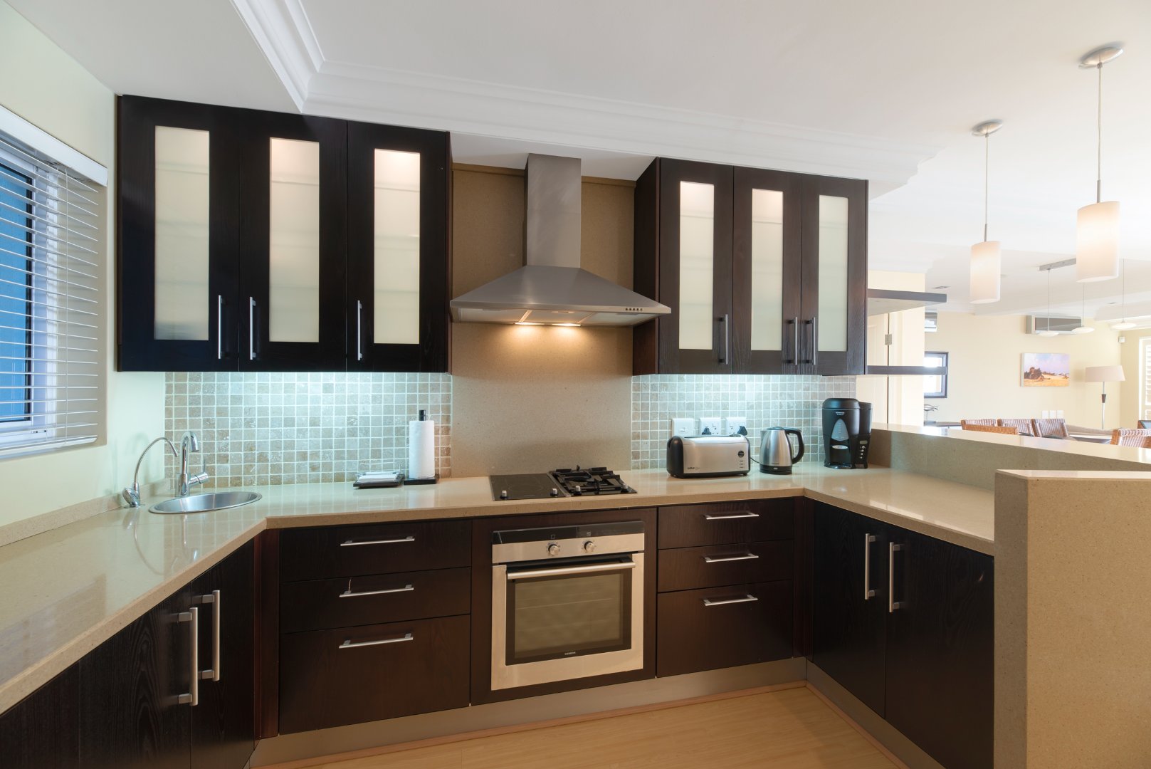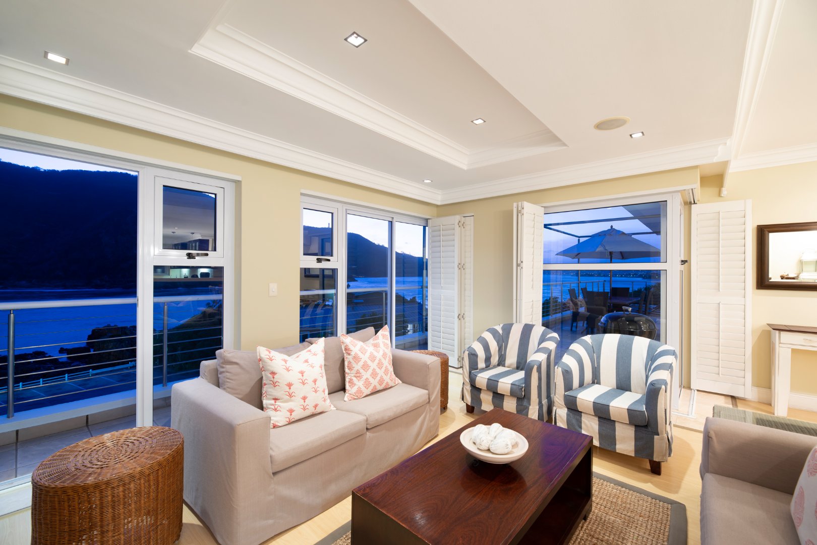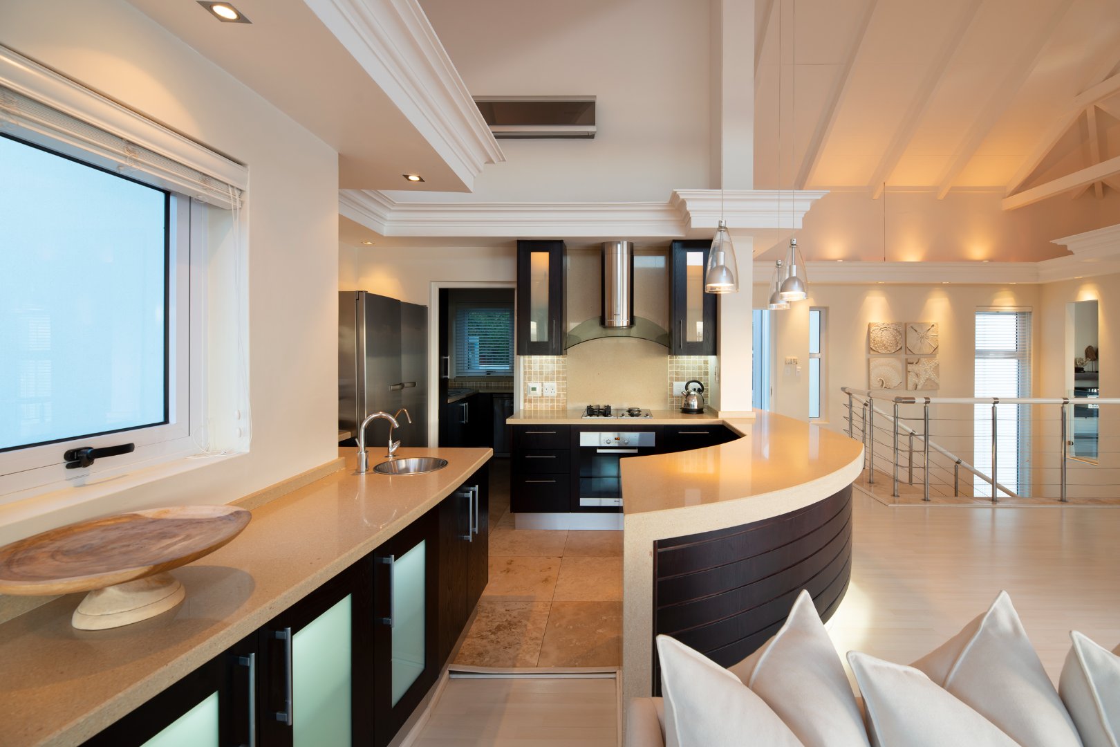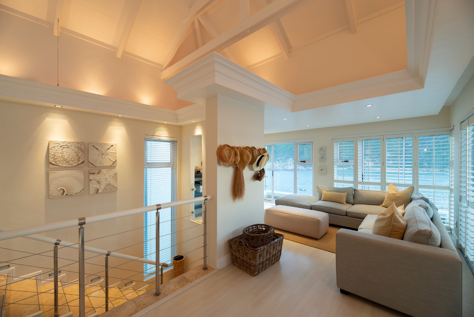 Distinguished, clean-cut minimalist style, designed with a sequence of aluminium & glass to bring in natural light and to captivate the beautiful views and spectacular sunsets from this prime location. The expansive continuum carries the eye from the rocky white waved ocean 180 degrees across to the calm blue-green lagoon vistas.