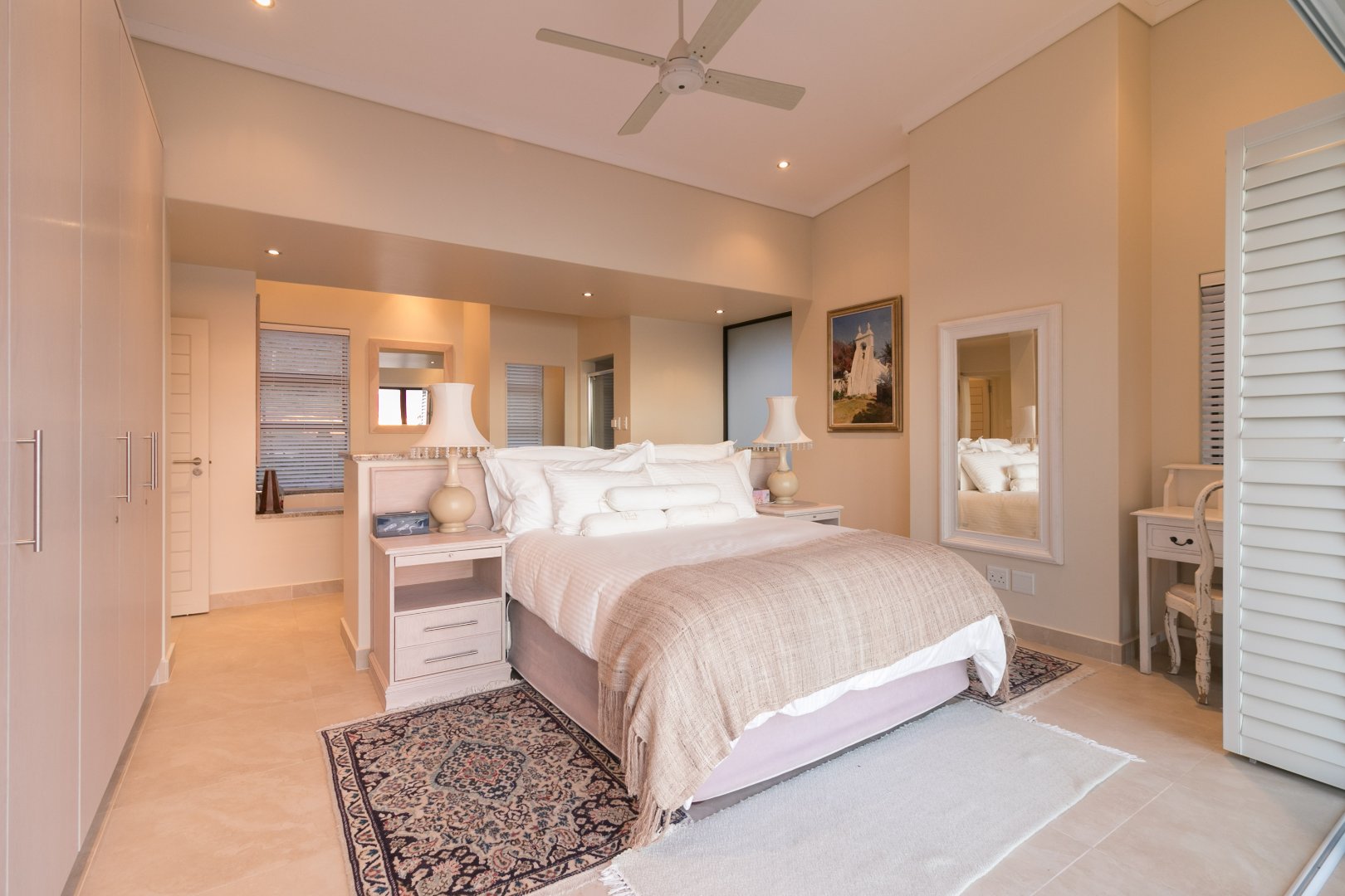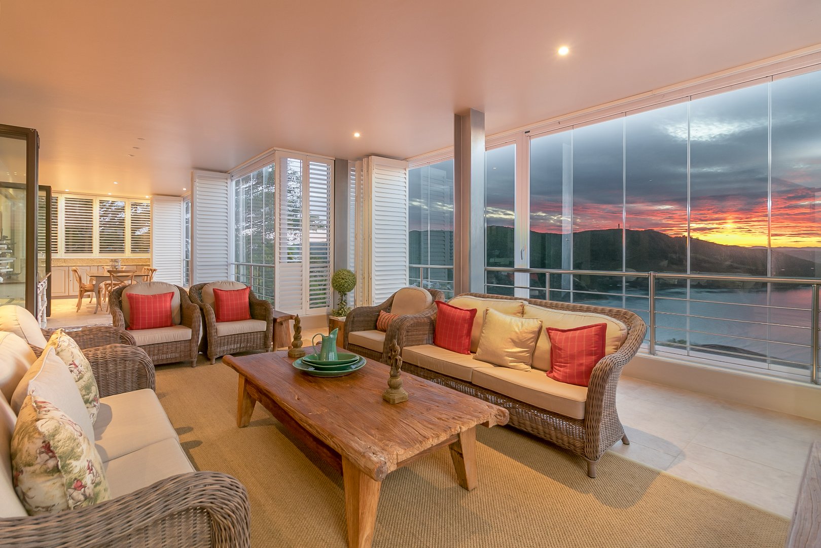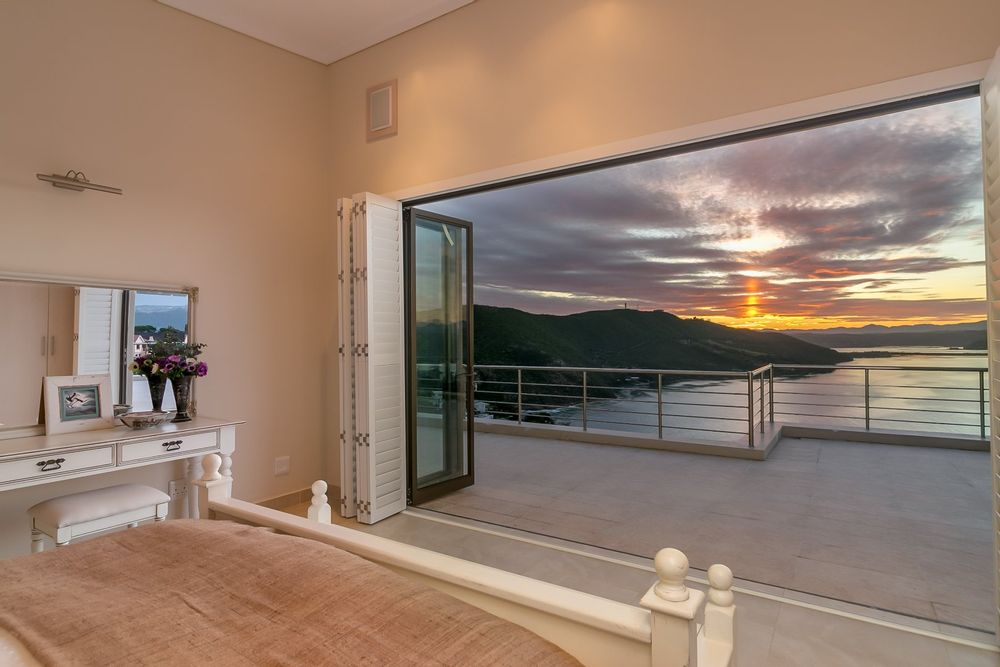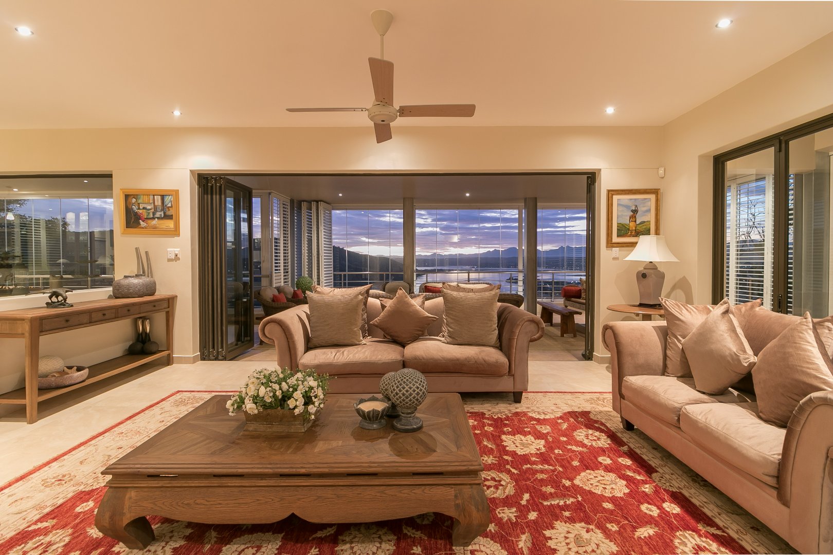 An expansive enclosed conservatory-patio with plantation shutters spans the front of the house which pours over the lagoon’s waterway panorama across to the Outeniqua mountains beyond. The house frames winter sunsets which often explode with fiery colours, always adding warmth into the home for the night.